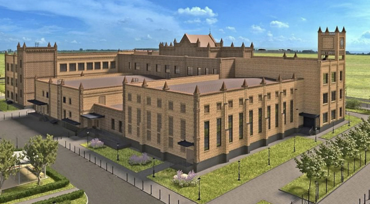 Здание будет украшено витражами, стрельчатыми окнами и угловой башней с часами. Для его облицовки будут использоваться кирпич нескольких цветов и искусственный камень.