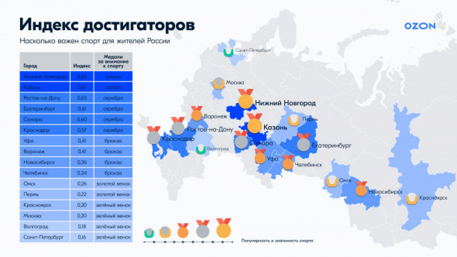 Еще один показатель, который вычислялся в ходе исследования, — «Индекс достигаторов». Он определяет важность спорта для жителей региона. В лидерах снова Нижний Новгород (0,68), Казань (0,67) и Ростов-на-Дону (0,63). В аутсайдерах — Москва (0,20), Волгоград (0,18) и Санкт-Петербург (0,16).
