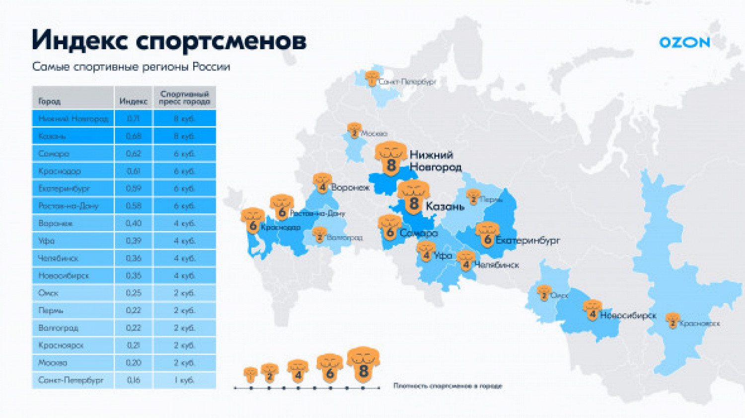 Первое место занял Нижний Новгород: у него индекс спортсменов оказался равен 0,71. За ним идут Казань (0,68) и Самара (0,62). Москва и Петербург получили наименьший результат — 0,20 и 0,16 соответственно.
