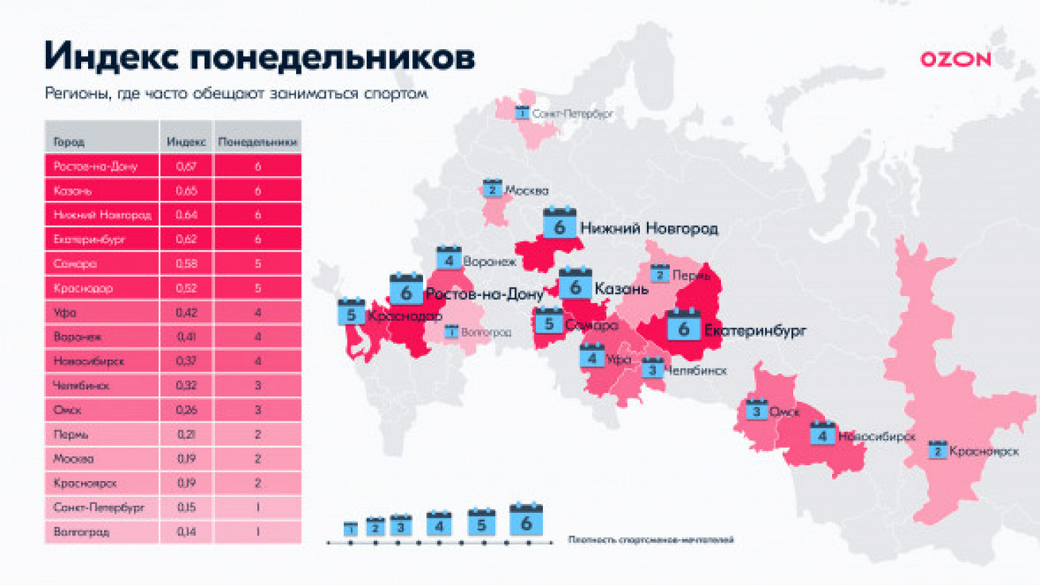 Также исследователи выяснили, жители каких регионов чаще других обещают себе начать заниматься спортом с понедельника, но не делают этого. В этом рейтинге первое место занял Ростов-на-Дону (0,67), в тройку лидеров также вошли Казань (0,65) и Нижний Новгород (0,64). Наименьший показатель — у Санкт-Петербурга (0,15) и Волгограда (0,14).