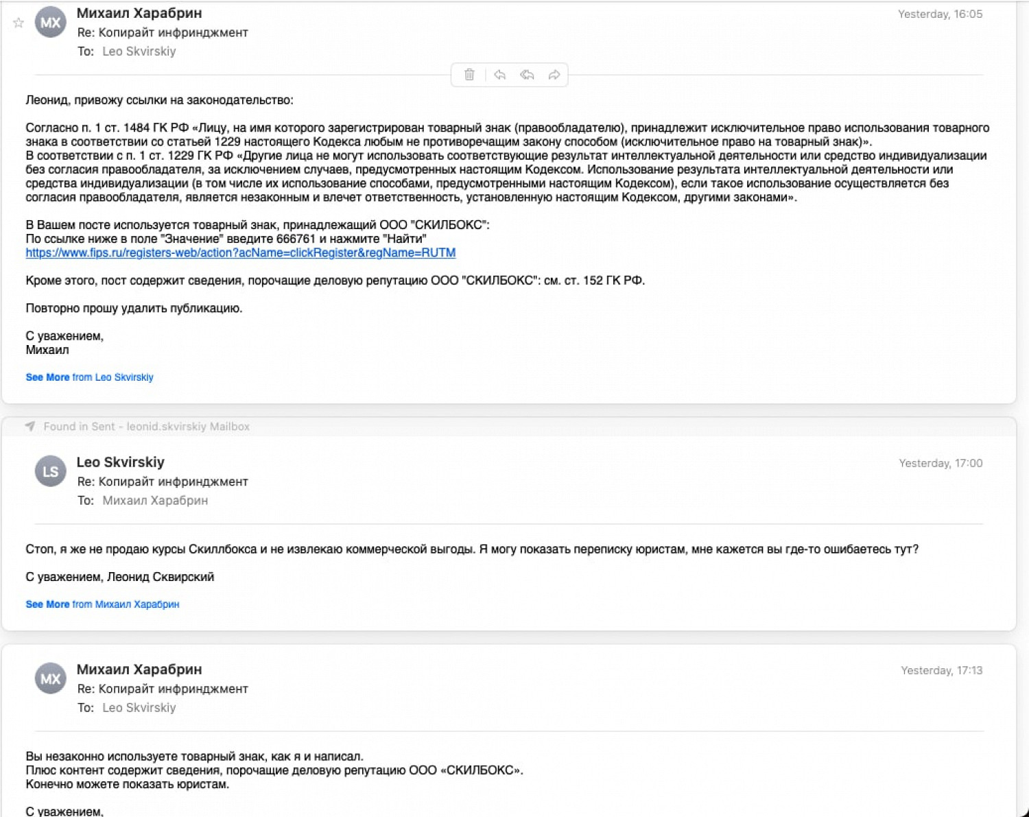 В переписке сотрудник Skillbox вновь потребовал от блогера удалить картинку, сославшись на статьи ГК РФ о незаконном использовании товарного знака. Кроме того, он подчеркнул, что контент содержит сведения, порочащие репутацию ООО «Скилбокс».