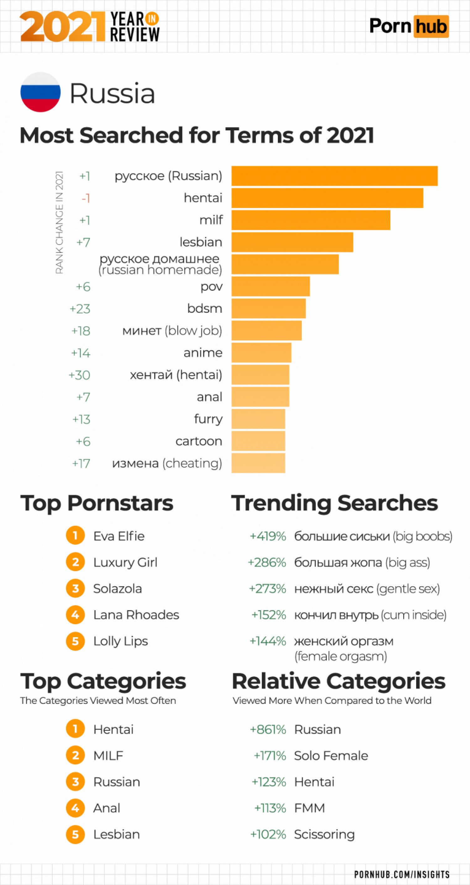 В России самым популярным запросом в 2021-м стал «русское» на кириллице. Следом идут «хентай» и «milf». Сильнее всего популярность увеличилась у «бдсм» (+23 строчки), «аниме» (+14) и «фурри» (это антропоморфные животные, обычно из мультфильмов).