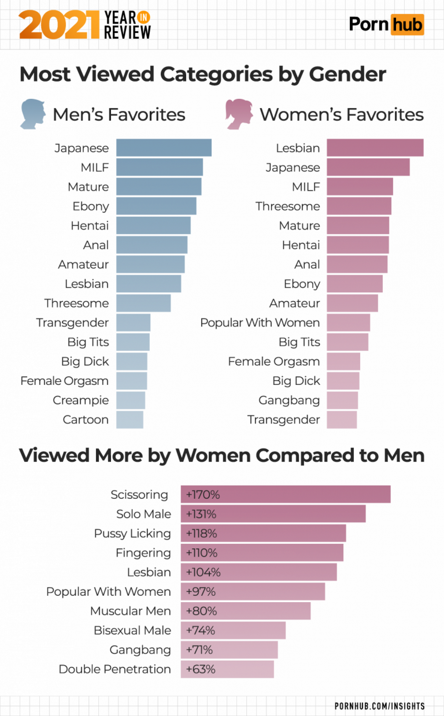 Предпочтения по самым популярным категориям между полами незначительны. И там и там в топе «японское», «milf», «mature» и «хентай». Правда, женщины немного чаще ищут порно с лесбиянками и сексом втроем, а мужчины — с темнокожими и трансгендерами.