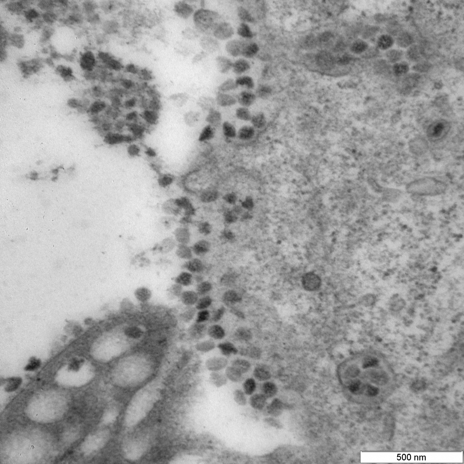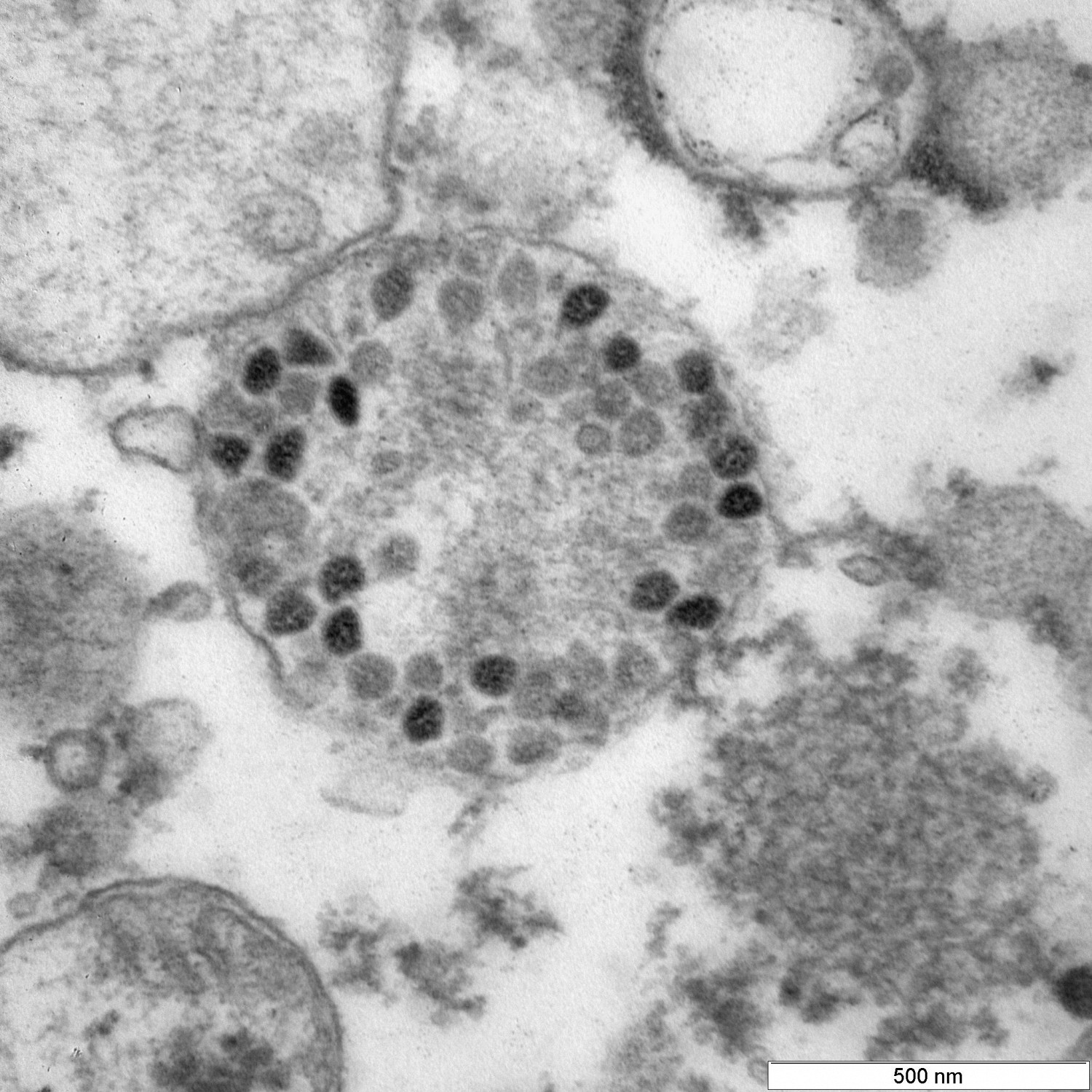 Ведомство отмечает, что на снимке изображены везикулярные пузырьки, которые представляют собой расширенные канальцы внутриклеточной сети. При ее участии происходит синтез и транспорт белков, липидов и других жизненно необходимых для клетки веществ. Белки, из которых состоит вирус, синтезируются в цитоплазме. Они скапливаются у поверхности пузырьков и проникают внутрь, приобретая дополнительную оболочку.