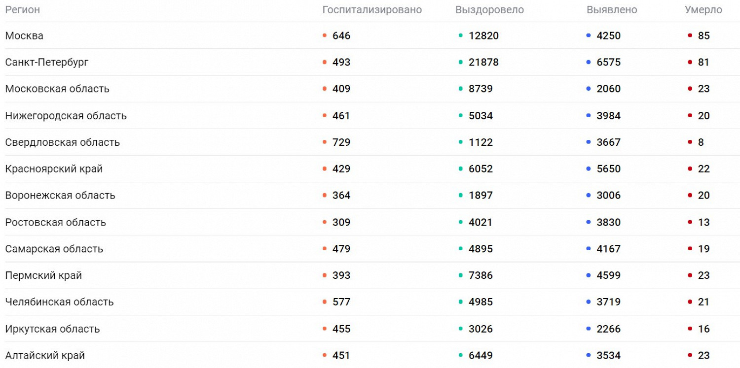 На первом месте по числу заражений находится Петербург — 6575 случаев. Следом идут Красноярский край, Новосибирская область, Пермский край, Башкортостан, Москва, Самарская, Нижегородская, Ростовская, Челябинская и Свердловская области.