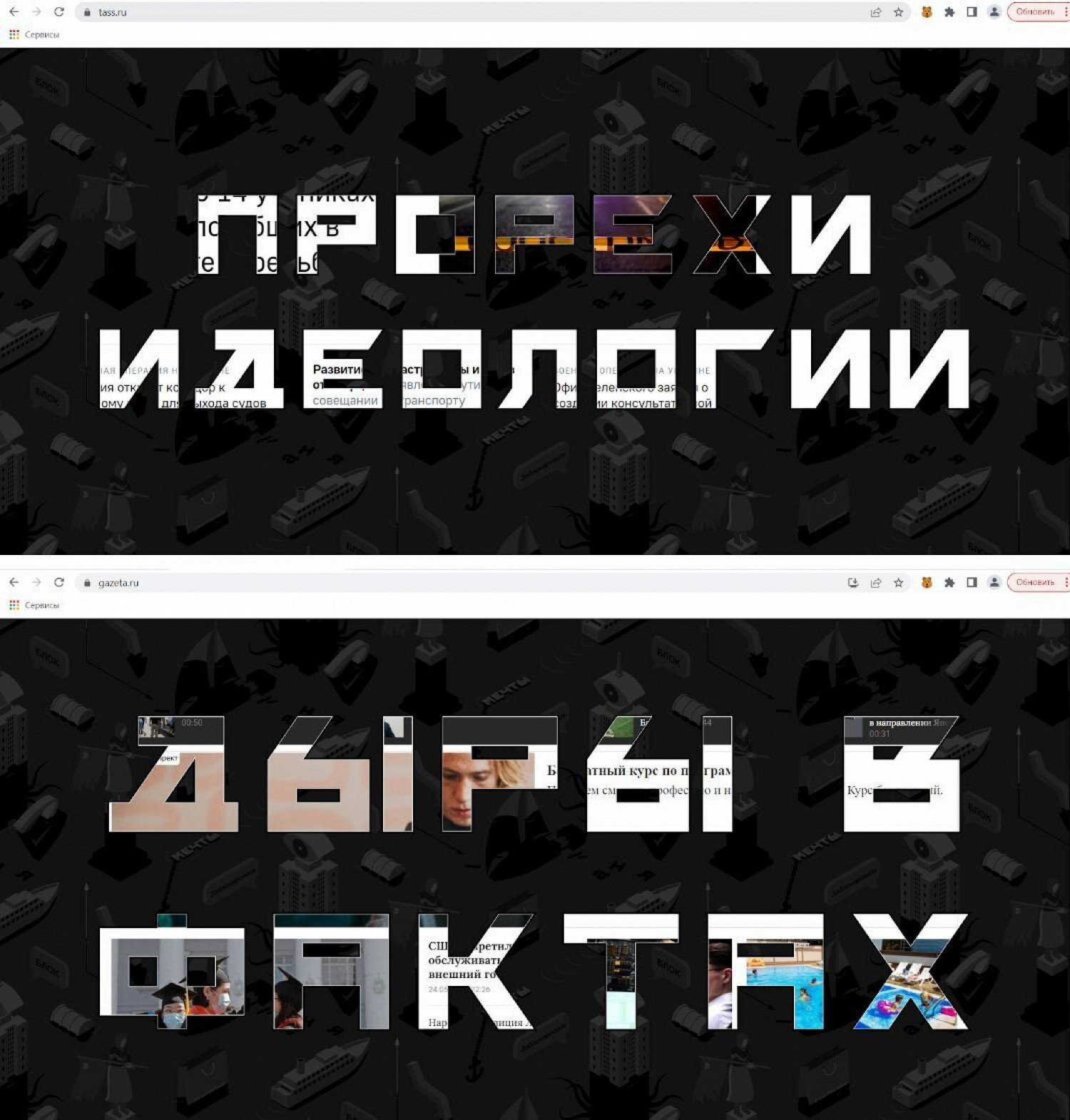 Авторы проекта называют его «родительским контролем над пропагандой». Заглушки выглядят как картинки с надписями вроде «Прорехи идеологии» и «Дыры в фактах».