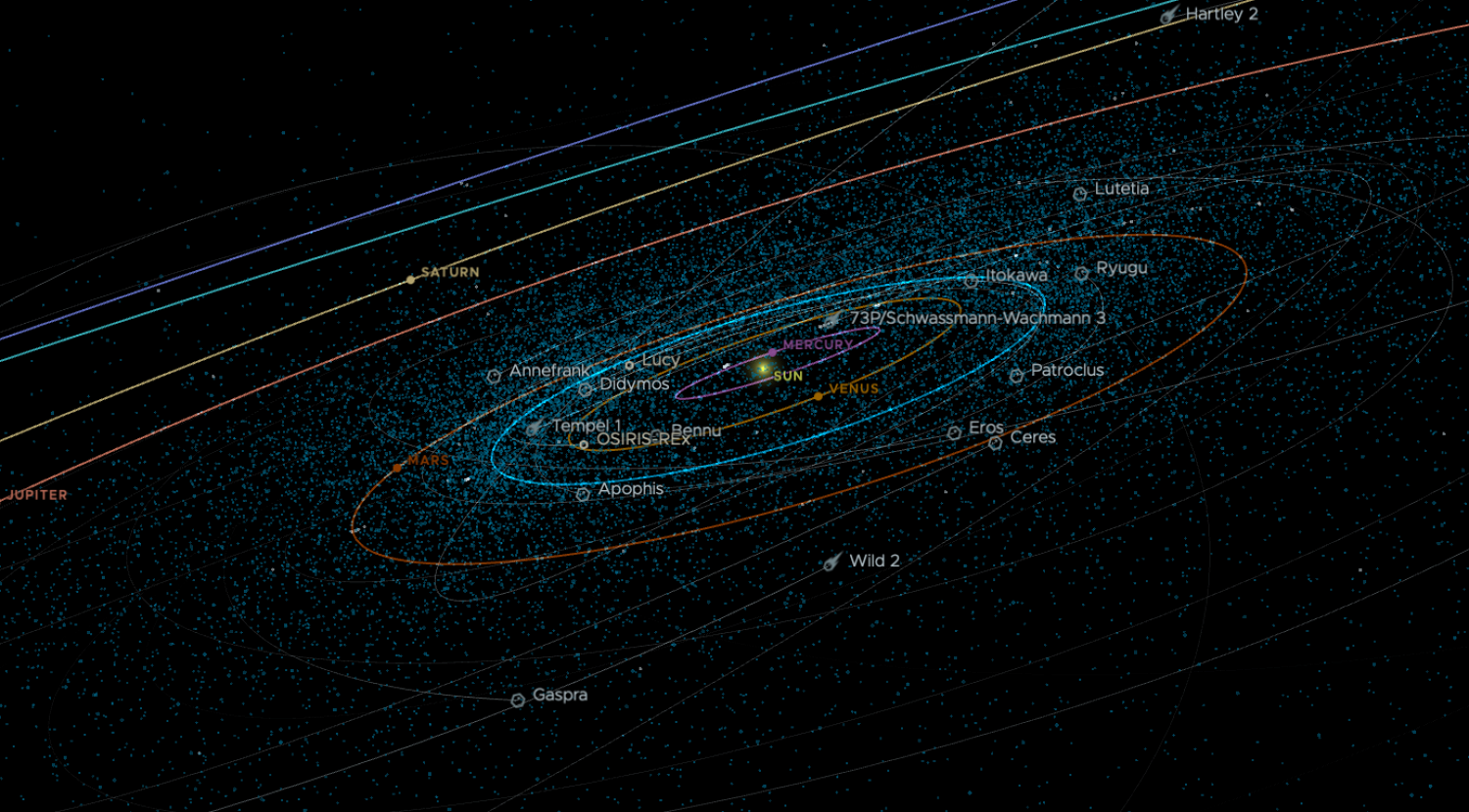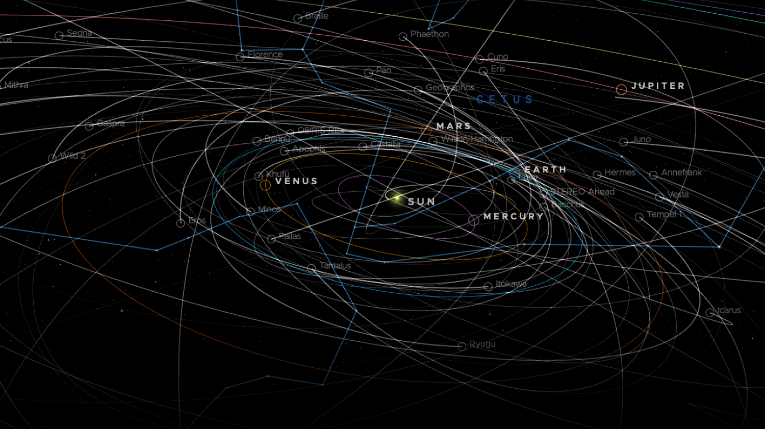 Для малых тел показаны их траектории, а также указаны краткая история обнаружения, связанные с каждым из астероидов открытия и их возможное значение в разгадках космических тайн.