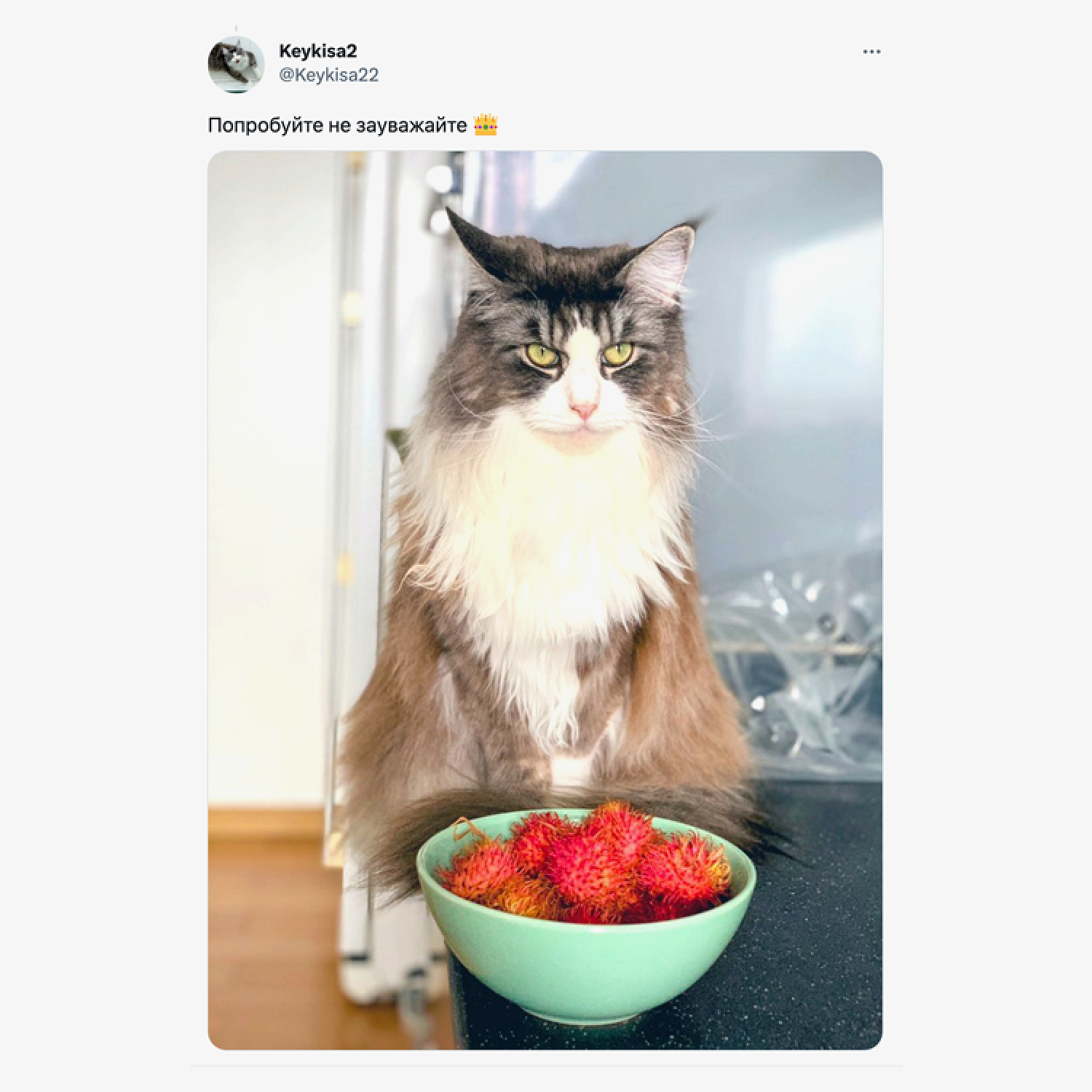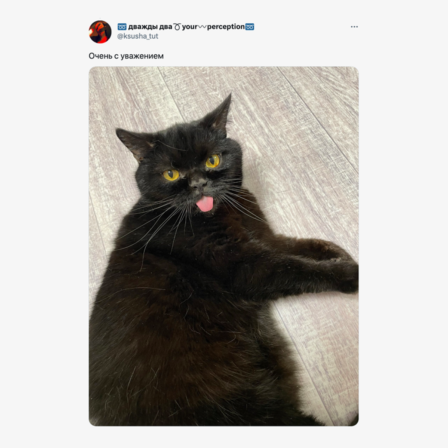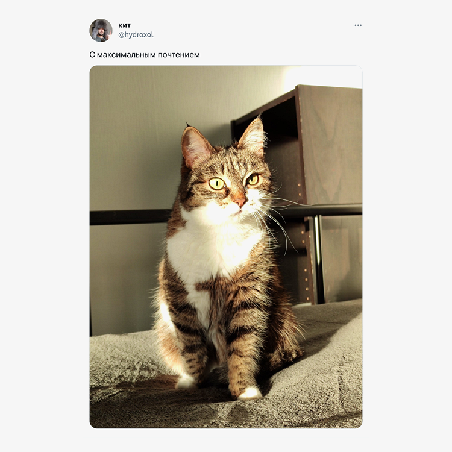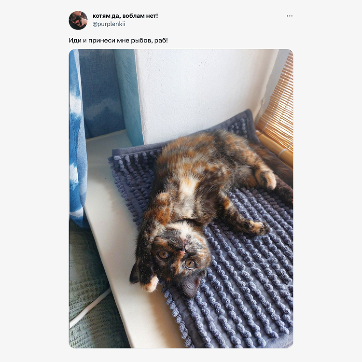 @memesmymemes предложил другим пользователям скинуть в реплаи своих котов и кошек — но, конечно, «делать это с уважением». Комментаторы делятся кадрами питомцев, и судя по мордочкам многих, к ним без уважения лучше даже не подступаться. «Иди принеси мне рыбов, раб!» — представляет речь своего пушистого компаньона @purplenkii.