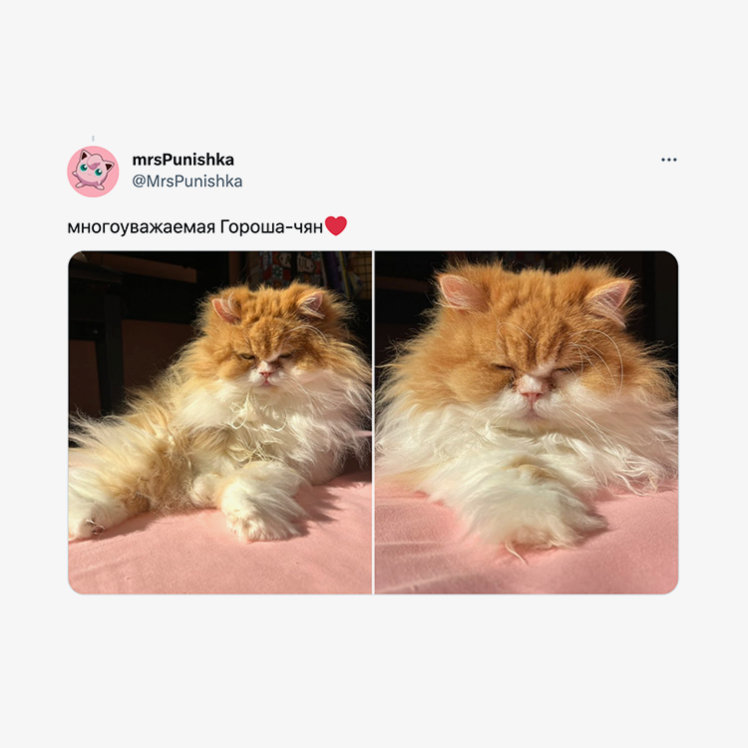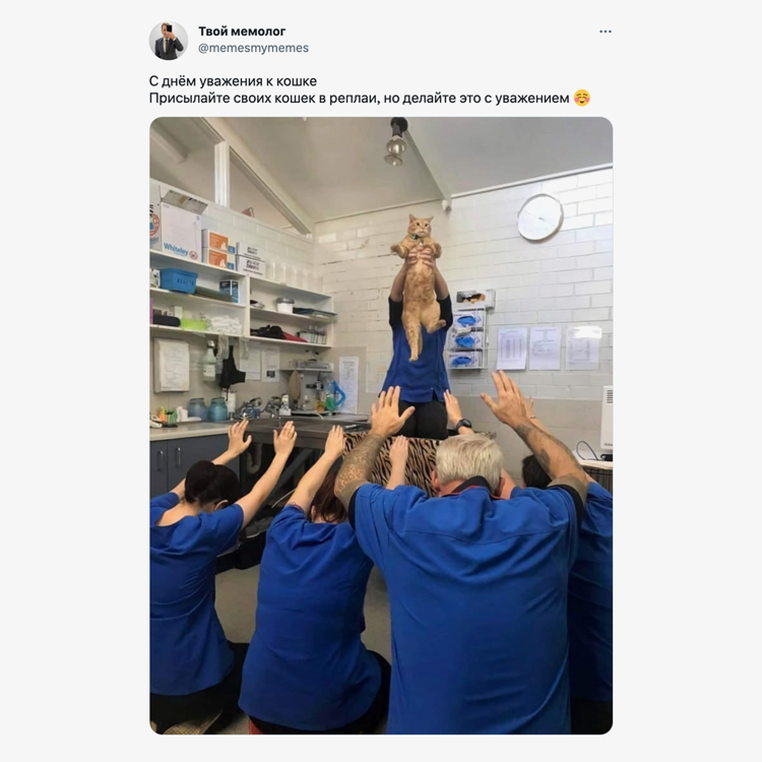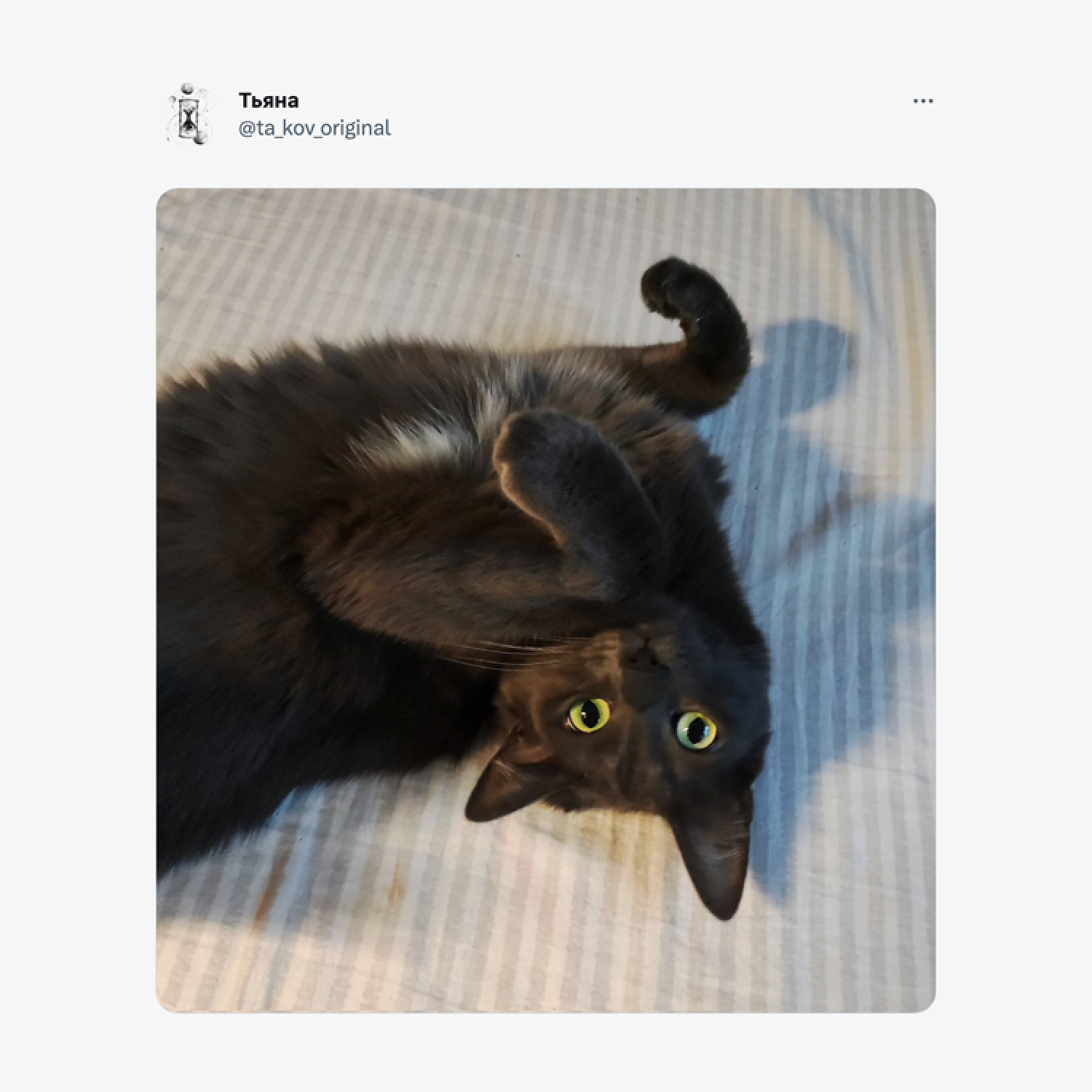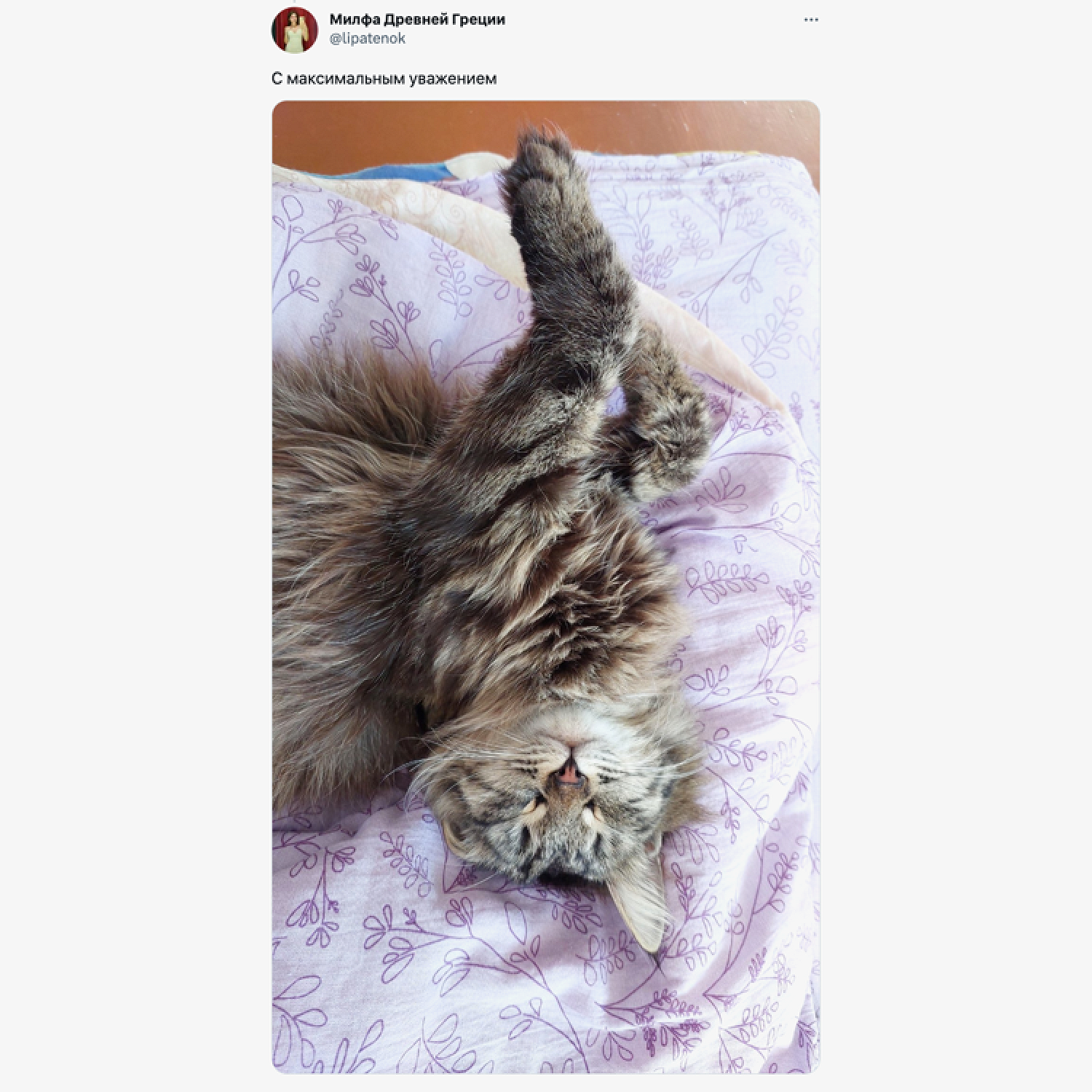 @memesmymemes предложил другим пользователям скинуть в реплаи своих котов и кошек — но, конечно, «делать это с уважением». Комментаторы делятся кадрами питомцев, и судя по мордочкам многих, к ним без уважения лучше даже не подступаться. «Иди принеси мне рыбов, раб!» — представляет речь своего пушистого компаньона @purplenkii.