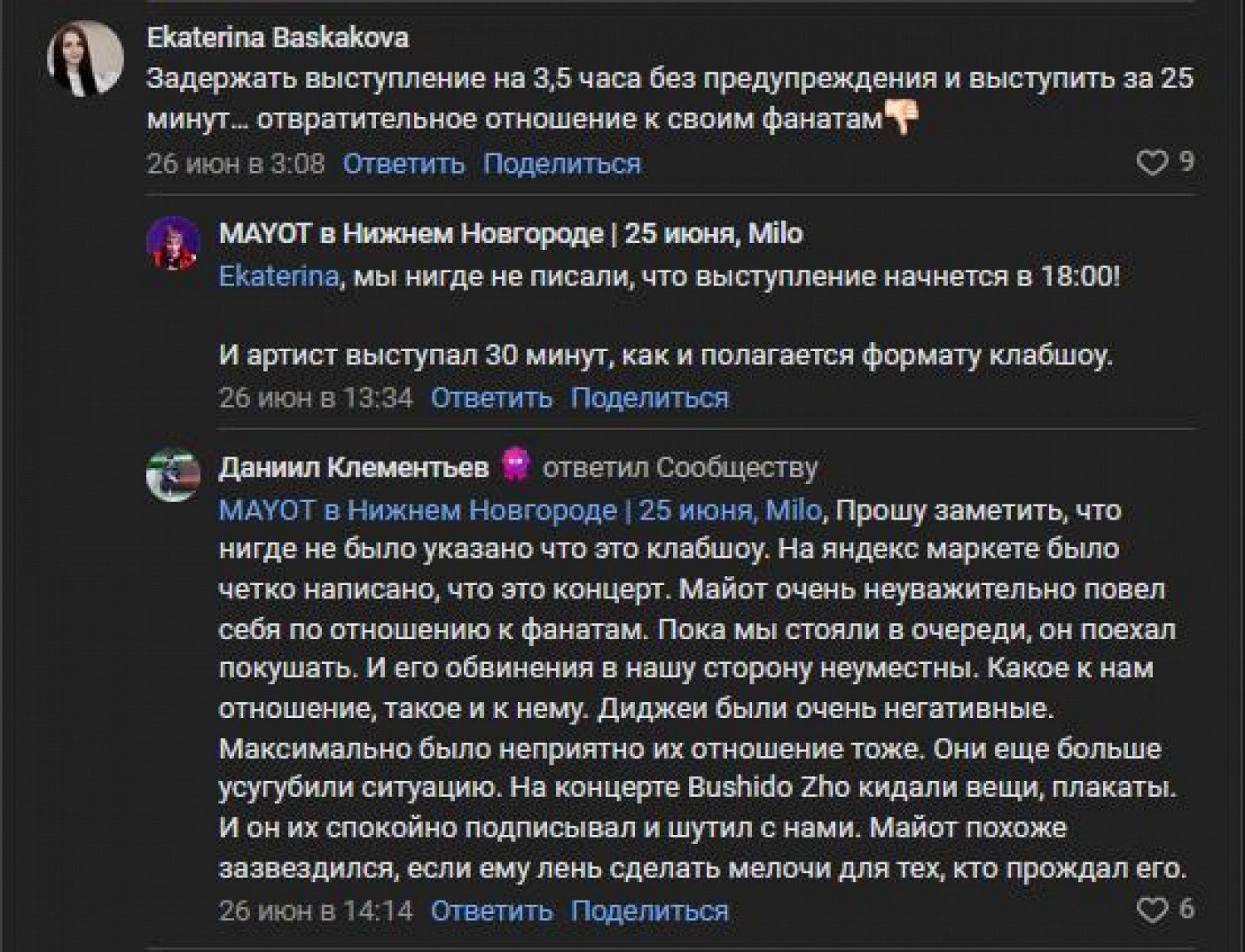 Пользователь Даниил Клементьев в комментариях отметил, что на странице мероприятия на «Яндекс Маркете» (вероятно, имеется в виду «Яндекс Афиша». — Прим. ред.) был указан формат концерта. «Майот очень неуважительно повел себя по отношению к фанатам. Пока мы стояли в очереди, он поехал покушать. И его обвинения в нашу сторону неуместны. Какое к нам отношение, такое и к нему», — уверен зритель.