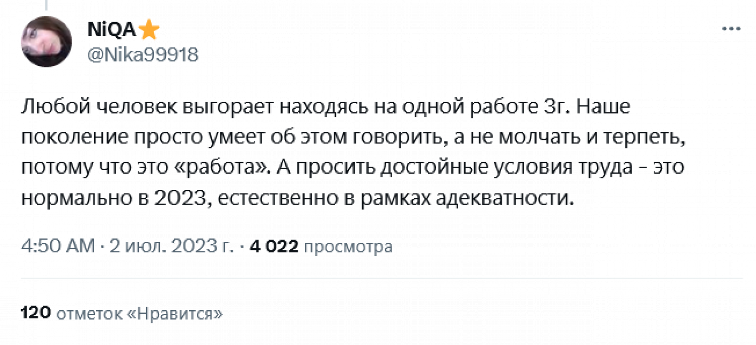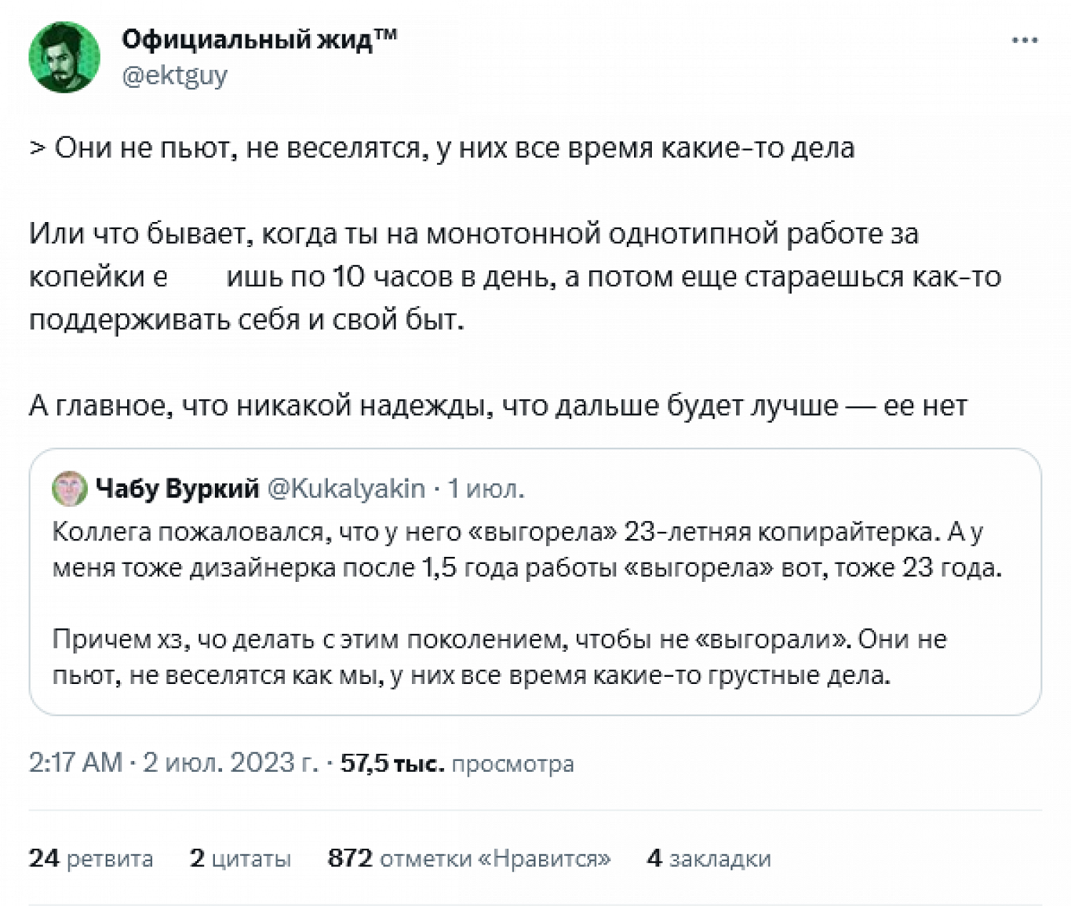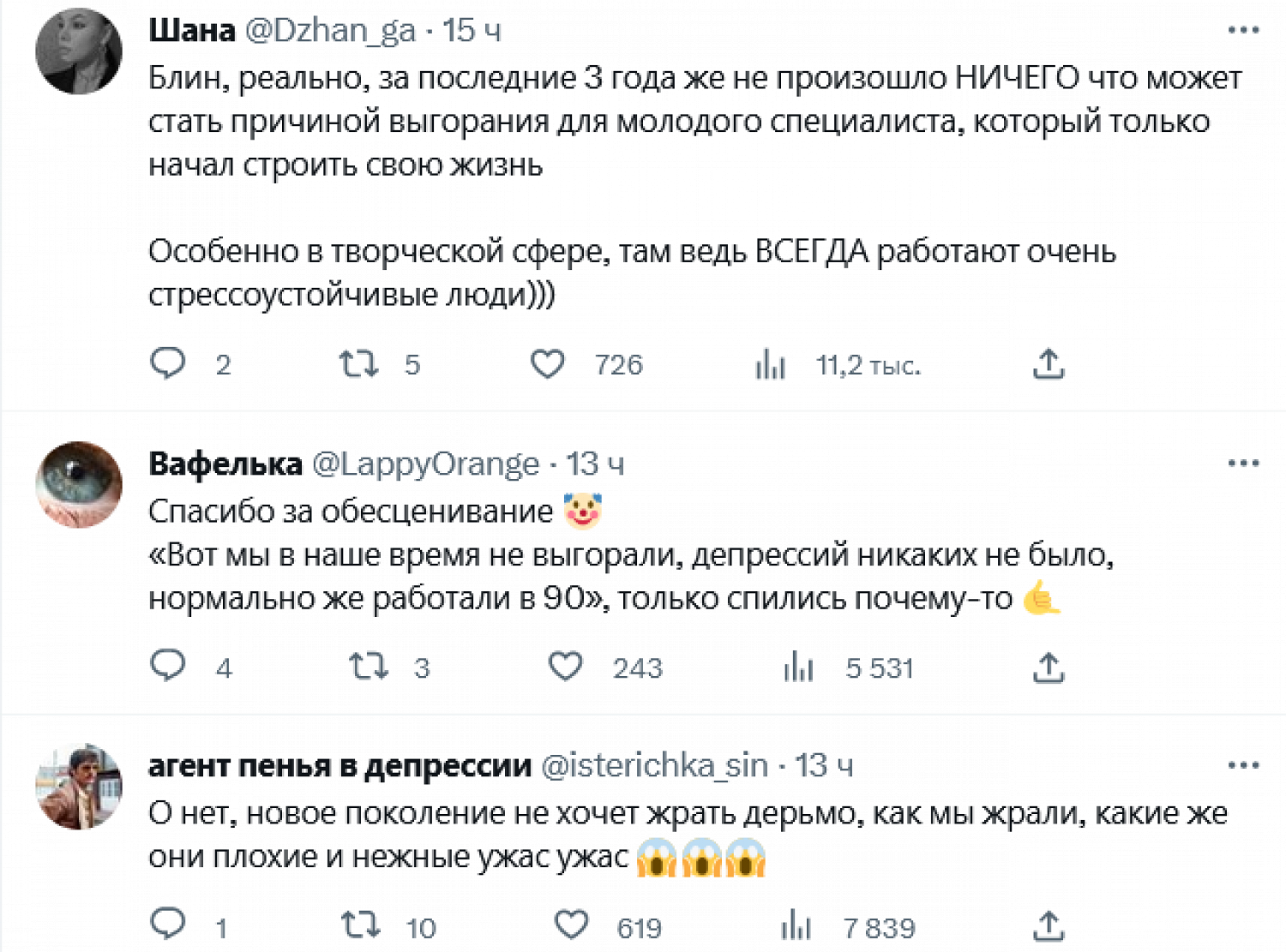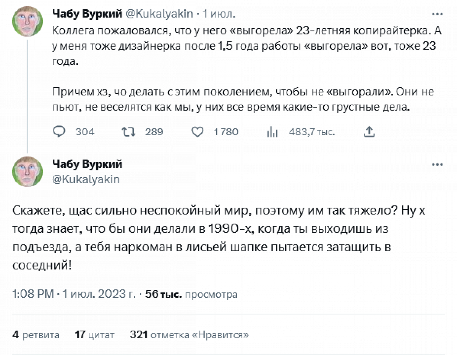 Пользователь @Kukalyakin рассказал, что управляет рекламным агентством и в его окружении две двадцатилетние девушки пожаловались на выгорание. Его удивило то, как быстро молодые люди устали от трудовых задач.