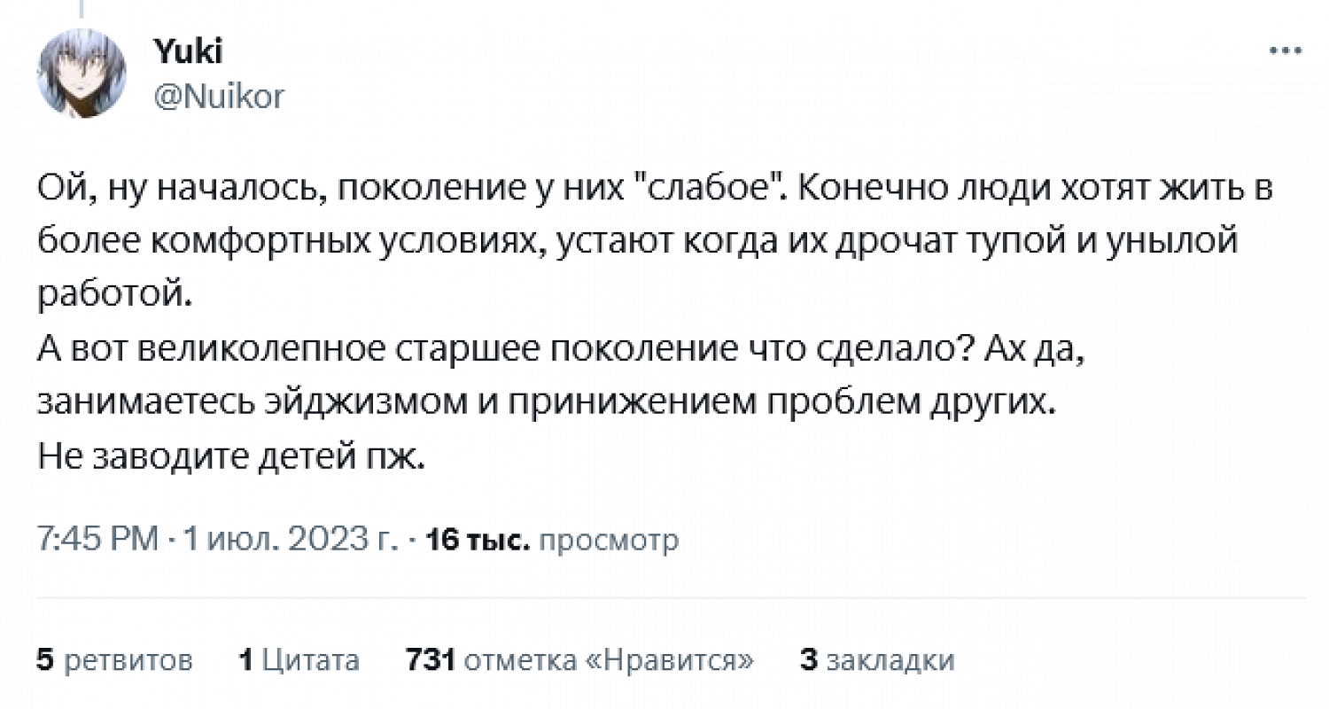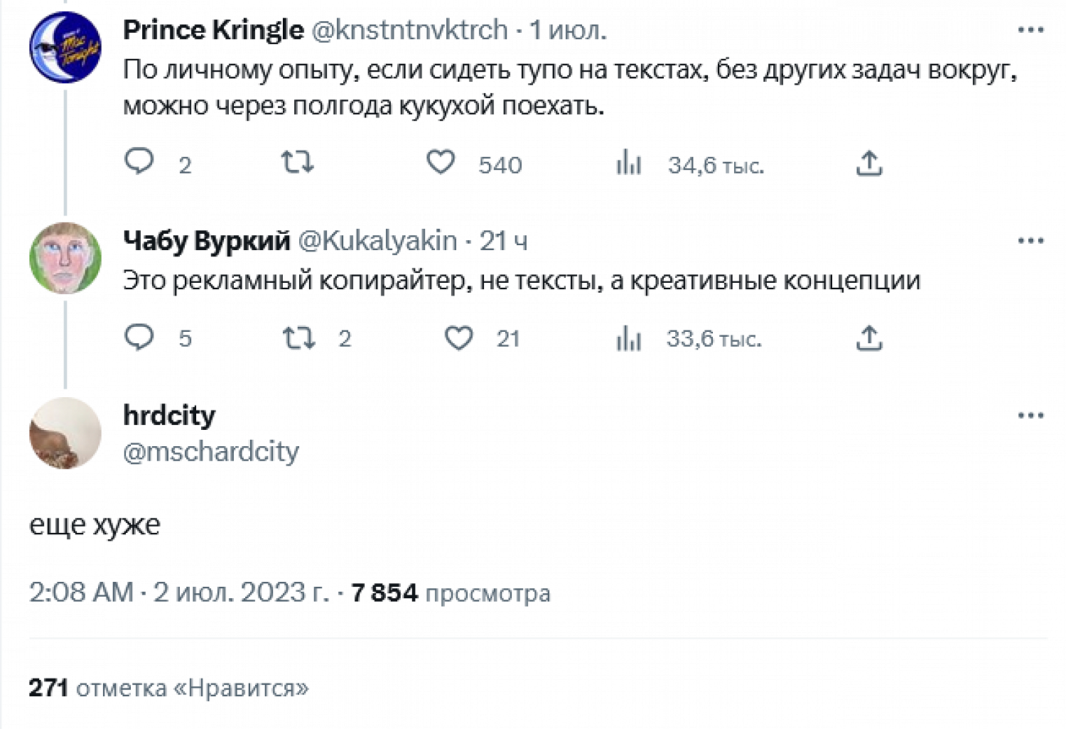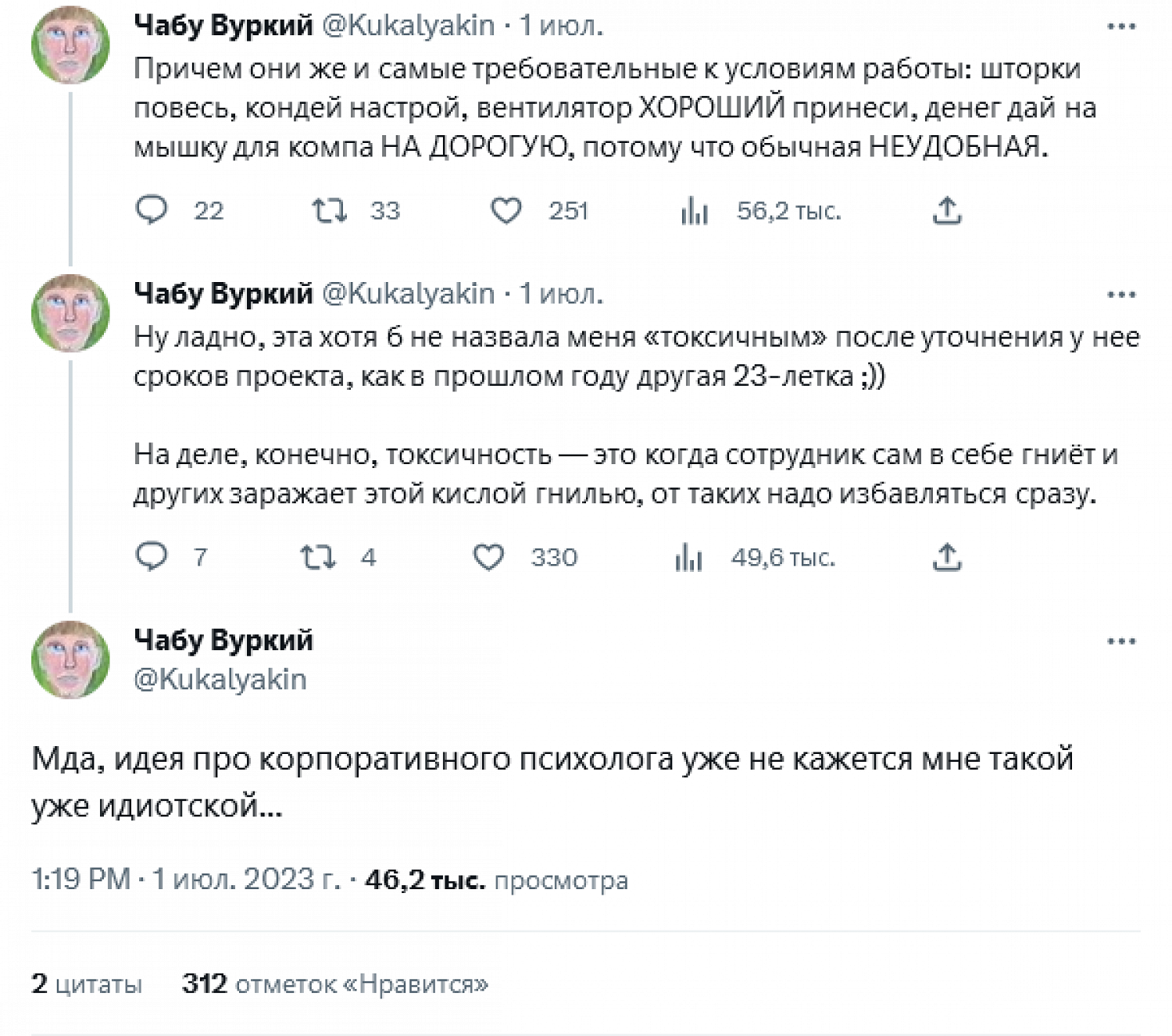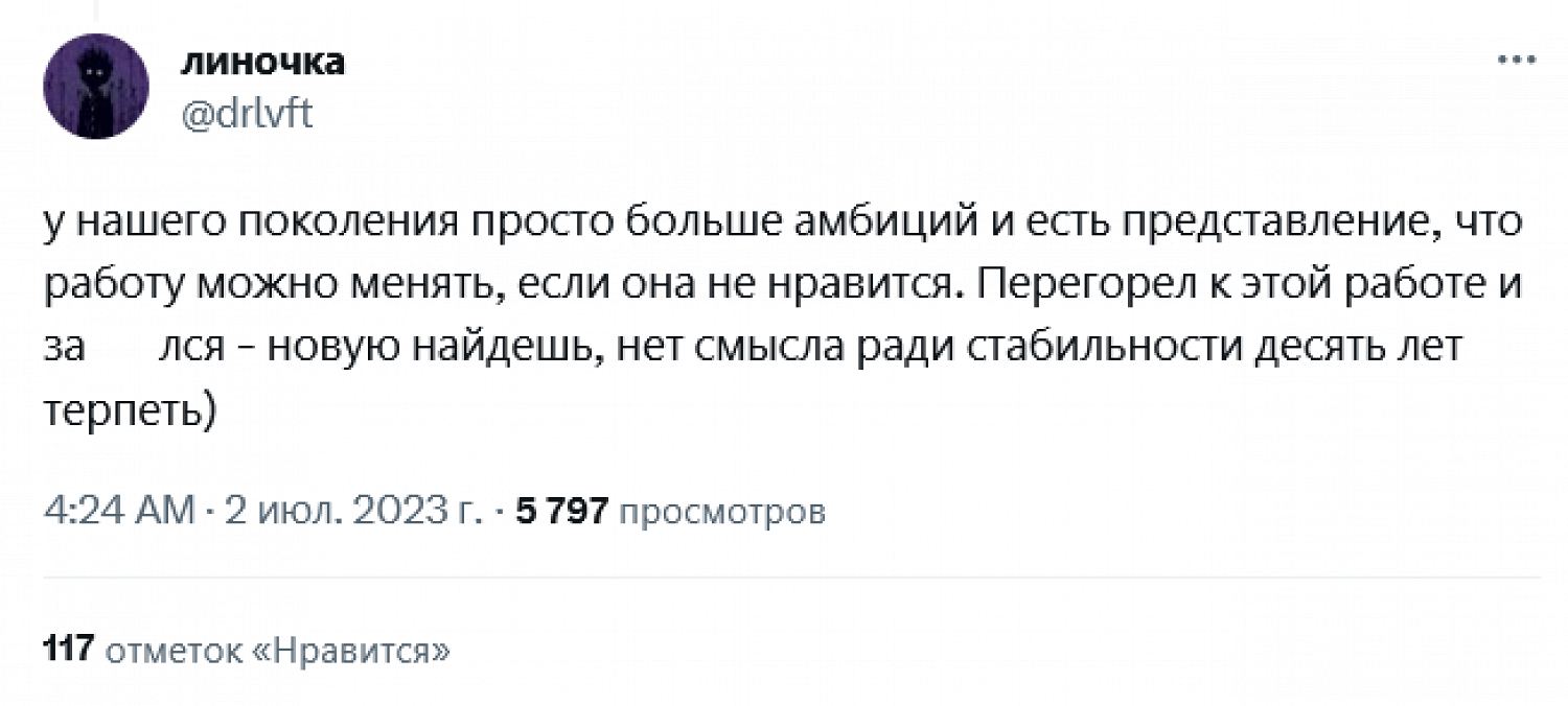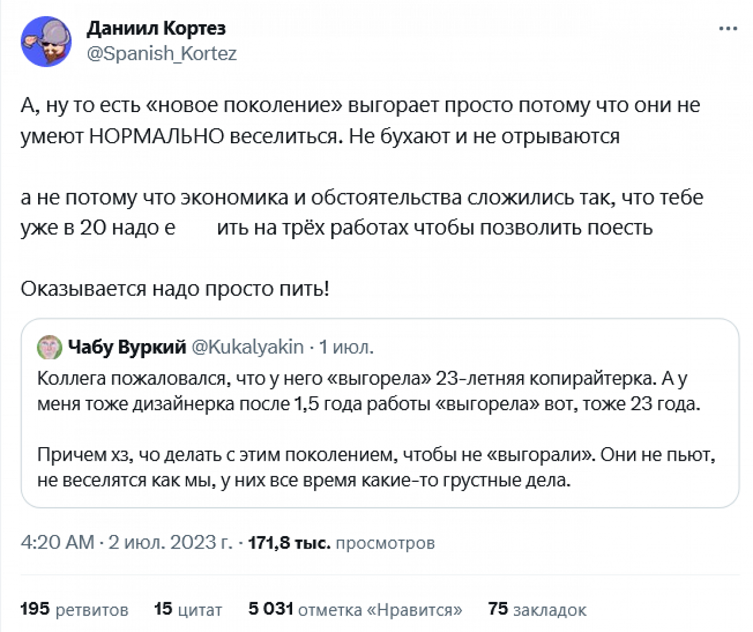 Пользователь @Kukalyakin рассказал, что управляет рекламным агентством и в его окружении две двадцатилетние девушки пожаловались на выгорание. Его удивило то, как быстро молодые люди устали от трудовых задач.