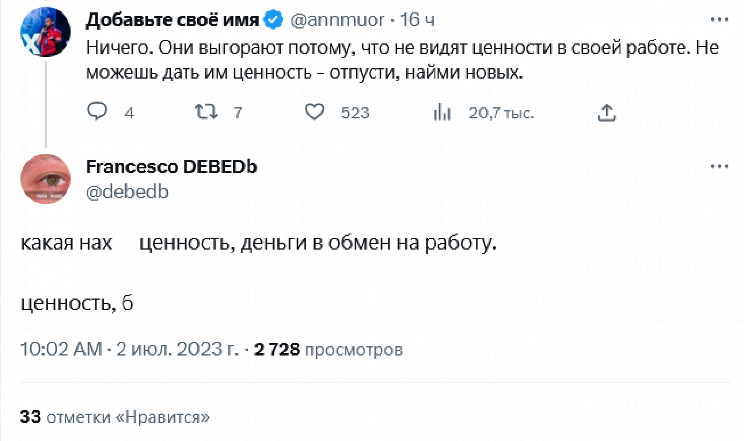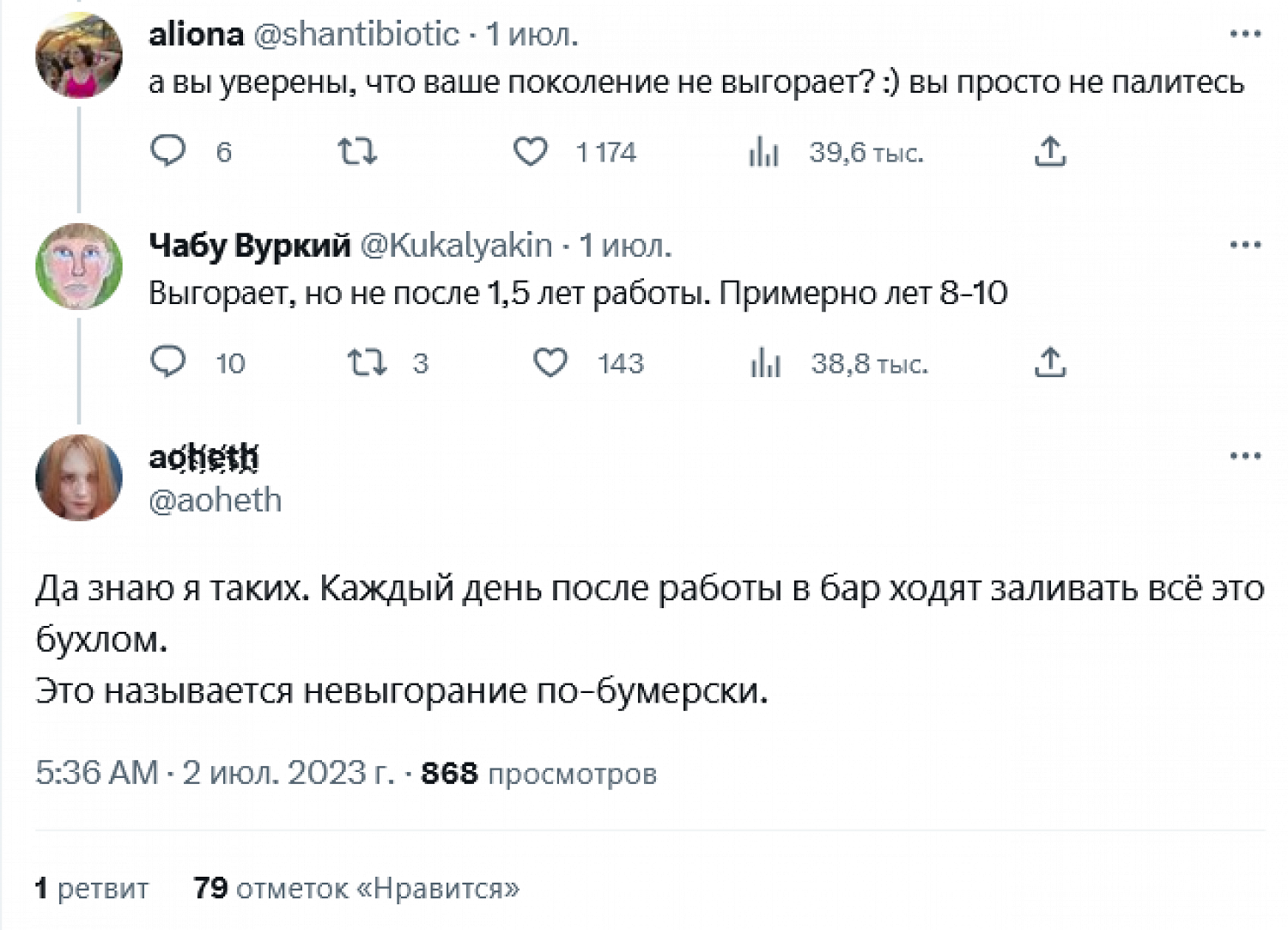 В твиттере разгорелась дискуссия о конфликте поколений и выгорании. Начальник удивился коллегам-зумерам, покинувшим его компанию в неожиданно короткий срок, и получил урок в отношениях с новым поколением.