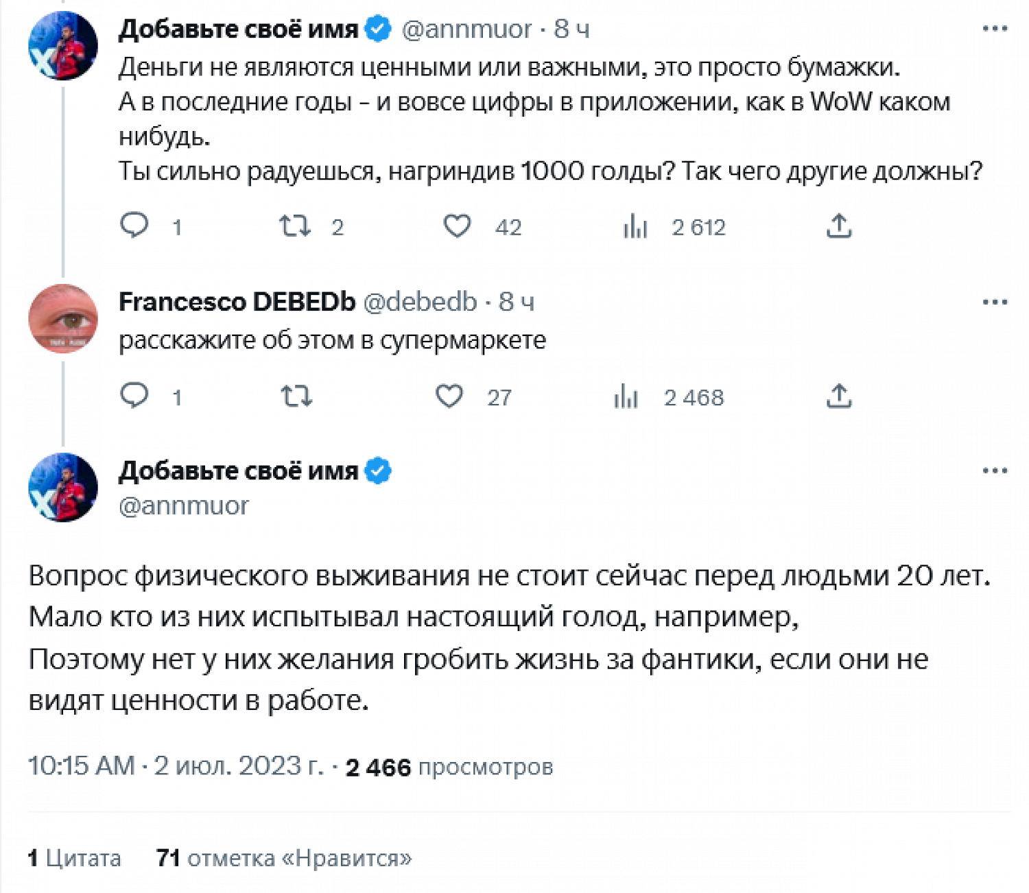 В треде были и версии от зумеров. Они сразу отметили эйджизм рекламщика и прямоту его коллег, а также пояснили автору поста основные черты нового поколения, например, умение отстаивать свои границы, повышенные амбиции и нежелание засиживаться на месте.
