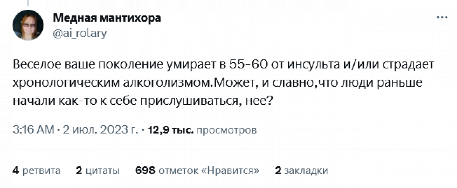 Читатели быстро напомнили мужчине, как старшее поколение любило снимать стресс алкоголем, и это приводит лишь к проблемам со здоровьем и психикой. Так что, наверное, к лучшему, что девушки были равнодушны к выпивке.