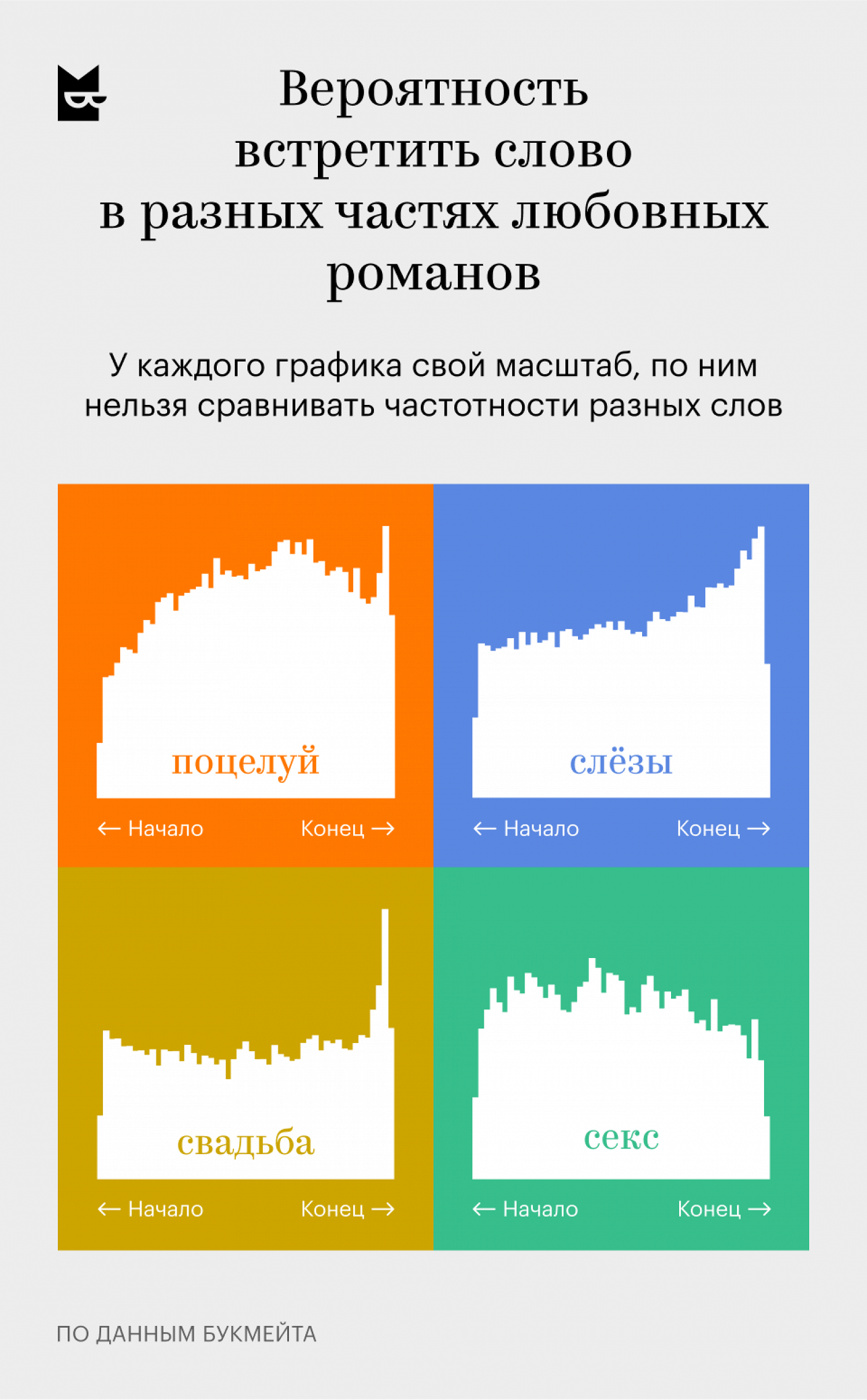 Сцены с поцелуем в современных романах чаще всего встречаются в конце повествования, как и слезы или свадьба. А вот секса ближе к финалу, как правило, становится меньше.
