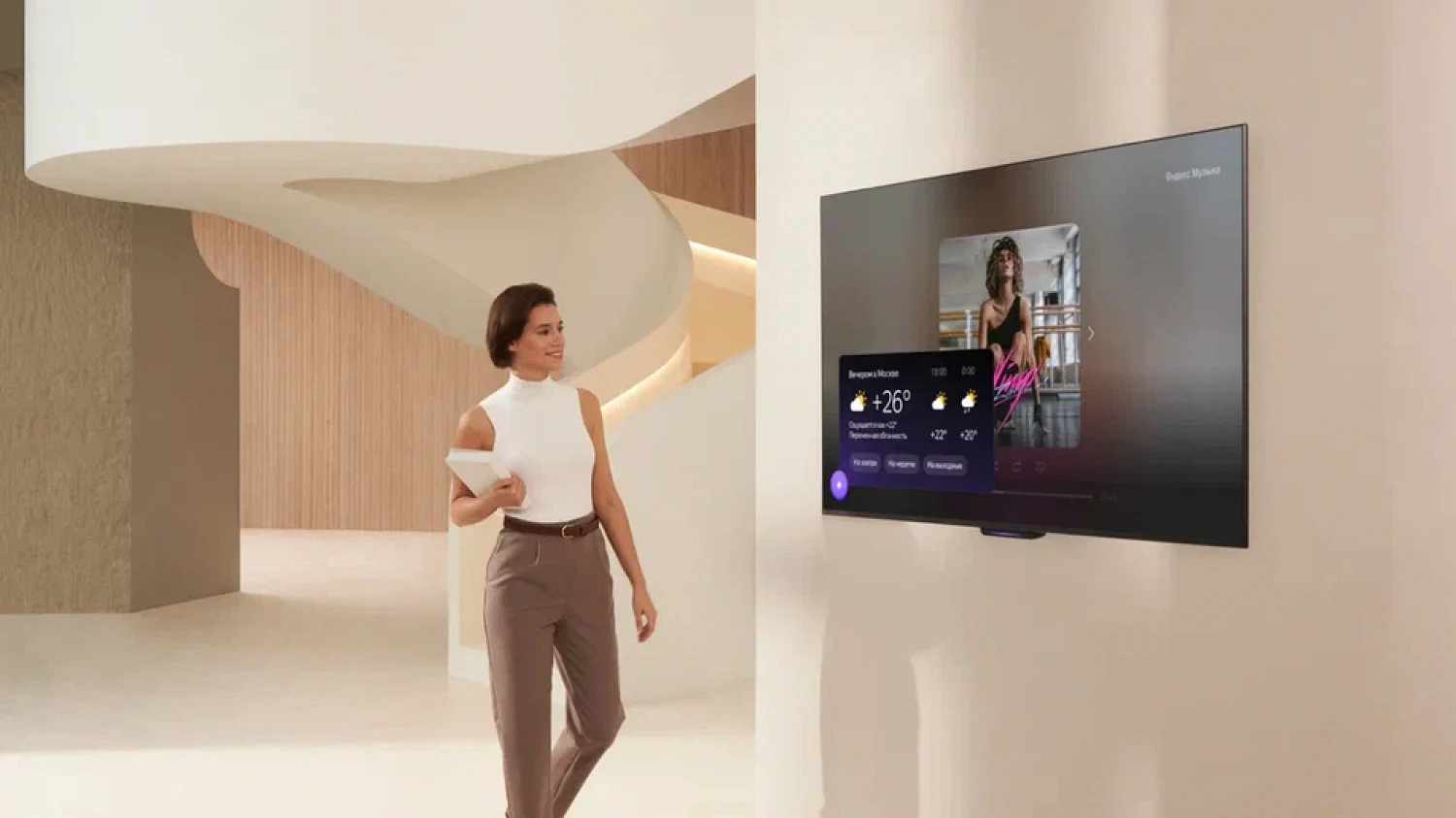 С помощью «ТВ Станций» можно управлять также и умным домом, а Алиса активна даже при выключенном экране. А если его зажечь, то голосовой помощник сможет визуализировать свой ответ — например, не только сообщить прогноз погоды голосом, но и показать.