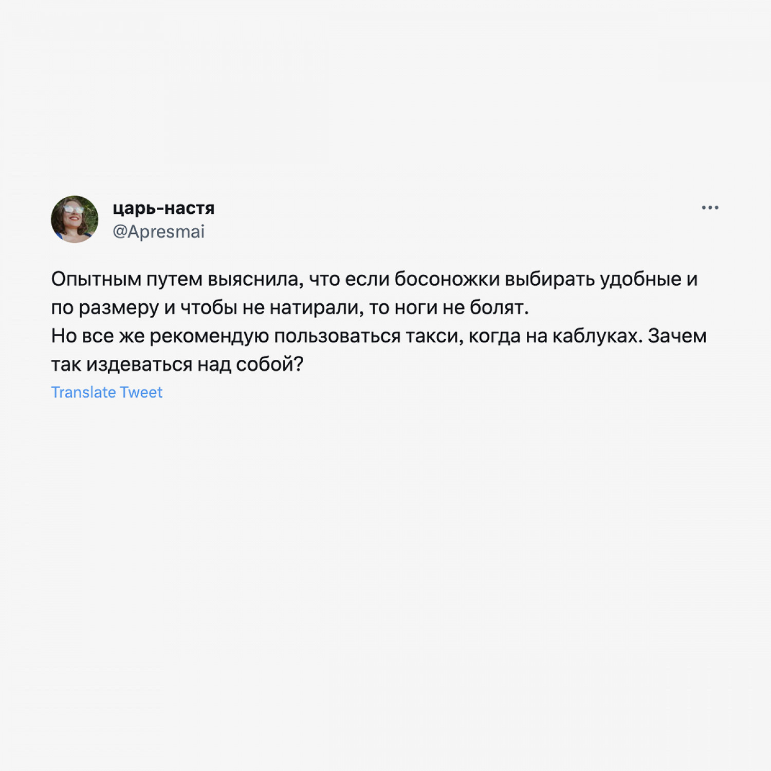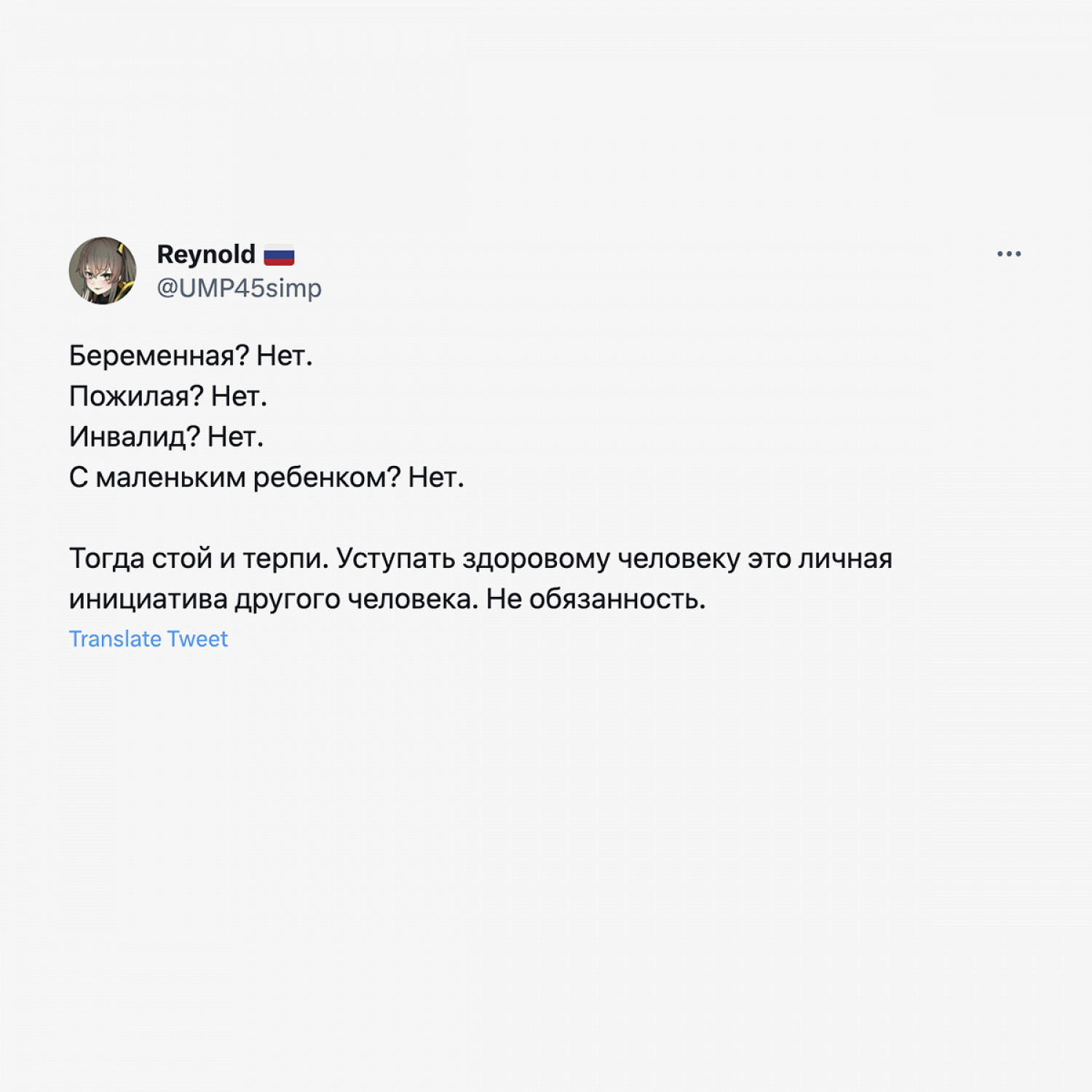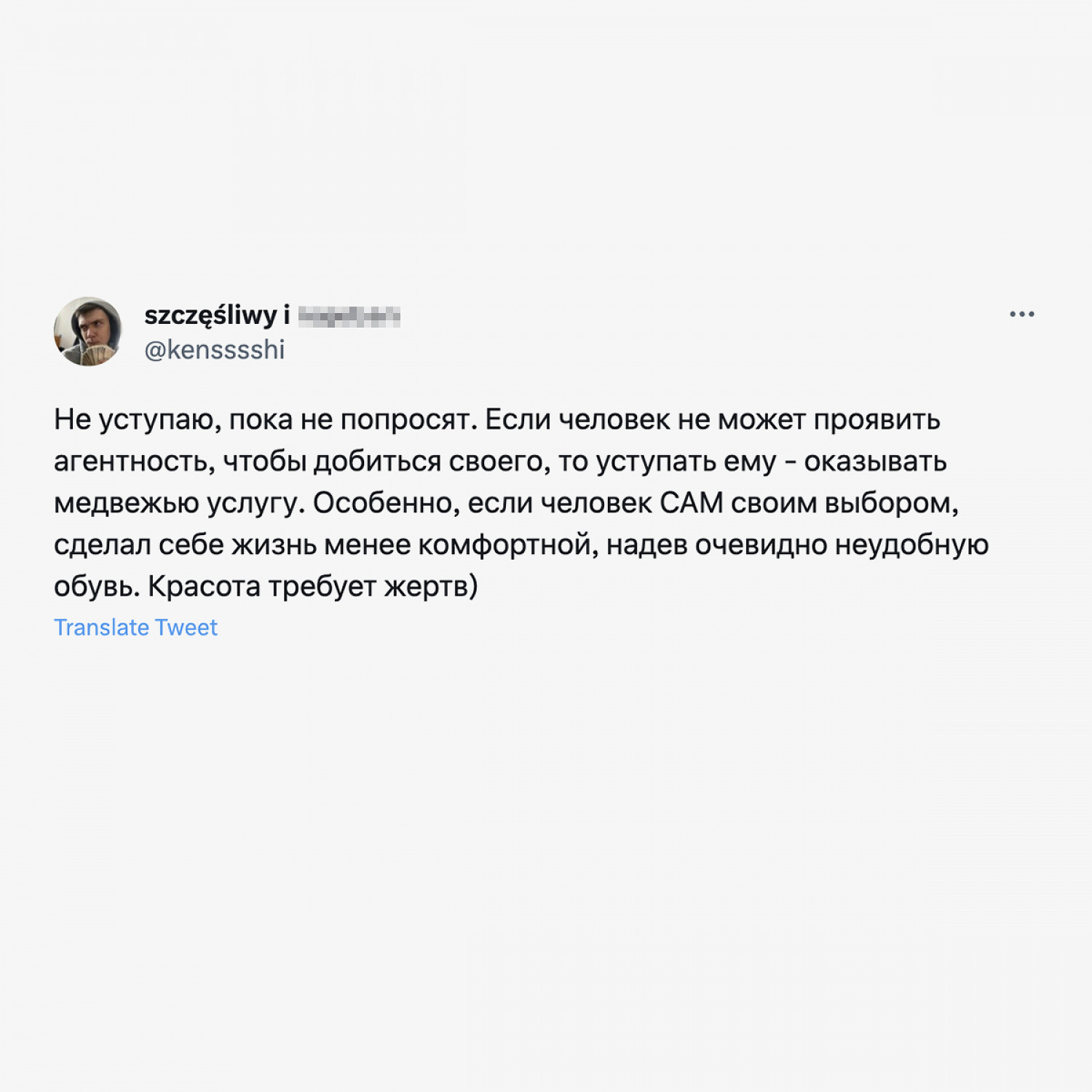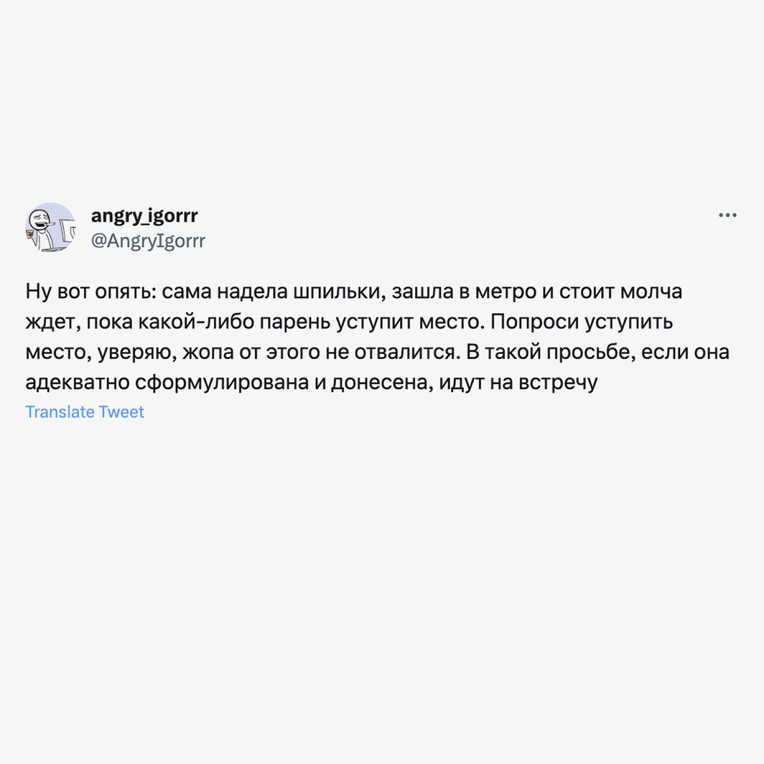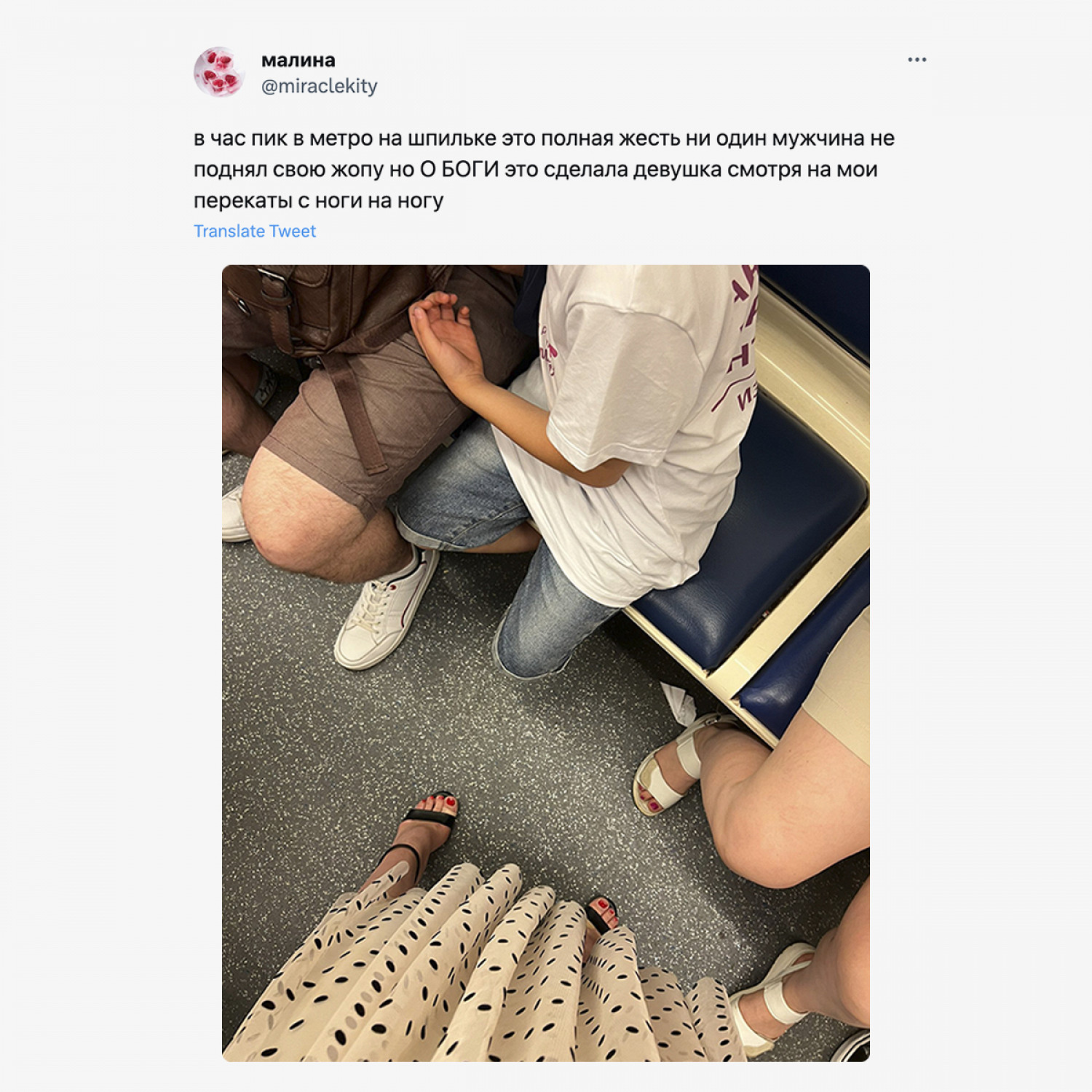 Пользовательница твиттера @miraclekity на этой неделе опубликовала пост, где пожаловалась, что в час пик ехала в вагоне метро в обуви на шпильках, и никто из мужчин не уступал ей место. В итоге ей предложила присесть одна из пассажирок — увидев «перекаты с ноги на ногу» и проявив сочувствие. Твит внезапно вызвал волну обсуждений, в каких случаях стоит уступать места в общественном транспорте и что можно было сделать на месте героини истории.
