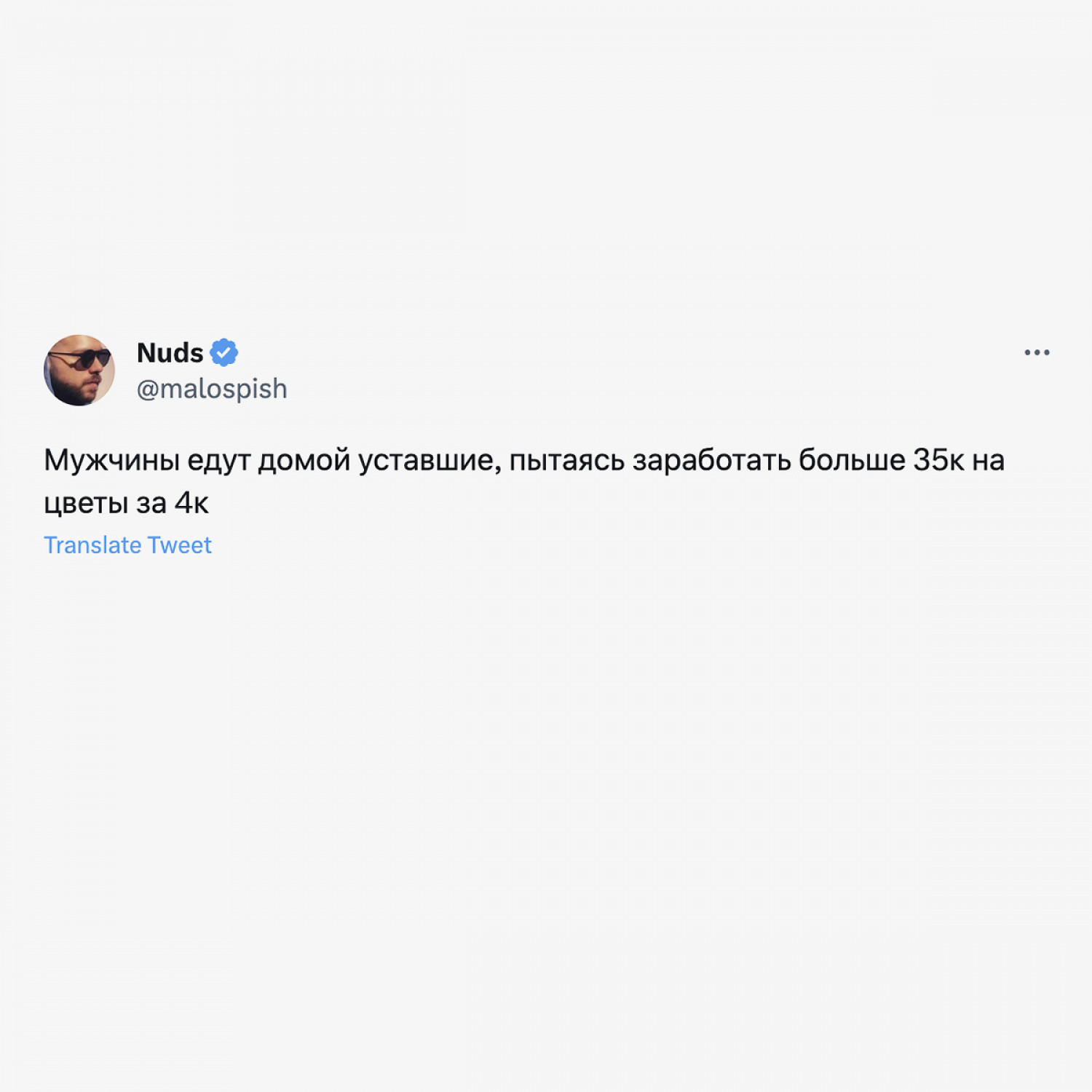 «Мужчины едут домой уставшие, пытаясь заработать больше 35K на цветы за 4K», — саркастично добавляет @malospish, ссылаясь сразу на два твиттерских мема последней недели. Первый возник вокруг обсуждения, сколько должен зарабатывать семьянин, второй связан с торгом за букет цветов во время свидания на Патриарших прудах.