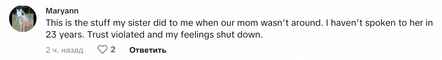 «Это то, что со мной делала моя сестра, пока мамы не было. Я не разговаривала с ней 23 года. Доверие было нарушено, а мои чувства раздавлены»