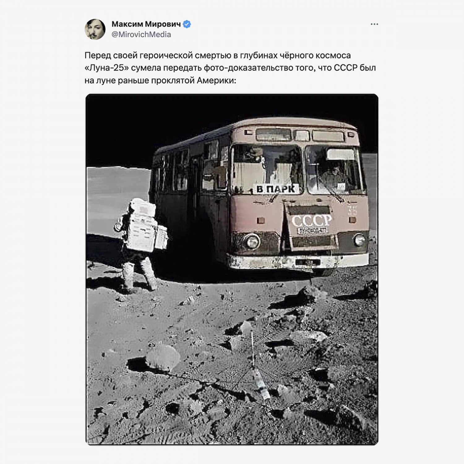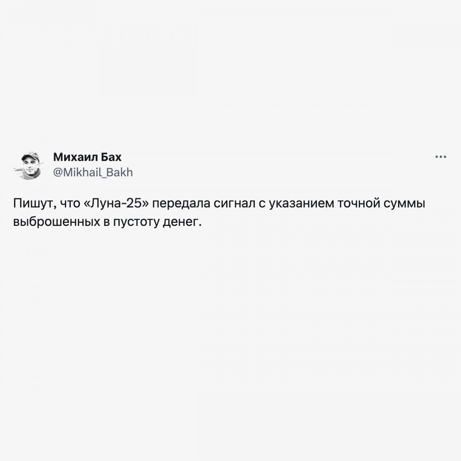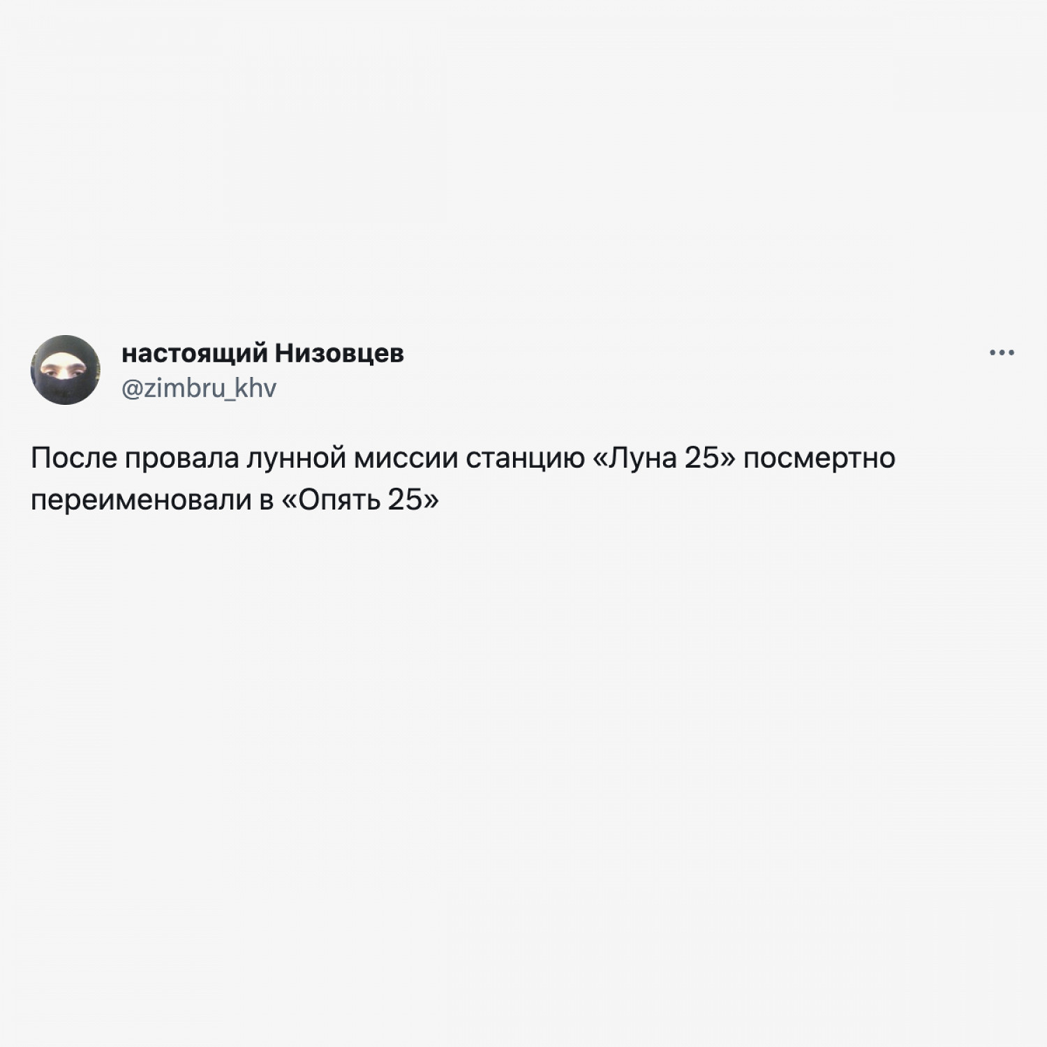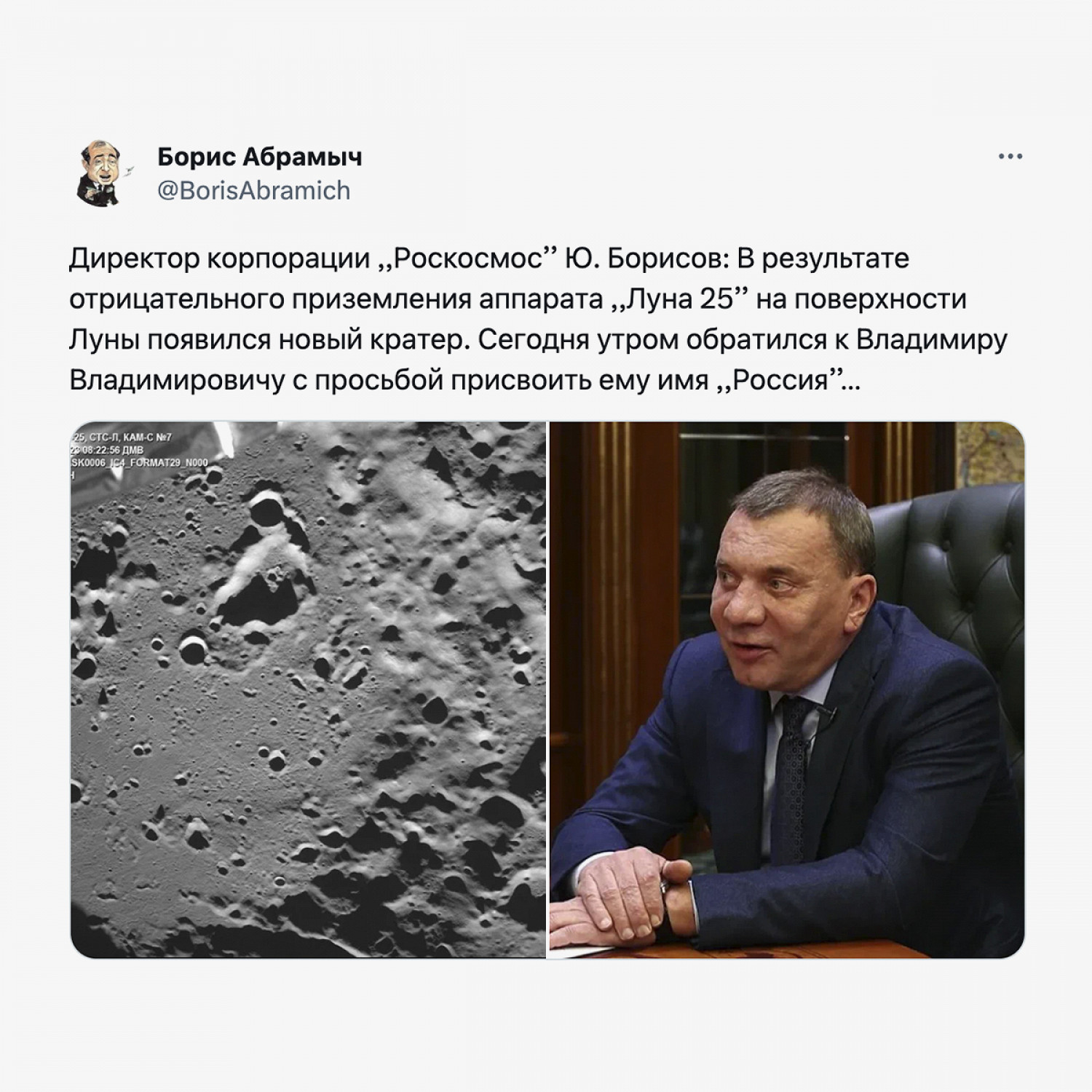 Пользователи иронизируют, что станция «Луна-25» не космическая, а скорее комическая. И добавляют, что ее крушение лишь пополняет список неудачных российских попыток исследовать космос: межпланетная станция «Марс-96» разрушилась при входе в атмосферу Земли через пять часов после запуска в 1996 году, автоматическая межпланетная станция «Фобос-Грунт» в начале 2012 года сгорела в плотных слоях земной атмосферы. Генеральному директору Роскосмоса Юрию Борисову в шутку приписывают слова «в результате отрицательного приземления аппарата ,Луна-25’’ на поверхности Луны появился новый кратер», а сам аппарат «посмертно переименовывают» в «Опять 25».