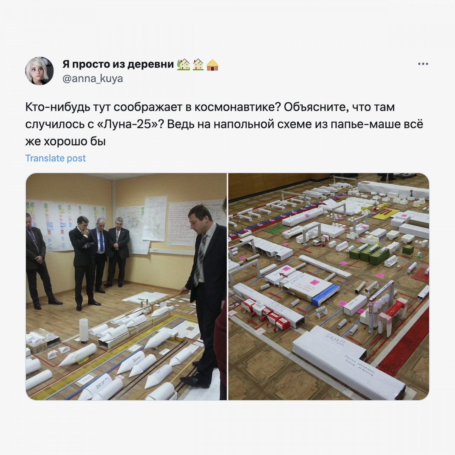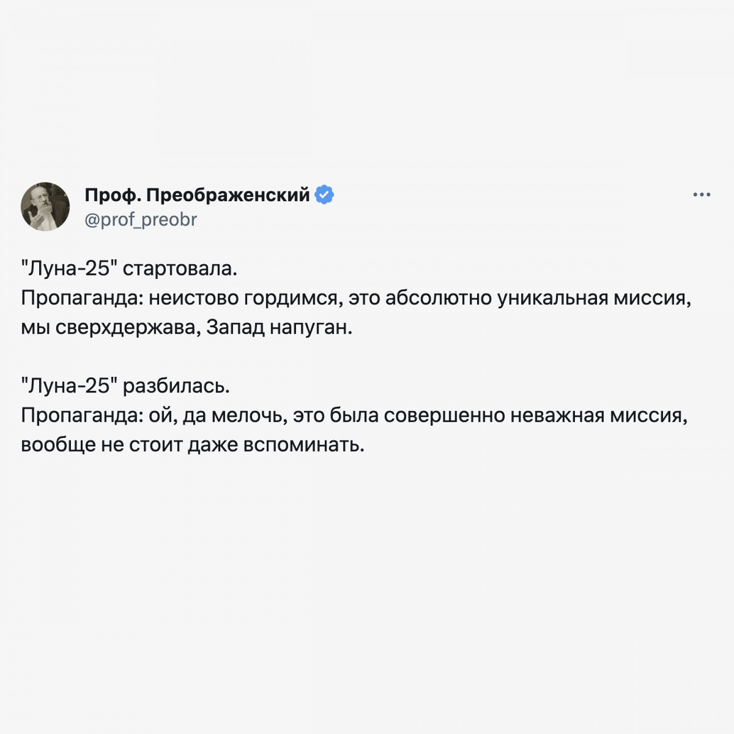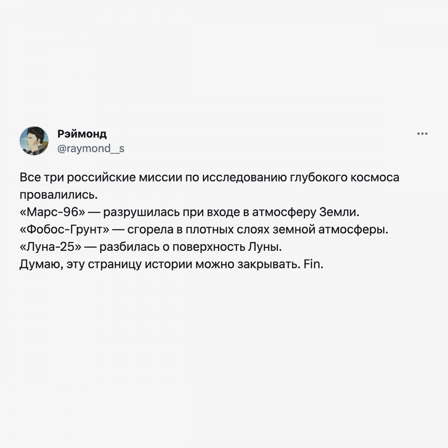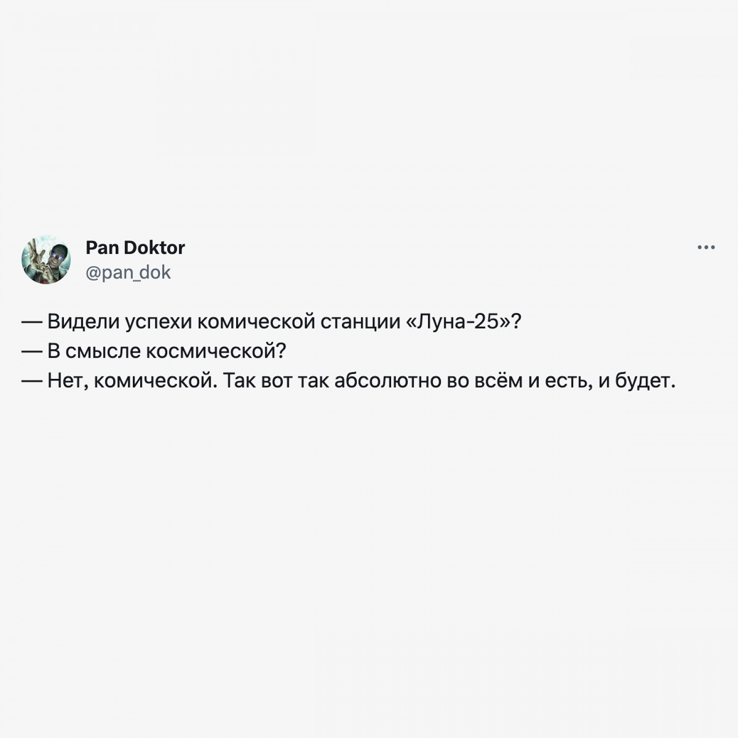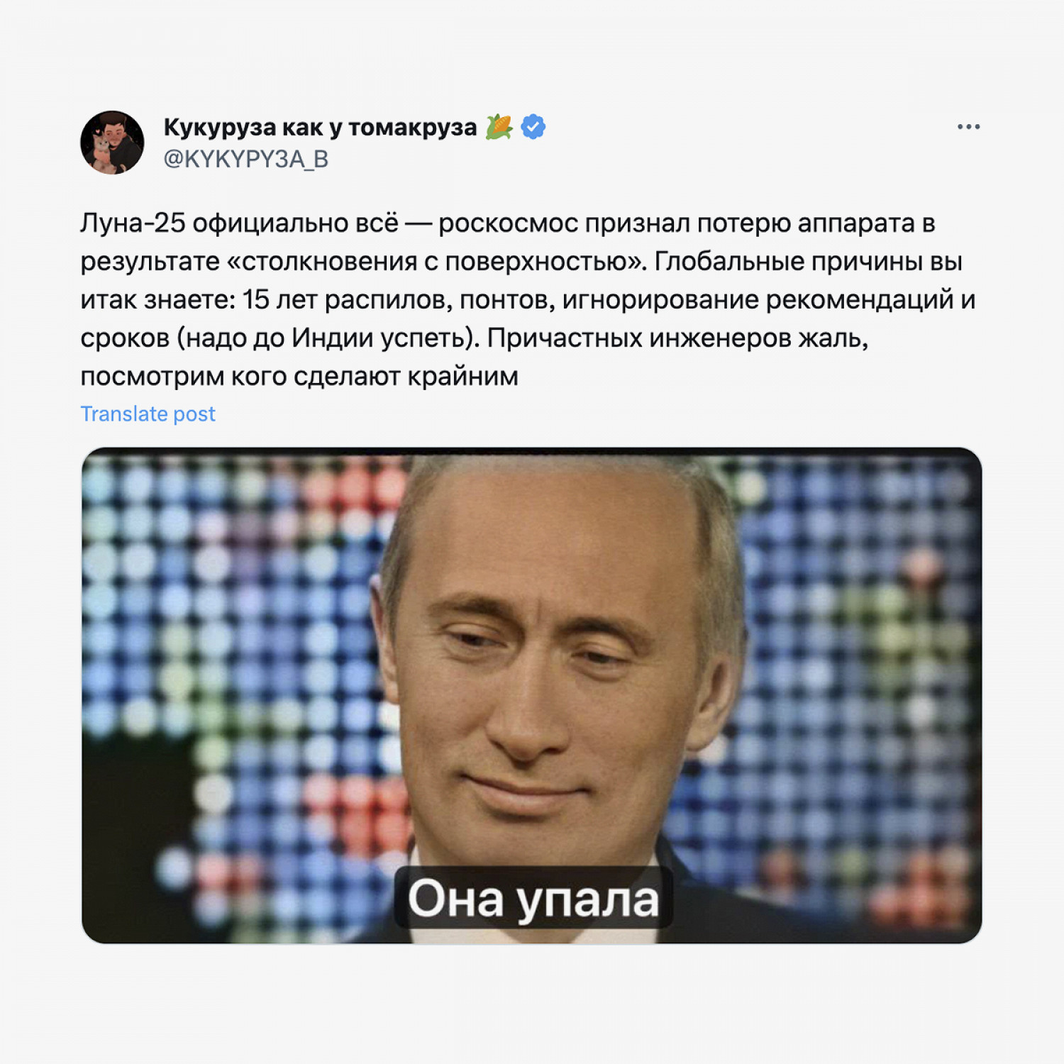 Пользователи иронизируют, что станция «Луна-25» не космическая, а скорее комическая. И добавляют, что ее крушение лишь пополняет список неудачных российских попыток исследовать космос: межпланетная станция «Марс-96» разрушилась при входе в атмосферу Земли через пять часов после запуска в 1996 году, автоматическая межпланетная станция «Фобос-Грунт» в начале 2012 года сгорела в плотных слоях земной атмосферы. Генеральному директору Роскосмоса Юрию Борисову в шутку приписывают слова «в результате отрицательного приземления аппарата ,Луна-25’’ на поверхности Луны появился новый кратер», а сам аппарат «посмертно переименовывают» в «Опять 25».