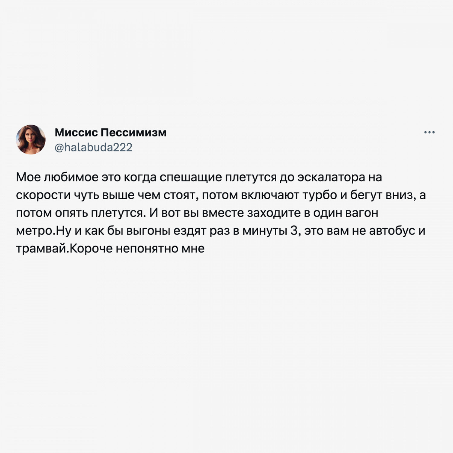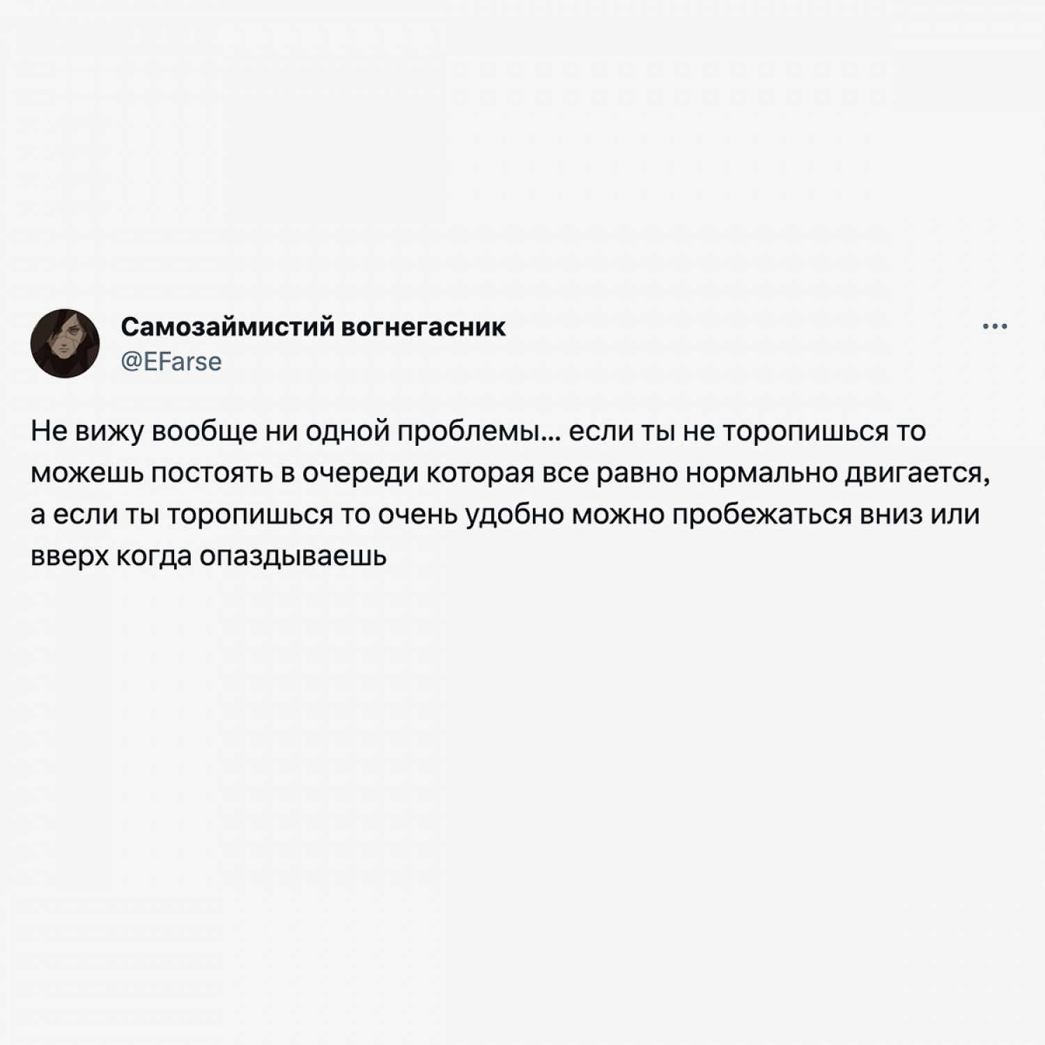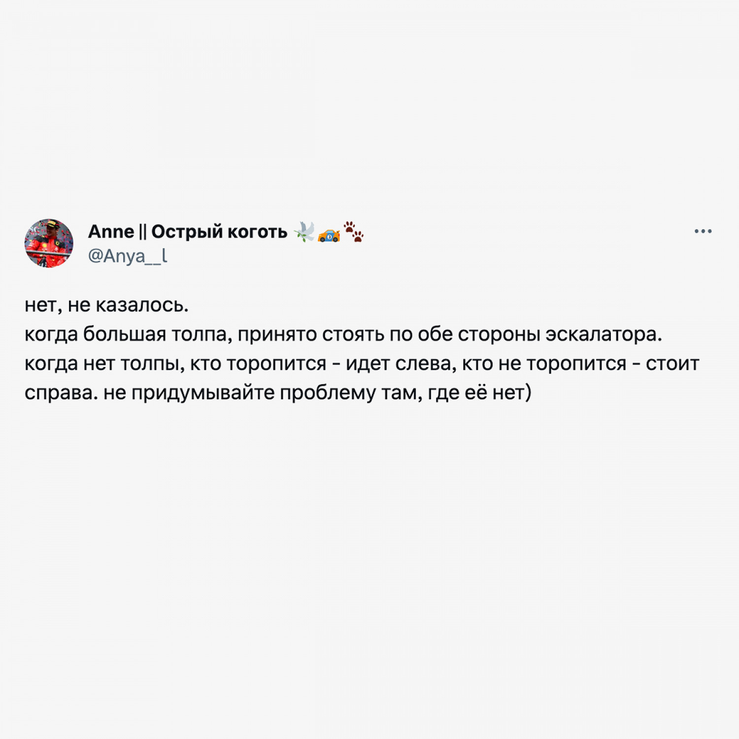 «Быстрее эскалатора вы не проедете, если будете [стоять] в два ряда», — утверждает @ebrie17. Тем не менее в 2019 году Московский метрополитен запускал кампанию, призванную приучить пассажиров занимать обе стороны эскалатора. Утверждалось, что очередь перед ним уменьшится на 30%. Авторы идеи ссылались на исследование, проведенное в Великобритании в 2016 году.