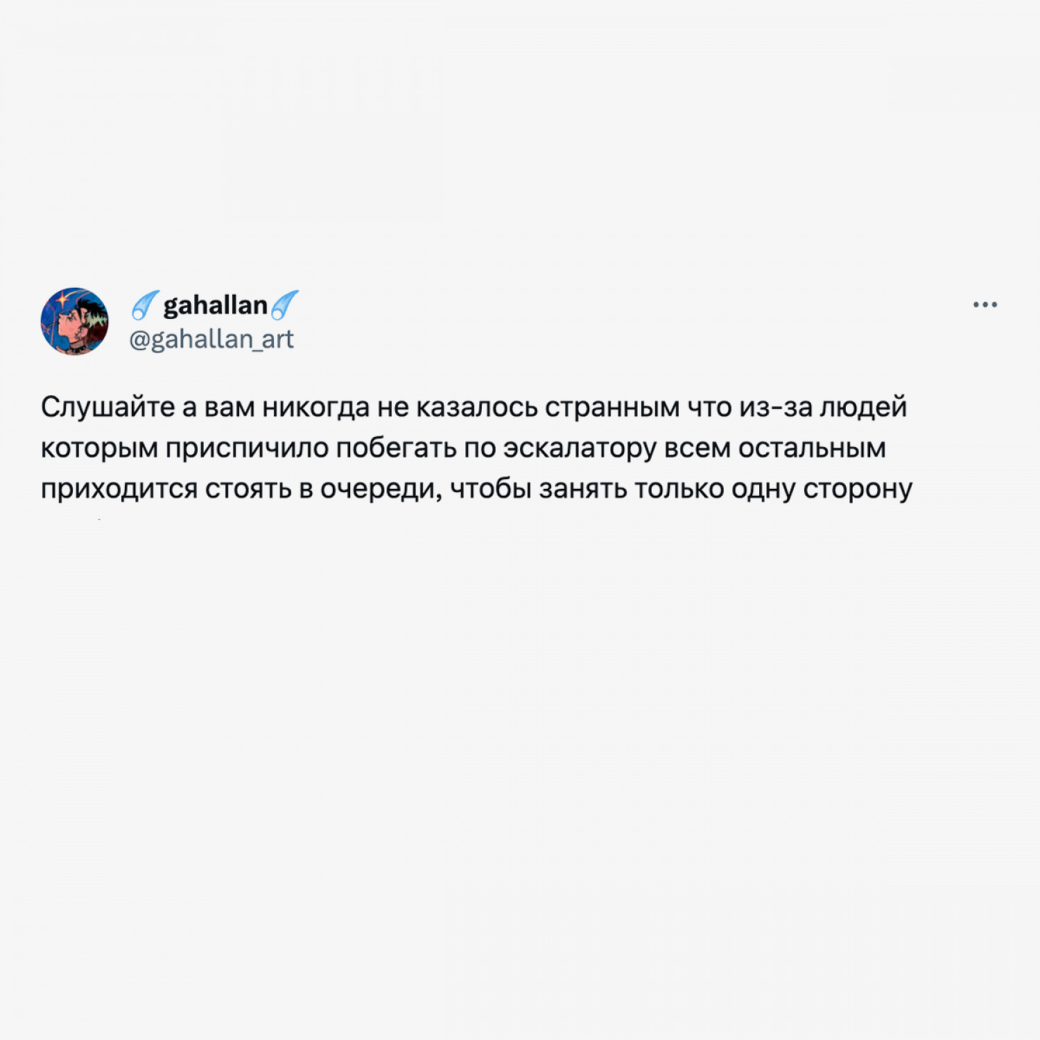 В твиттере разгорелся новый спор: пассажиры метрополитена выясняют, как правильно вести себя на эскалаторе. @gahallan_art опубликовала твит, в котором задала читателям вопрос, не кажется ли им странным, что «из‑за людей, которым приспичило побегать по эскалатору, всем остальным приходится стоять в очереди, чтобы занять только одну сторону».