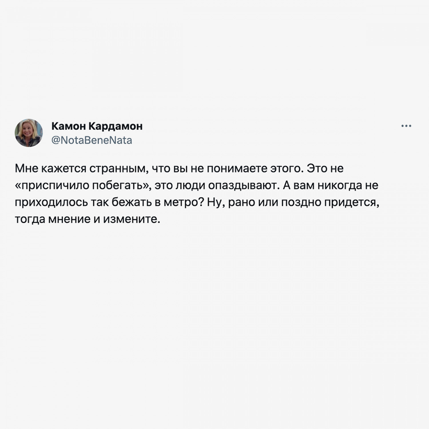 Другие комментаторы отстаивают точку зрения, что у пассажиров должна быть возможность спуститься или подняться быстрее, если они торопятся: «это не „приспичило бегать“, это люди опаздывают», — обращаются к @gahallan_art. «Люди, которые стоят на эскалаторе, у вас что, бесконечная жизнь, что вы тратите ее на вот это?» — шутят под исходным твитом.