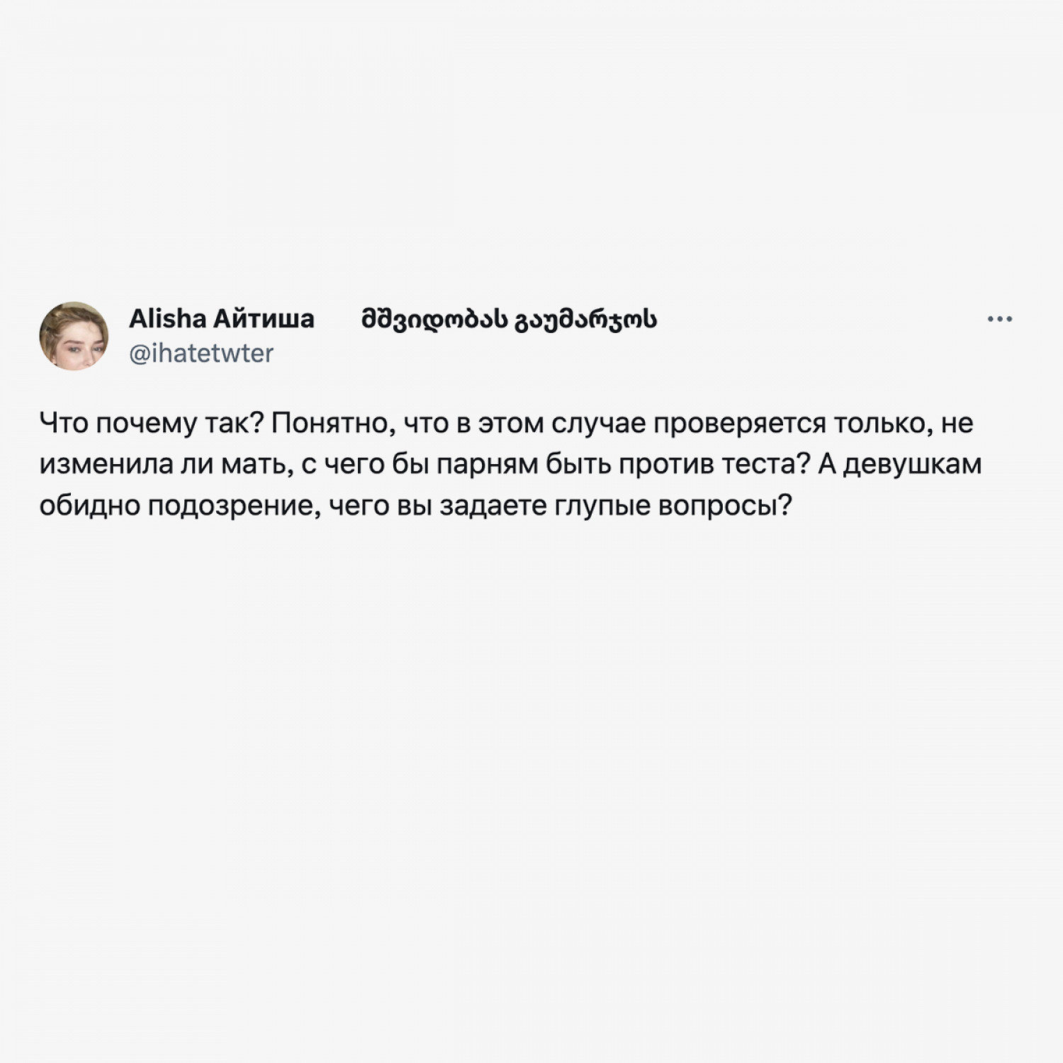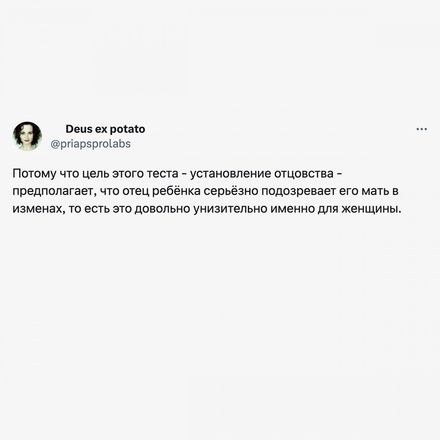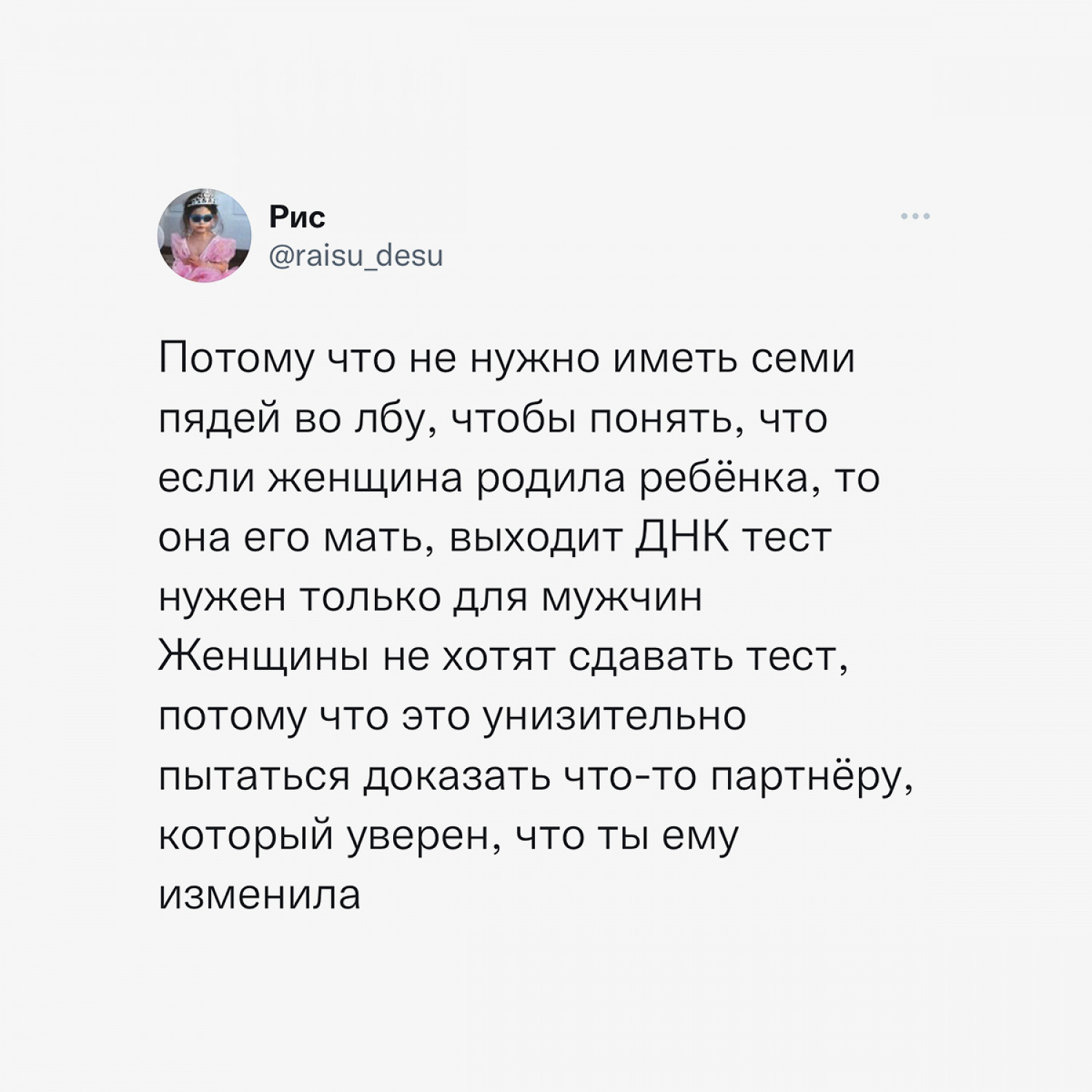 Пользовательницы соцсети объясняют, что требование мужчины сделать ДНК-тест может расцениваться как недоверие с его стороны. «Женщины не хотят сдавать тест, потому что это унизительно — пытаться доказать что‑то партнеру, который уверен, что ты ему изменила», — пишет @raisu_desu. «Я согласилась бы и сделала тест. Но после теста сразу подала бы на развод. Нет доверия — нет отношений, это совершенно справедливо», — добавляет @annaeppy4.