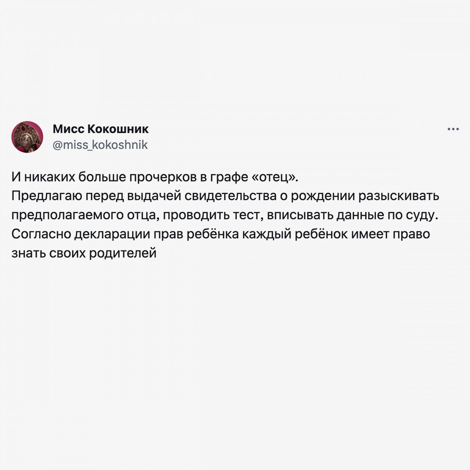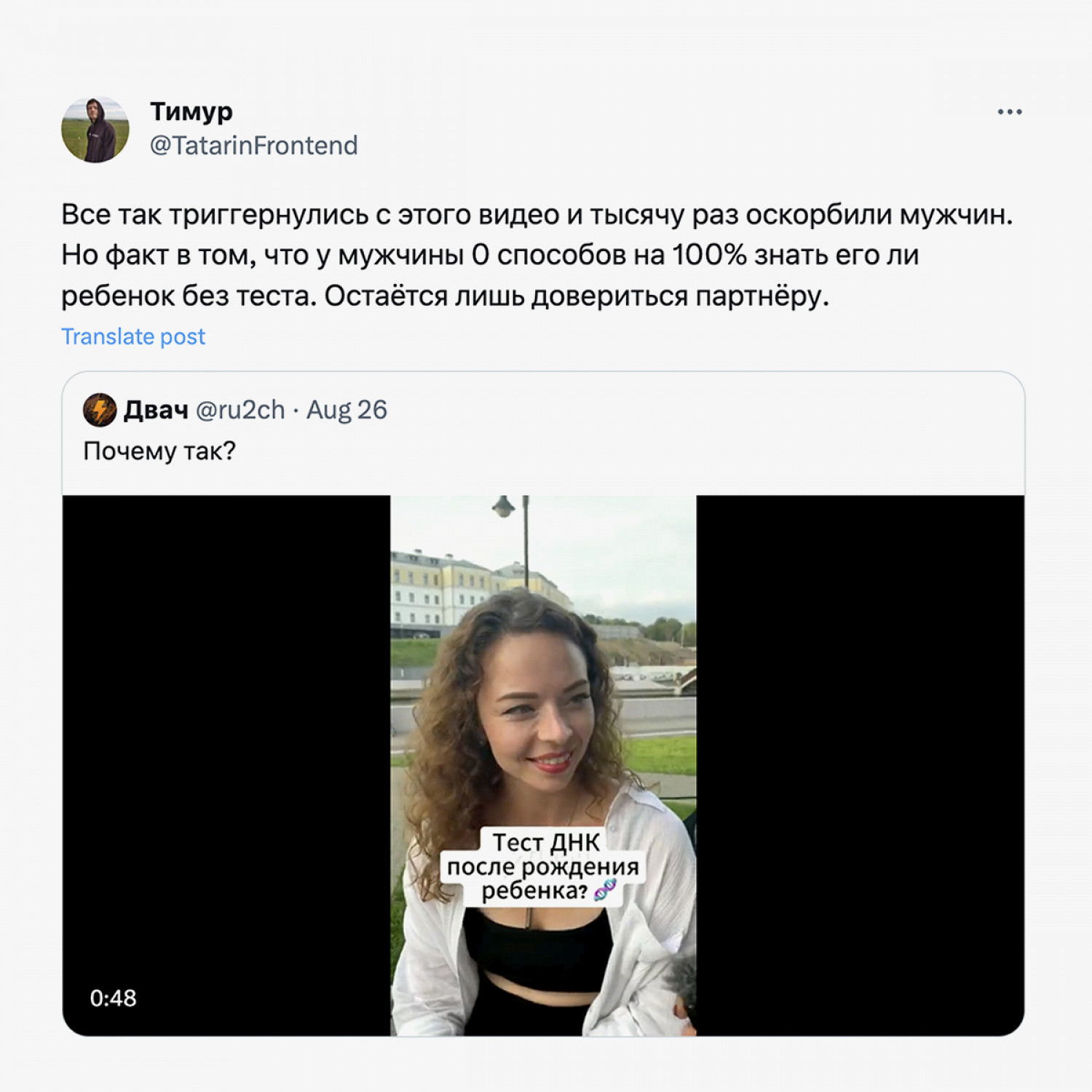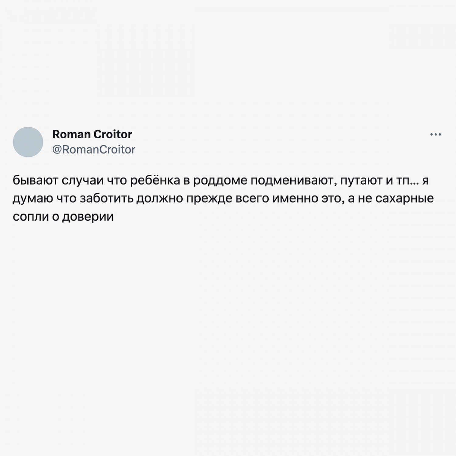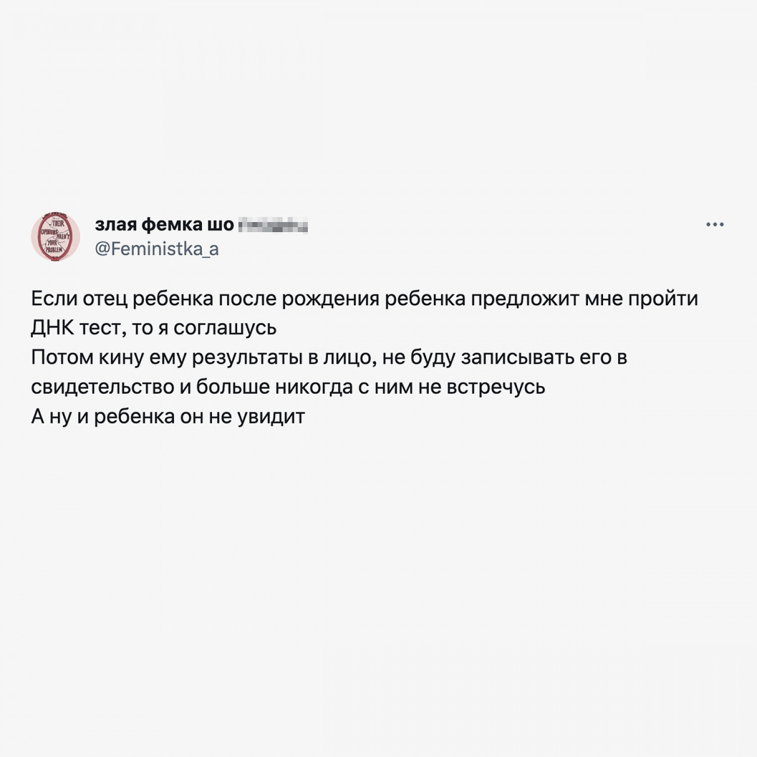 Пользовательницы соцсети объясняют, что требование мужчины сделать ДНК-тест может расцениваться как недоверие с его стороны. «Женщины не хотят сдавать тест, потому что это унизительно — пытаться доказать что‑то партнеру, который уверен, что ты ему изменила», — пишет @raisu_desu. «Я согласилась бы и сделала тест. Но после теста сразу подала бы на развод. Нет доверия — нет отношений, это совершенно справедливо», — добавляет @annaeppy4.