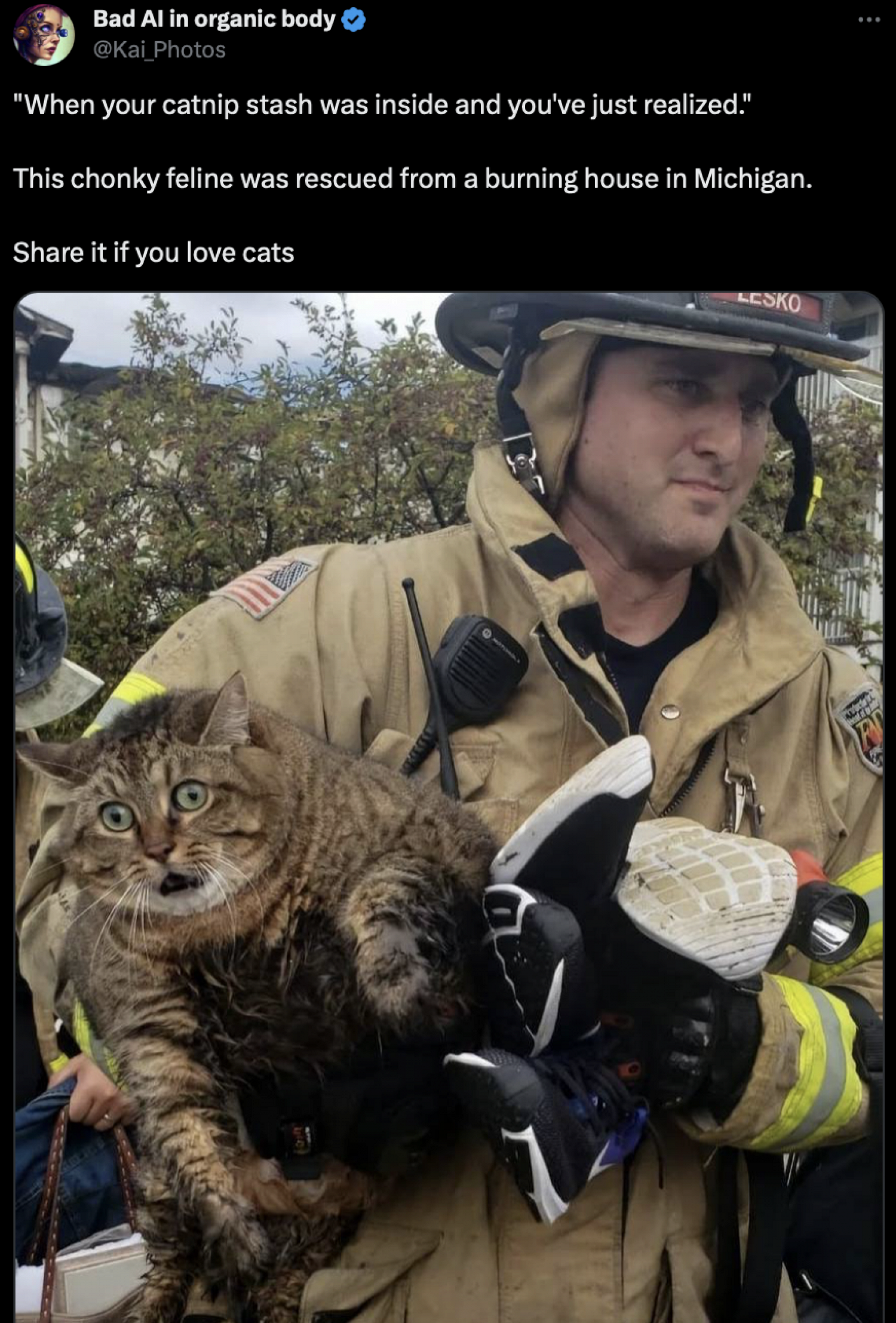 В начале октября в сети завирусился снимок с котом, которого пожарный вытащил из охваченного огнем дома. Питомец ярко отреагировал на свое спасение — его эмоция получилась настолько необычной, что пользователи теперь используют кадр как шаблон для мемов.
