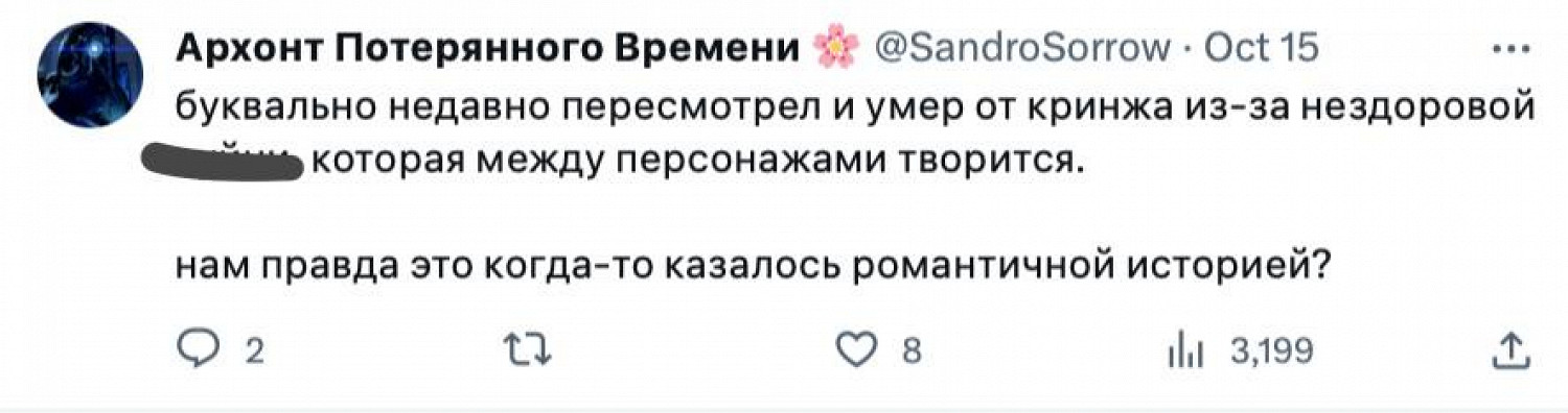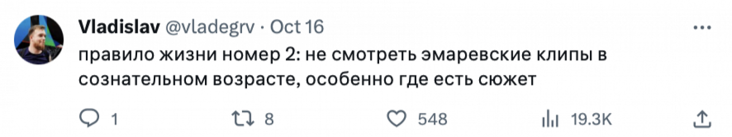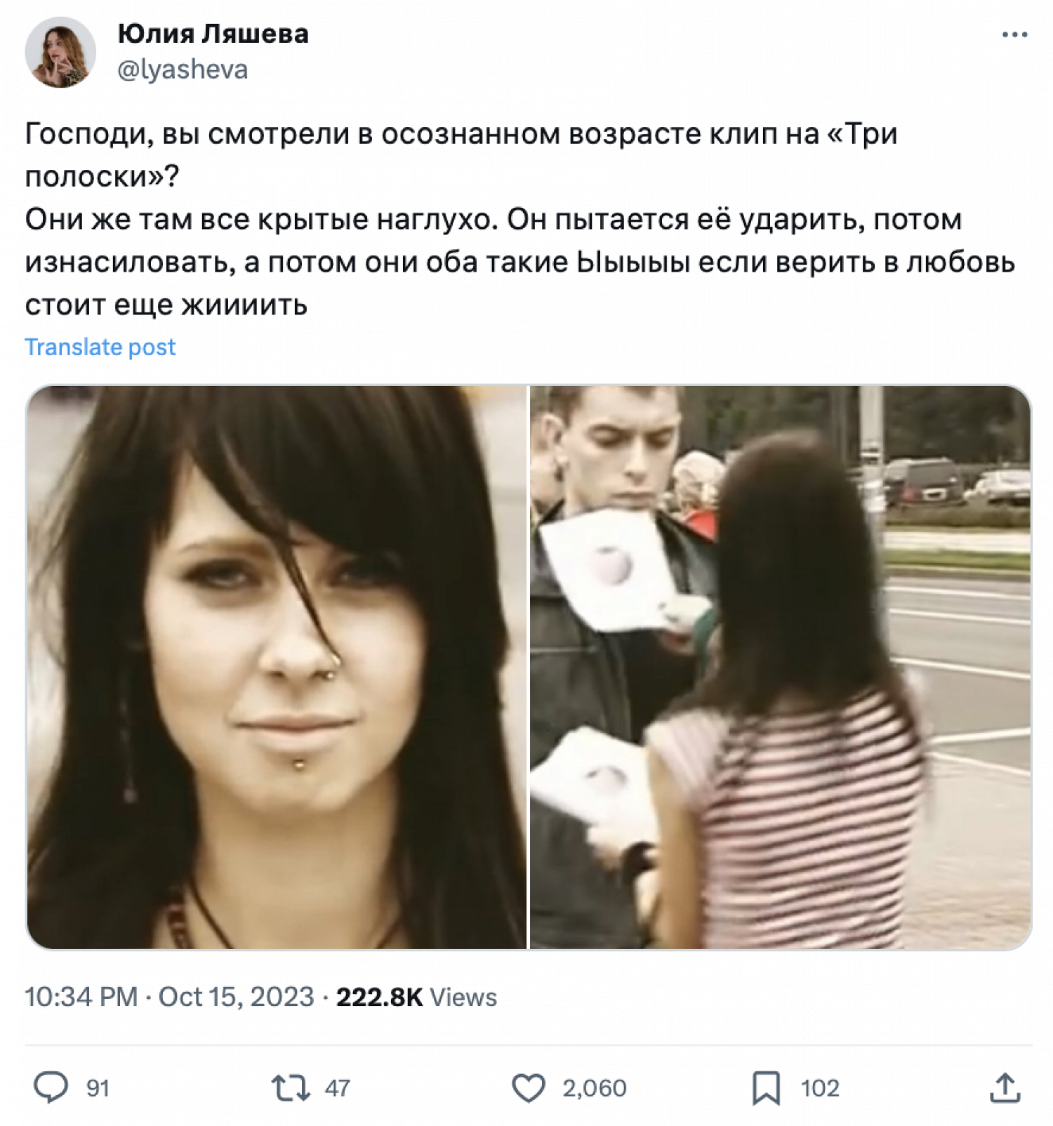 Пользовательница X (бывший Twitter) Юлия Ляшева (ник @lyasheva) решила пересмотреть клип группы «Animal ДжаZ» на песню «Три полоски» спустя почти пятнадцать лет после его выхода и неожиданно обнаружила, что по прошествии многих лет история из ролика воспринимается совсем иначе. Теперь в сети обсуждают нездоровые взаимоотношения персонажей.
