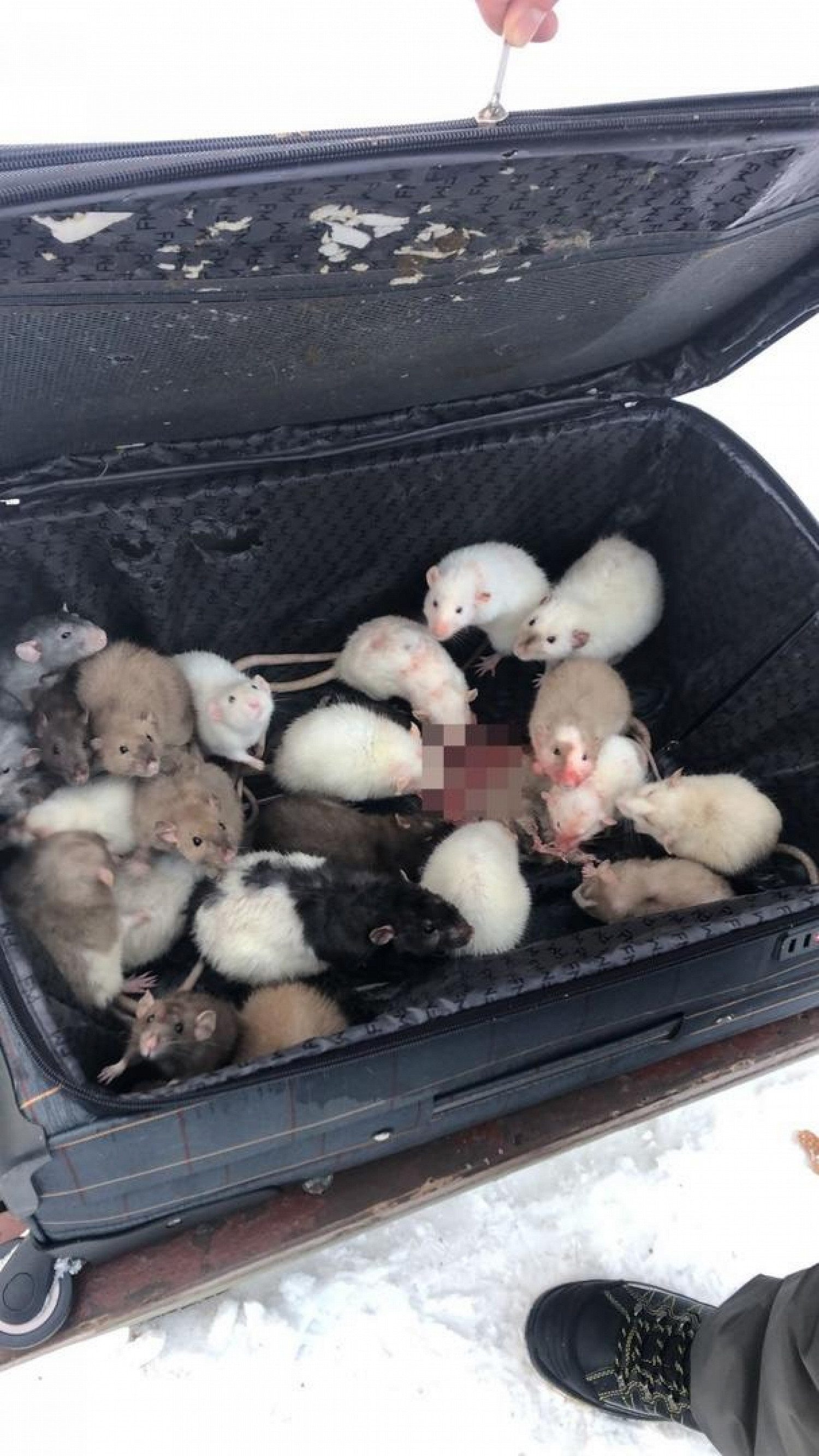 Чемодан заметили местные жители. В оставленной записке говорилось, что внутри белая крыса, но люди ей не поверили и вызвали полицию. Когда прибыл наряд, сумку все-таки открыли и увидели в ней множество грызунов. Хотя очевидцы предлагали закопать или утопить чемодан, полицейские обратились к волонтерам.