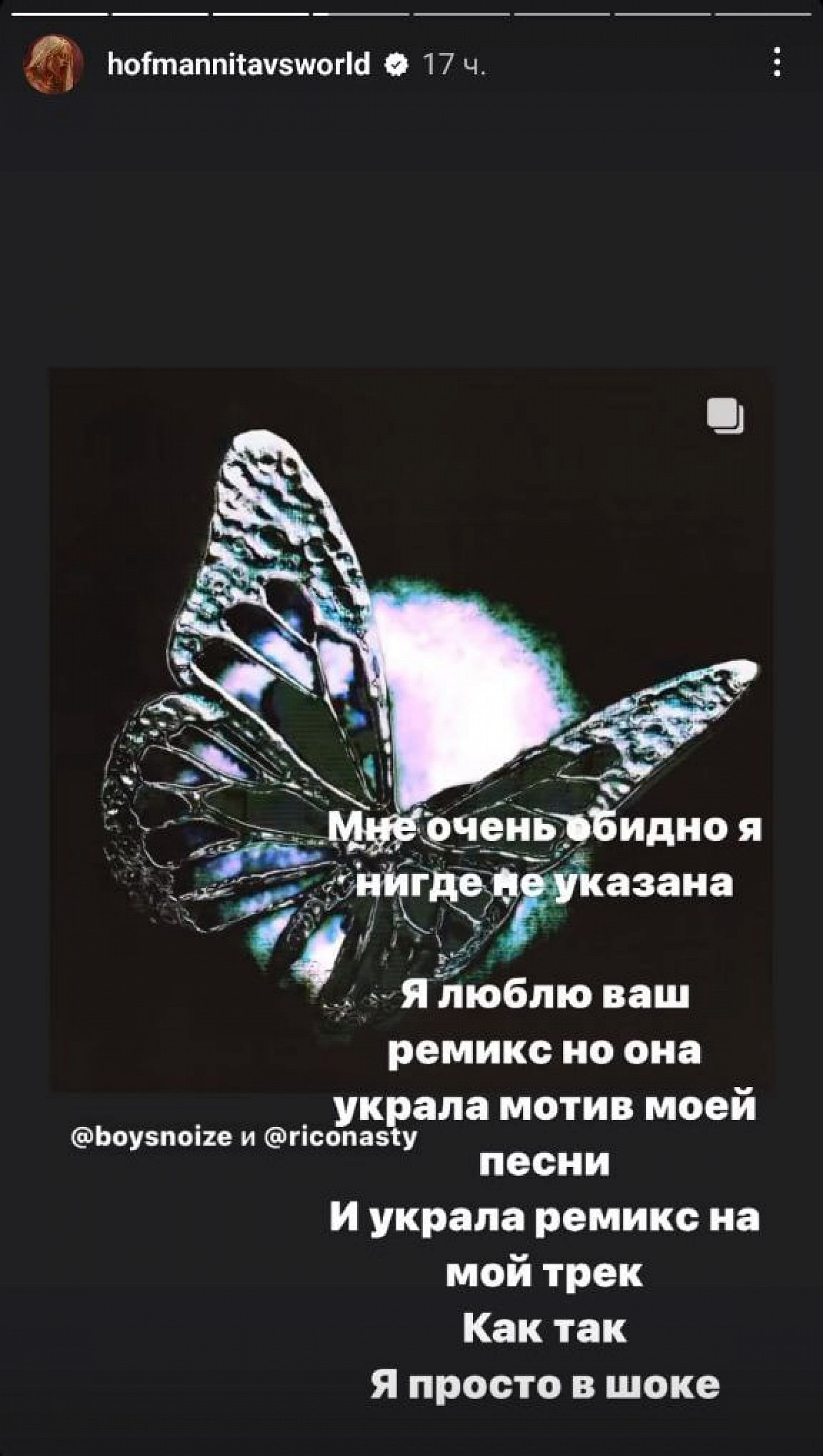 В сторис Hofmannita выразила недовольство точнее. Обращаясь к Rico Nasty, она написала: «Мне очень обидно, я нигде не указана. Я люблю ваш ремикс, но она украла мотив моей песни. И украла ремикс на мой трек. Как так? Я просто в шоке. Rico Nasty, ты поешь, точь-в-точь как я».
