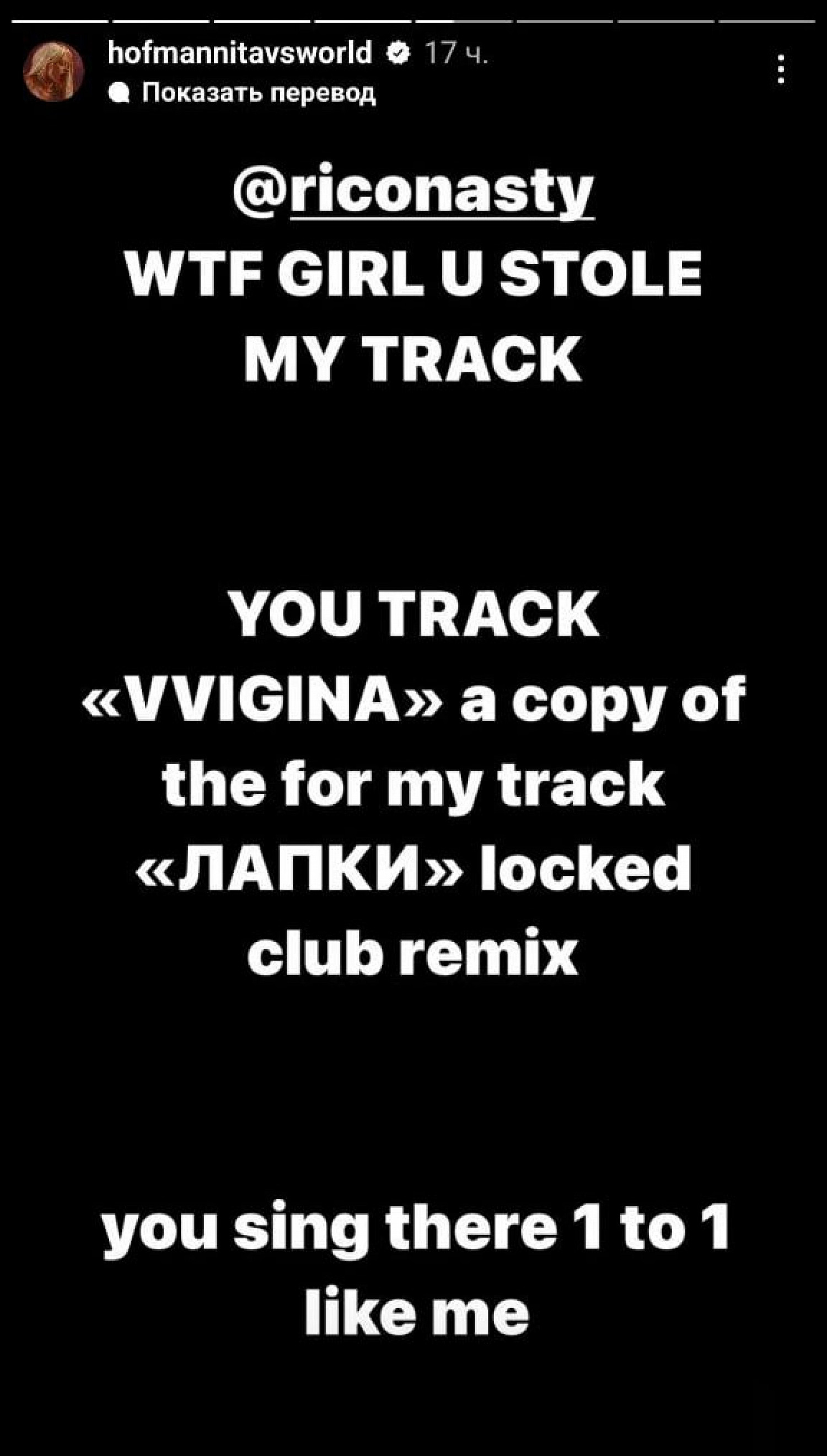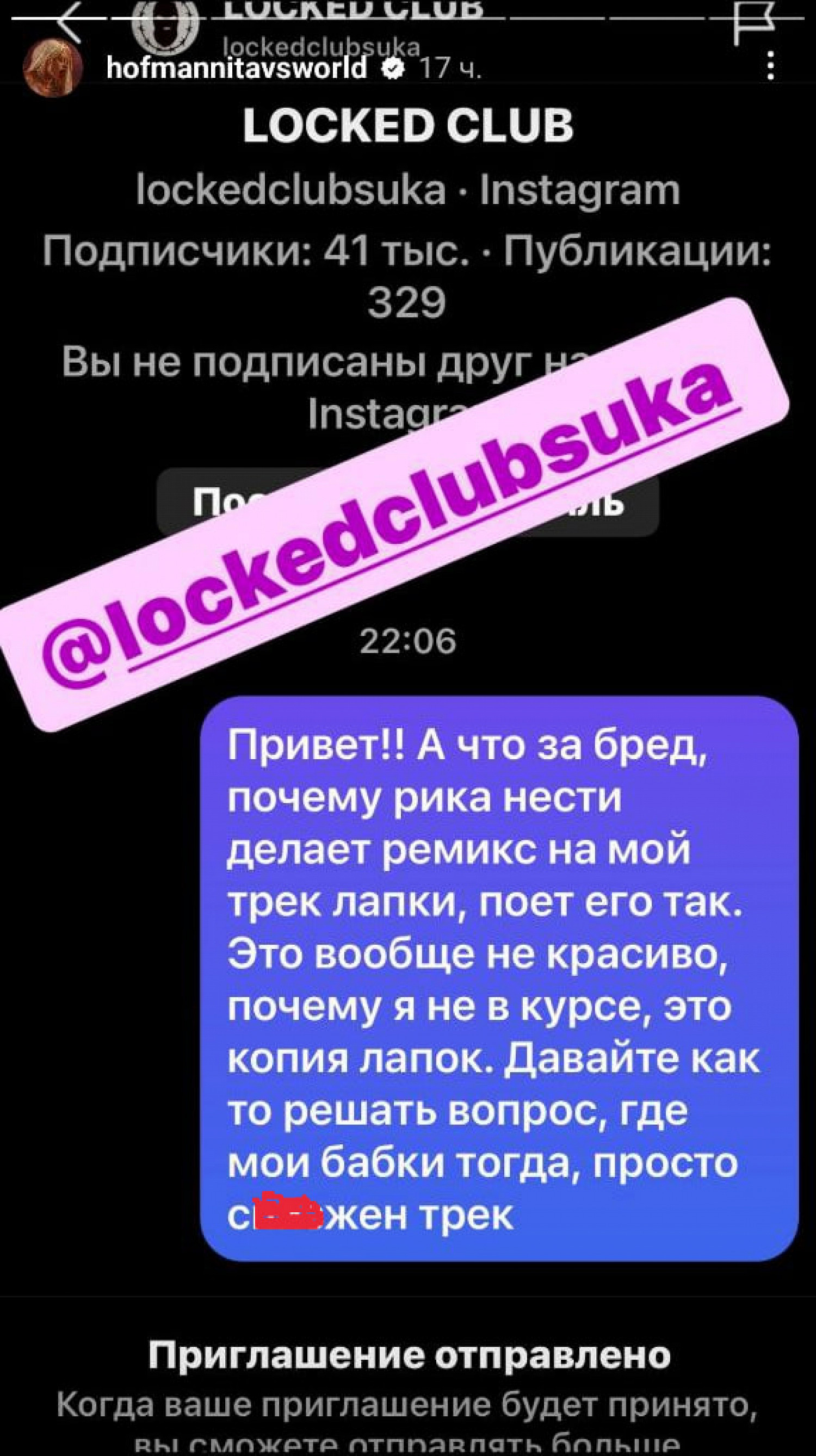 Также артистка отметила аккаунт Locked Club и оставила ему сообщение: «Привет! А что за бред, почему Рика Насти делает ремикс на мой трек „Лапки“, поет его так. Это вообще некрасиво, почему я не в курсе, это копия „Лапок“. Давайте как‑то решать вопрос, где мои бабки тогда, просто ******* [украден] трек».