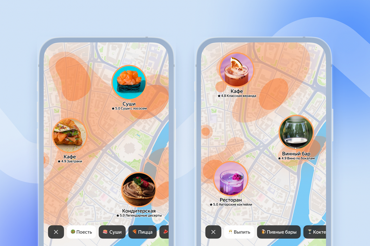 На карте города подсвечены области с местами, которые могут понравиться пользователю: чем подсвеченная область ярче, тем больше там рекомендаций. Пока что «Идеи» подсказывают бары, кафе и рестораны, а в будущем появятся салоны красоты, парки и музеи.