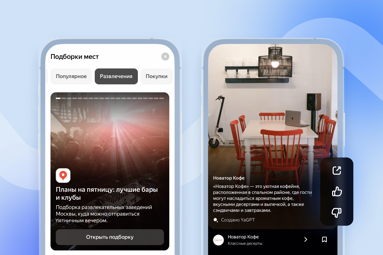 У каждого места на карте есть фотография и подпись, созданная YandexGPT. Подпись объяснит, почему пользователя может заинтересовать заведение (например, потому что похоже на любимый ресторан), или кратко скажет о главном — что в кофейне классные завтраки, а новый бар набирает популярность. А если в рекомендациях попалось кафе, которое пользователь посещал и высоко оценил, ему могут напомнить, что он давно туда не заглядывал.