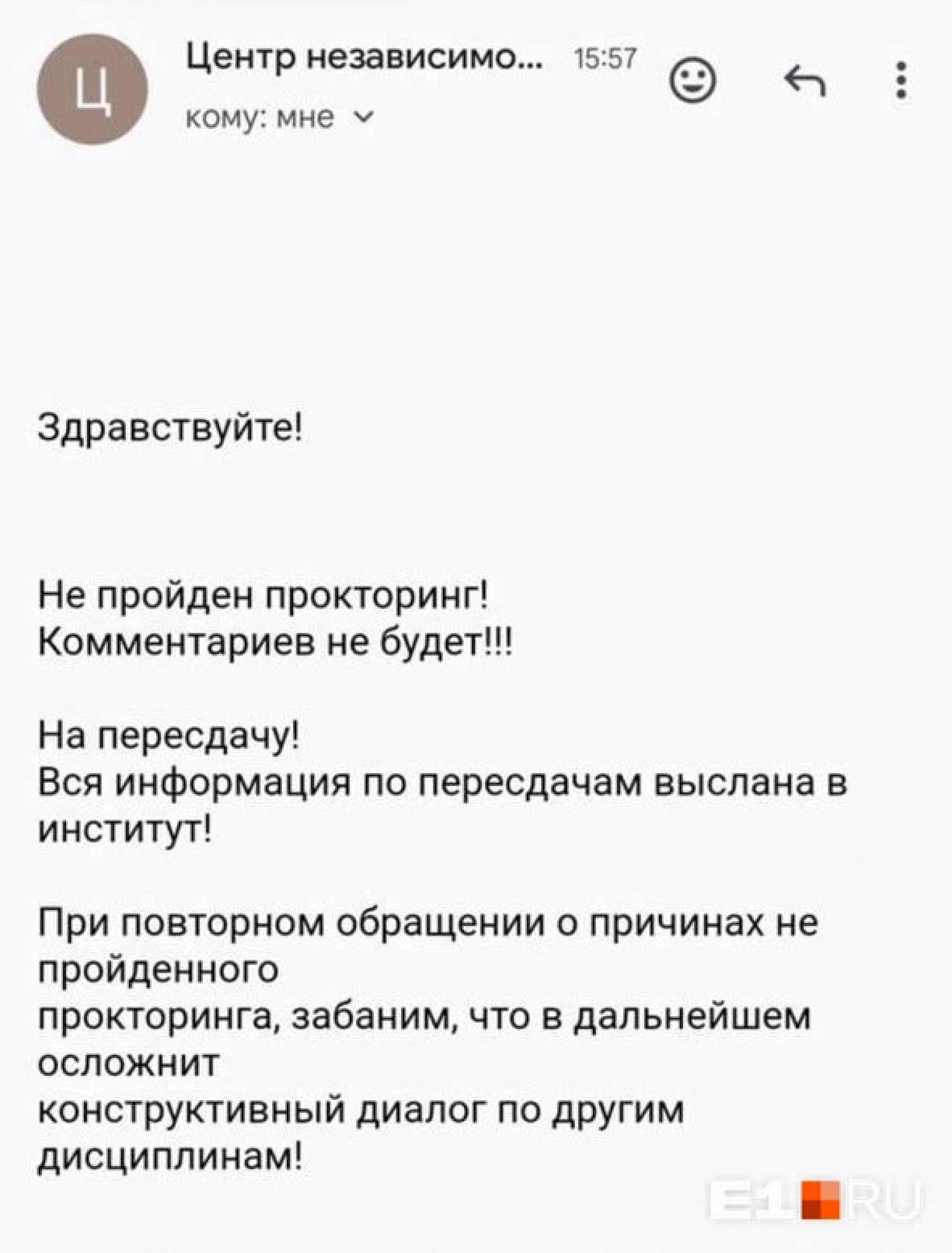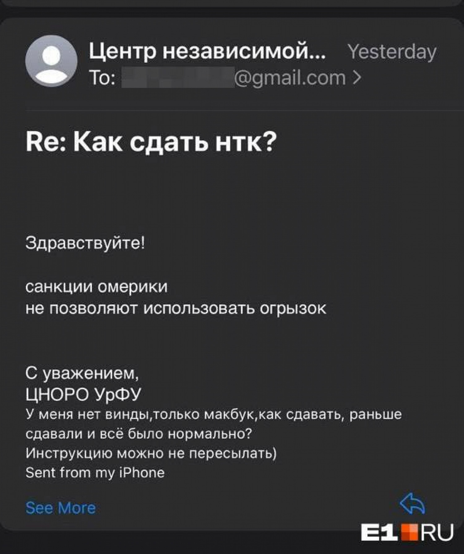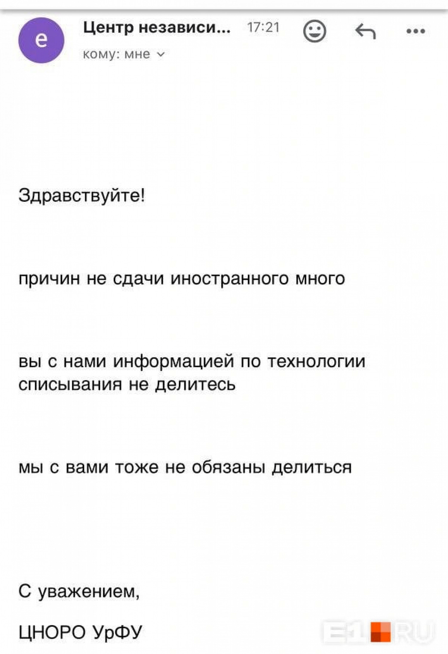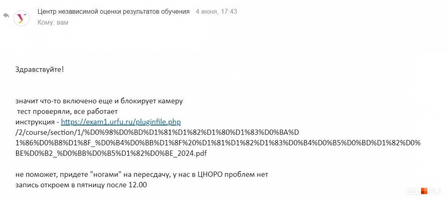 Они передали журналистам несколько электронных писем от представителей центра. В них — угрозы забанить, отказ от комментариев и обвинения в списывании. Одному из учащихся на вопрос о том, почему владельцам макбуков вдруг запретили сдавать экзамен, написали: «санкции омерики не позволяют использовать огрызок».