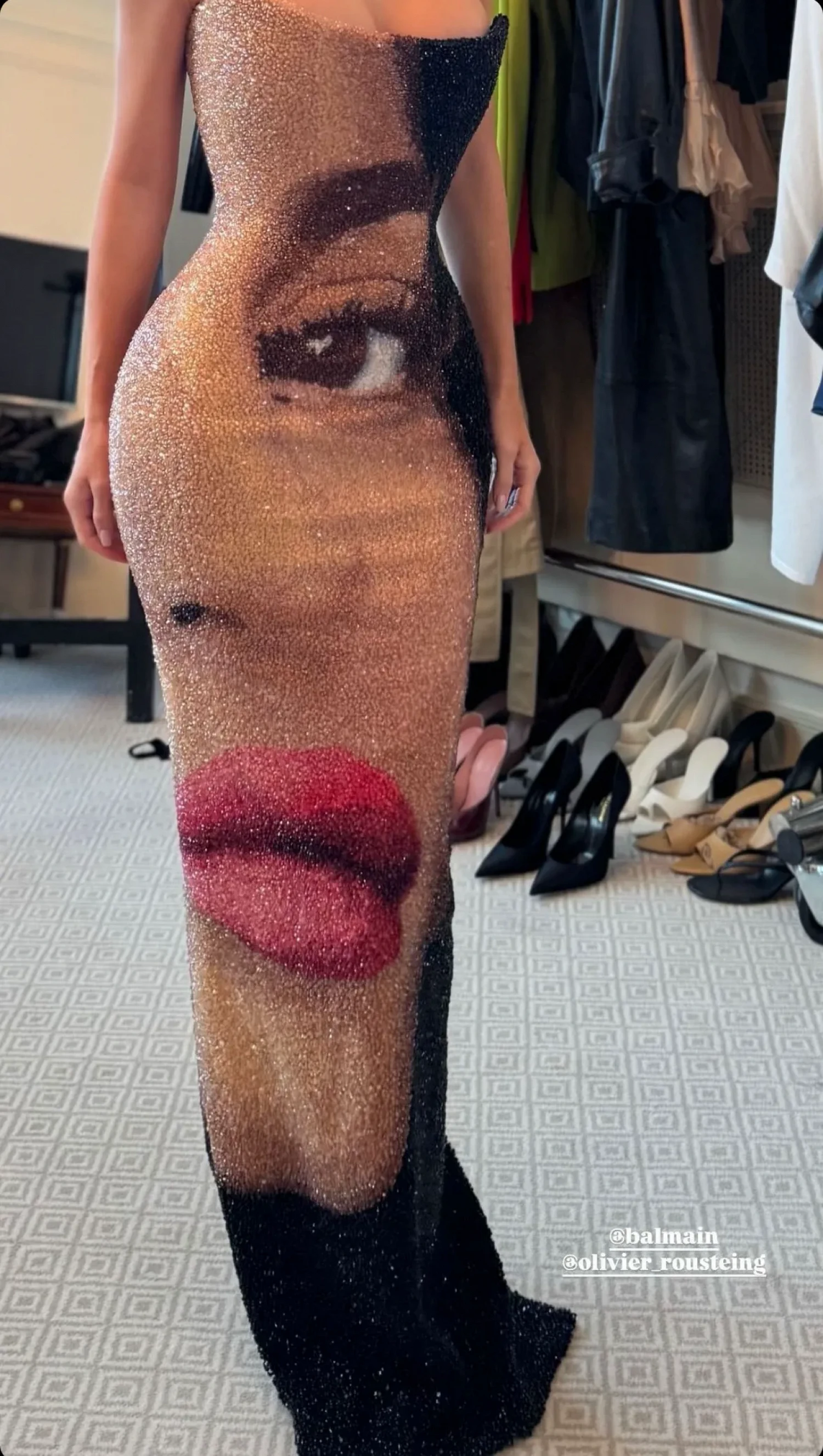 Наряд Дженнер показала в своем инстаграме*. Платье-футляр из перламутровых бусин и без бретелек создал ведущий дизайнер бренда Balmain Оливье Рустен. Изображение лица девушки повторяет изгибы платья.