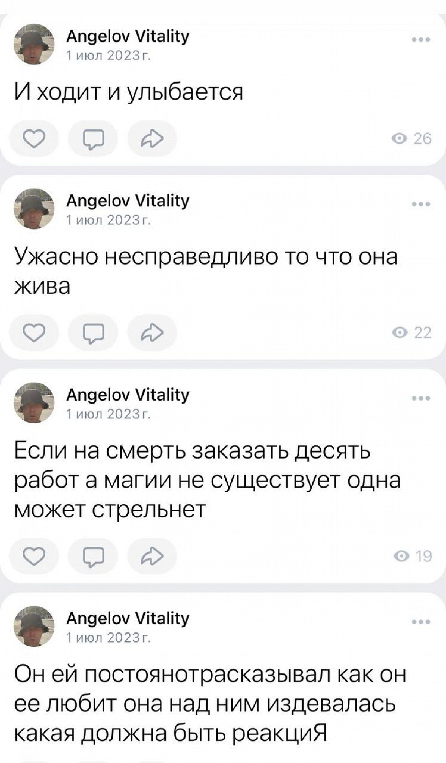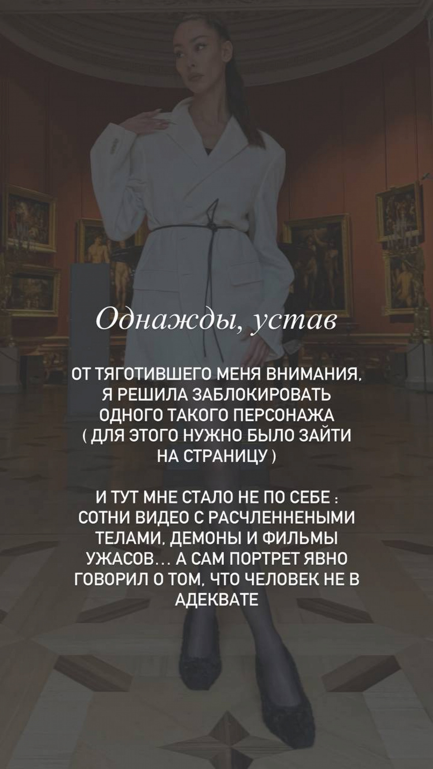 Девушка призналась, что ей было жалко сталкера и, пока тот не «пошел в офлайн», она не хотела обращаться к правоохранителям, хотя мужчина и пугал ее. Стилистка отметила, что еще несколько лет назад увидела, что в соцсетях сталкер публиковал «сотни видео с расчлененными телами, демонами и фильмами ужасов».
