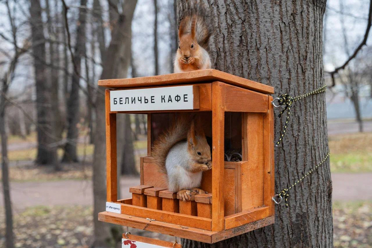 В московском парке Горького появилось «Беличье кафе». Сотрудники парка смастерили для белок новые кормушки, которые помогают пище не отсыреть и затрудняют доступ птицам.