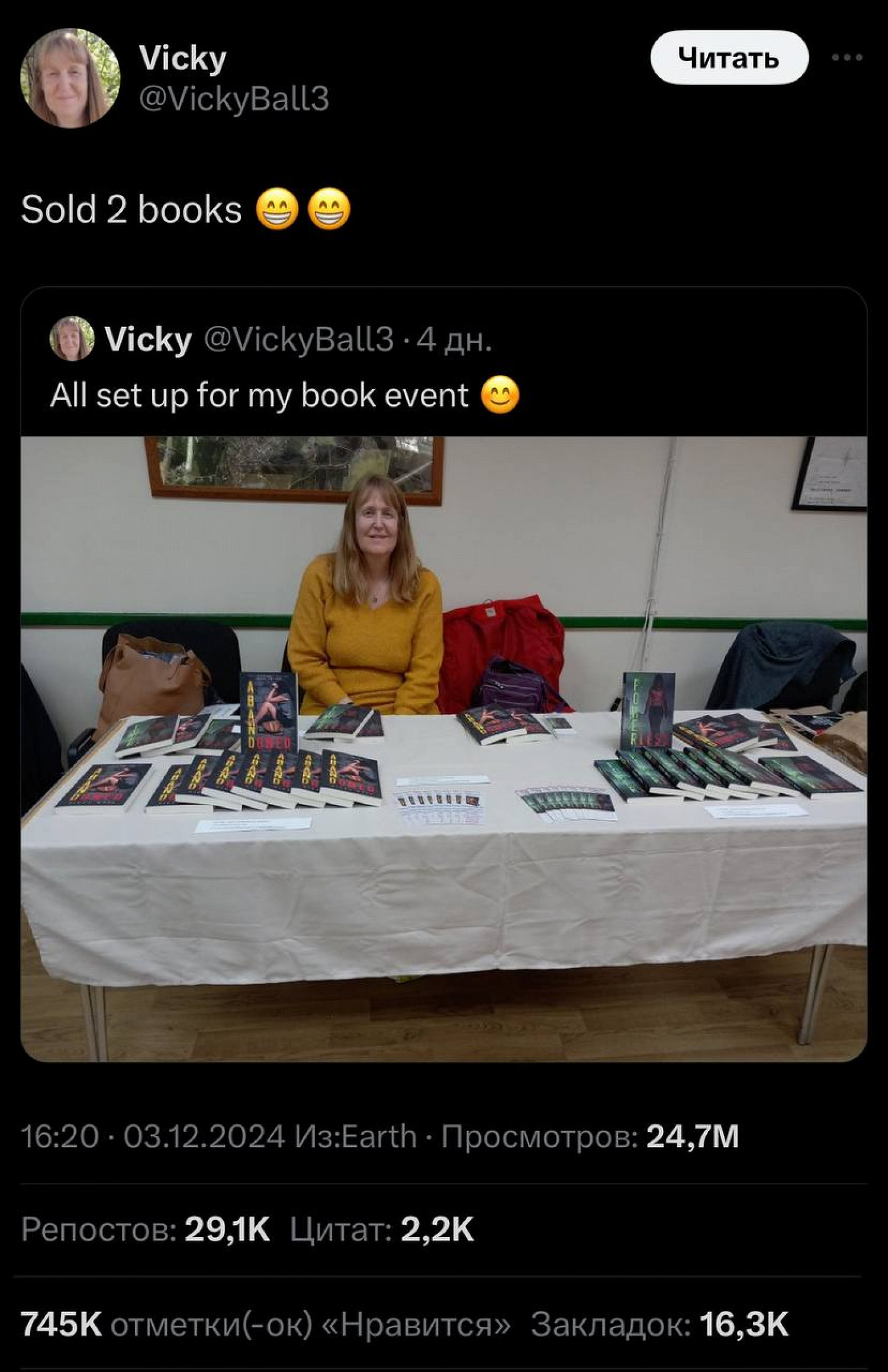 48-летняя жительница Колчестера написала два романа — «Беспомощность» и «Покинутая», — которые представила на встрече писателей в Челмсфорде. После этого женщина написала на своей странице в X: «Продала 2 книги 😁😁». Она отметила, что для нее это успех, поскольку на других мероприятиях ранее ей не удавалось продать ни одной.