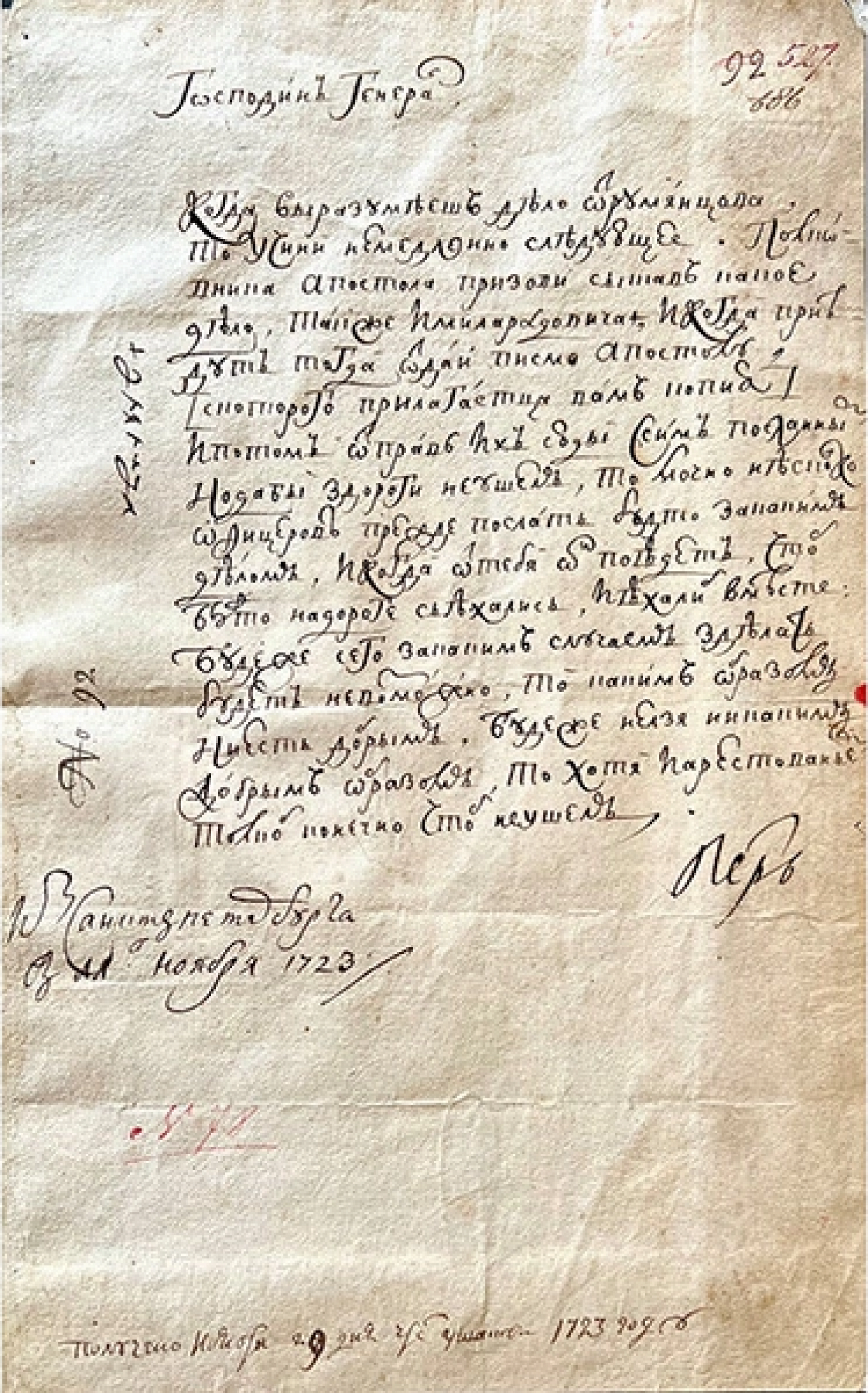 В конце октября в РГВИА сообщили о пропаже указа Петра II 1727 года об отстранении коменданта Санкт-Петербурга Фаменцына и назначении на его место князя Г.А. Урусова. Документ обнаружили на аукционе во Франции, там его продали более чем за 3000 евро.