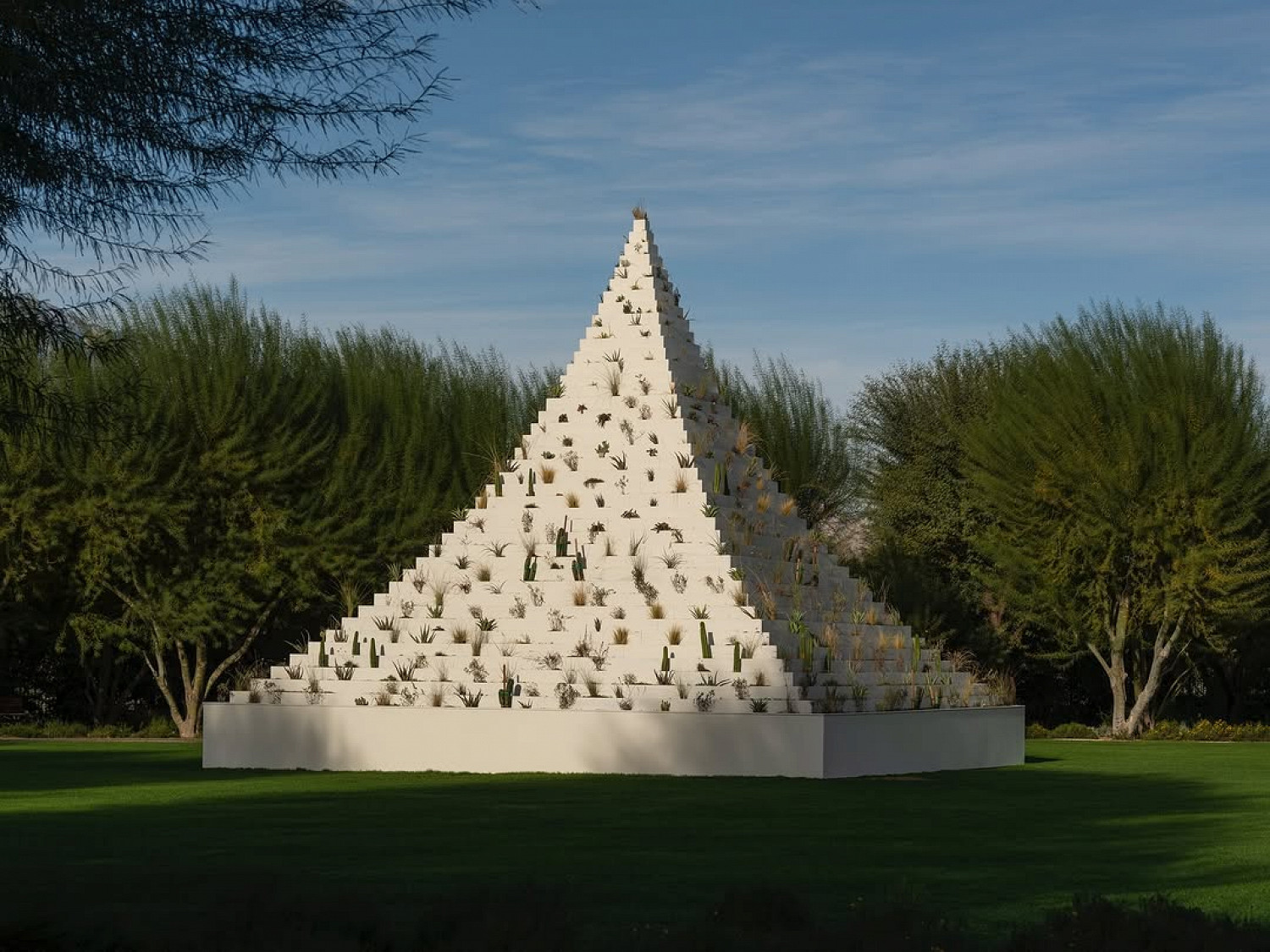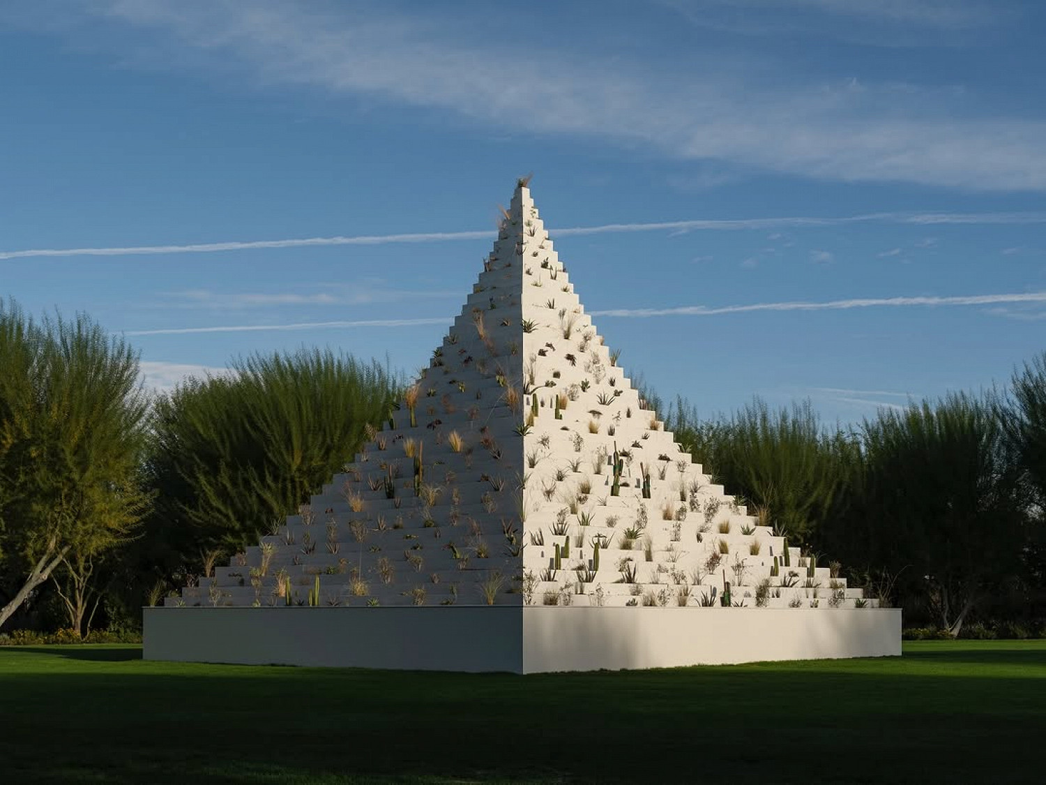 Они добавили, что в течение будущих шести месяцев инсталляция будет меняться. Растения прорастут, зацветут, дадут семена и погибнут, «демонстрируя взаимодействие между природой и культовой пирамидальной формой».