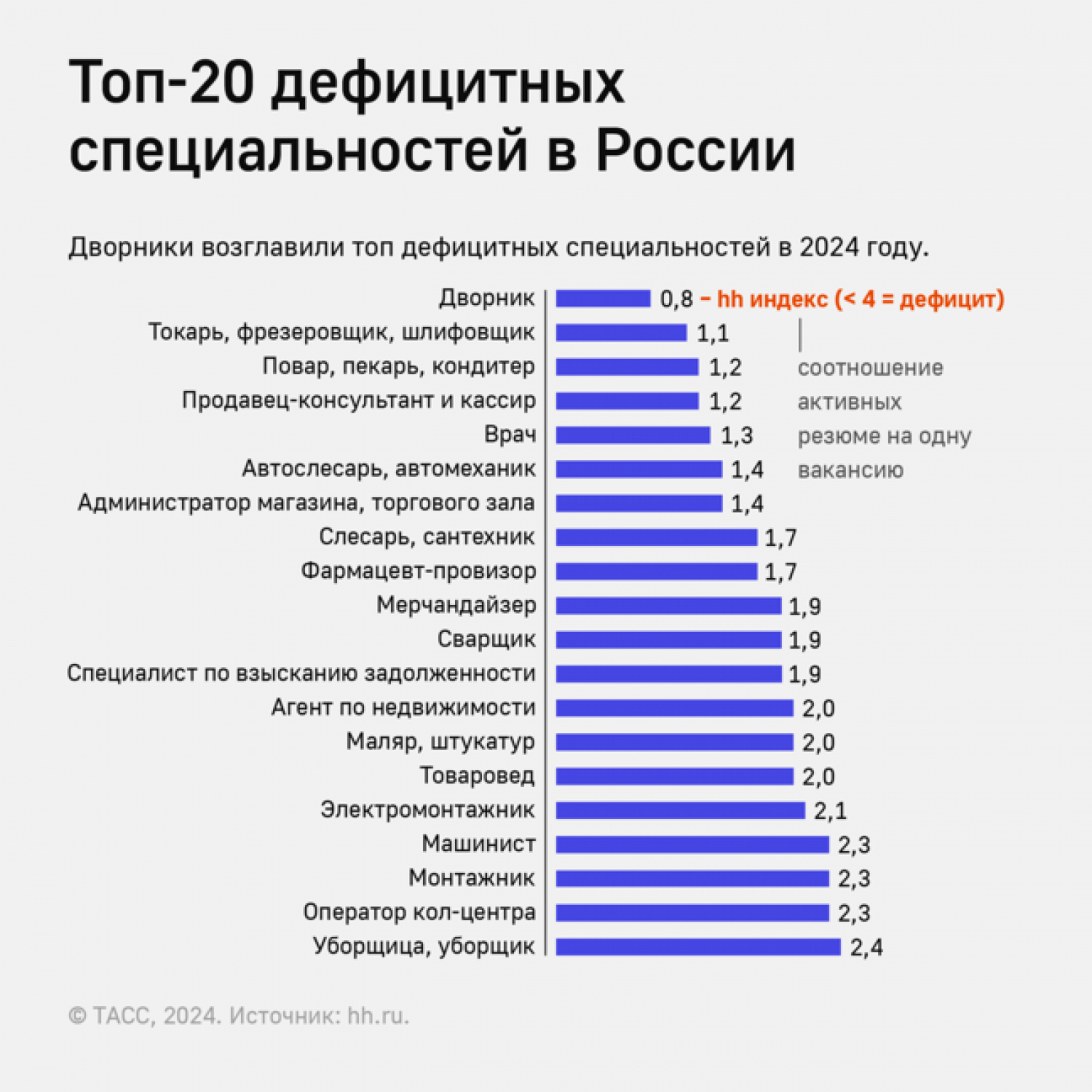 Эксперты проанализировали свыше 11 млн вакансий за последние 12 месяцев. Профессия дворника за это время переместилась с третьей строчки прошлогоднего топа на первую. Она также оказалась единственной, где число открытых вакансий превысило число желающих получить работу.