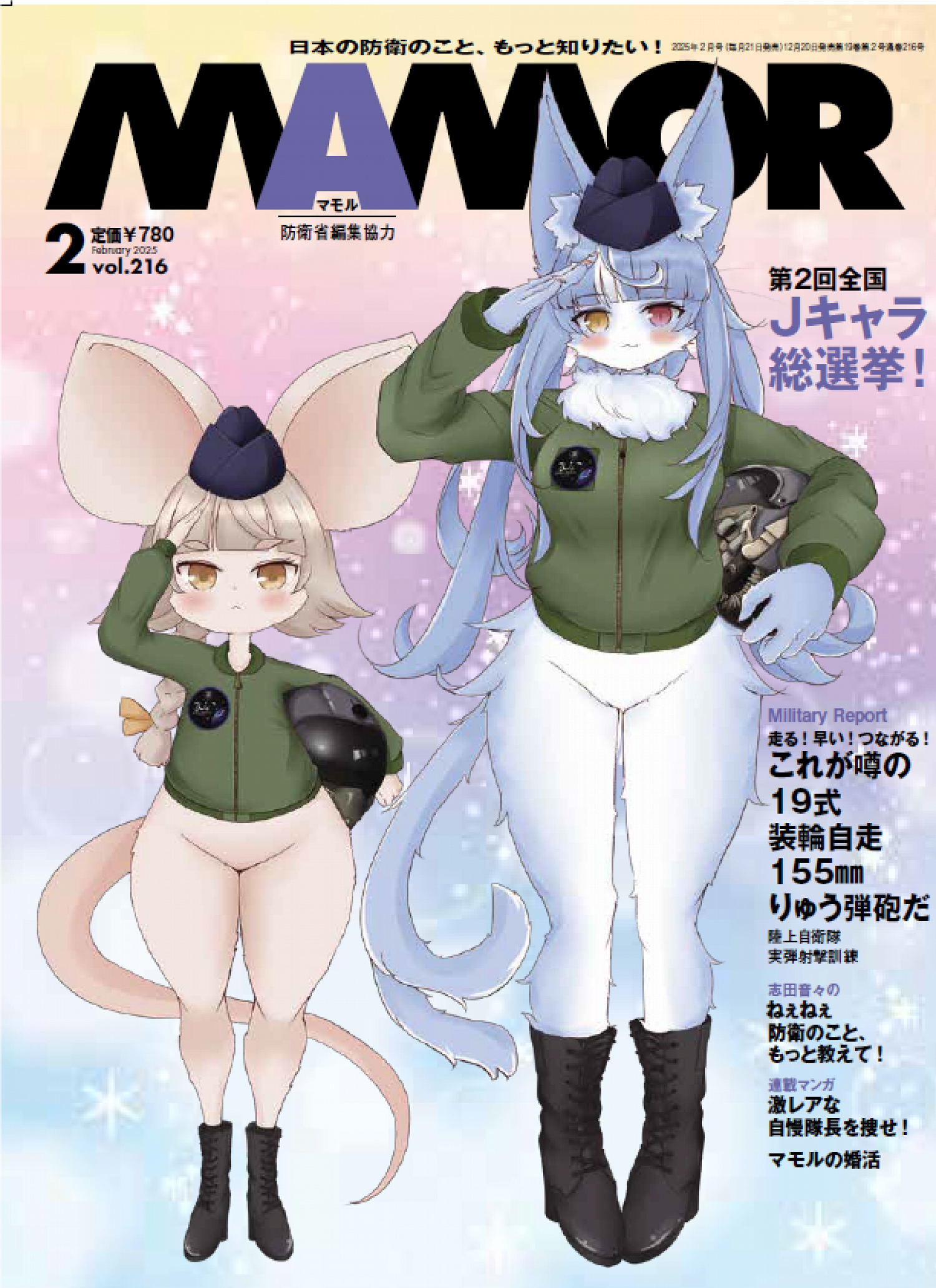 Обычно на обложку журнала MAMOR японская армия ставит своих служащих в форме. Но на этот раз выбор пал на официальных аниме-маскотов базы ВВС в городе Омаэдзаки ― кошку Оманэко и мышку Хаму ЧунЧун. Персонажей придумали в прошлом году, и они быстро развирусились в соцсетях, обретя популярность среди любителей фурри.
