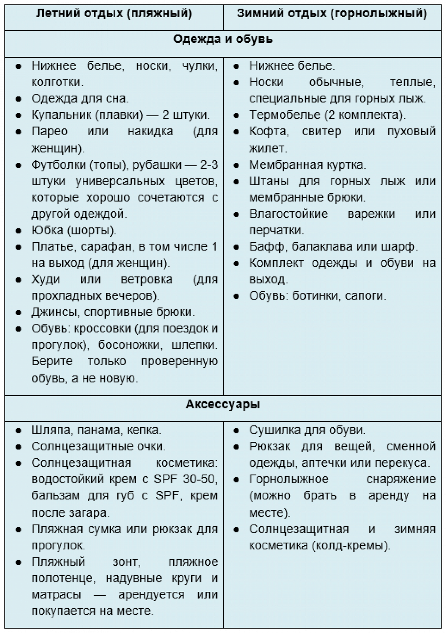 Мы составили чек-листы самого необходимого из одежды и аксессуаров с учетом вида отдыха и сезона. В приоритете легкая, удобная одежда из тканей, которые не сминаются и не требовательны к уходу. Собирать чемодан лучше всего по принципу капсульного гардероба: берем базовую одежду в количестве 5-10 вещей, которые прекрасно сочетаются между собой и подходят к обуви и аксессуарам.