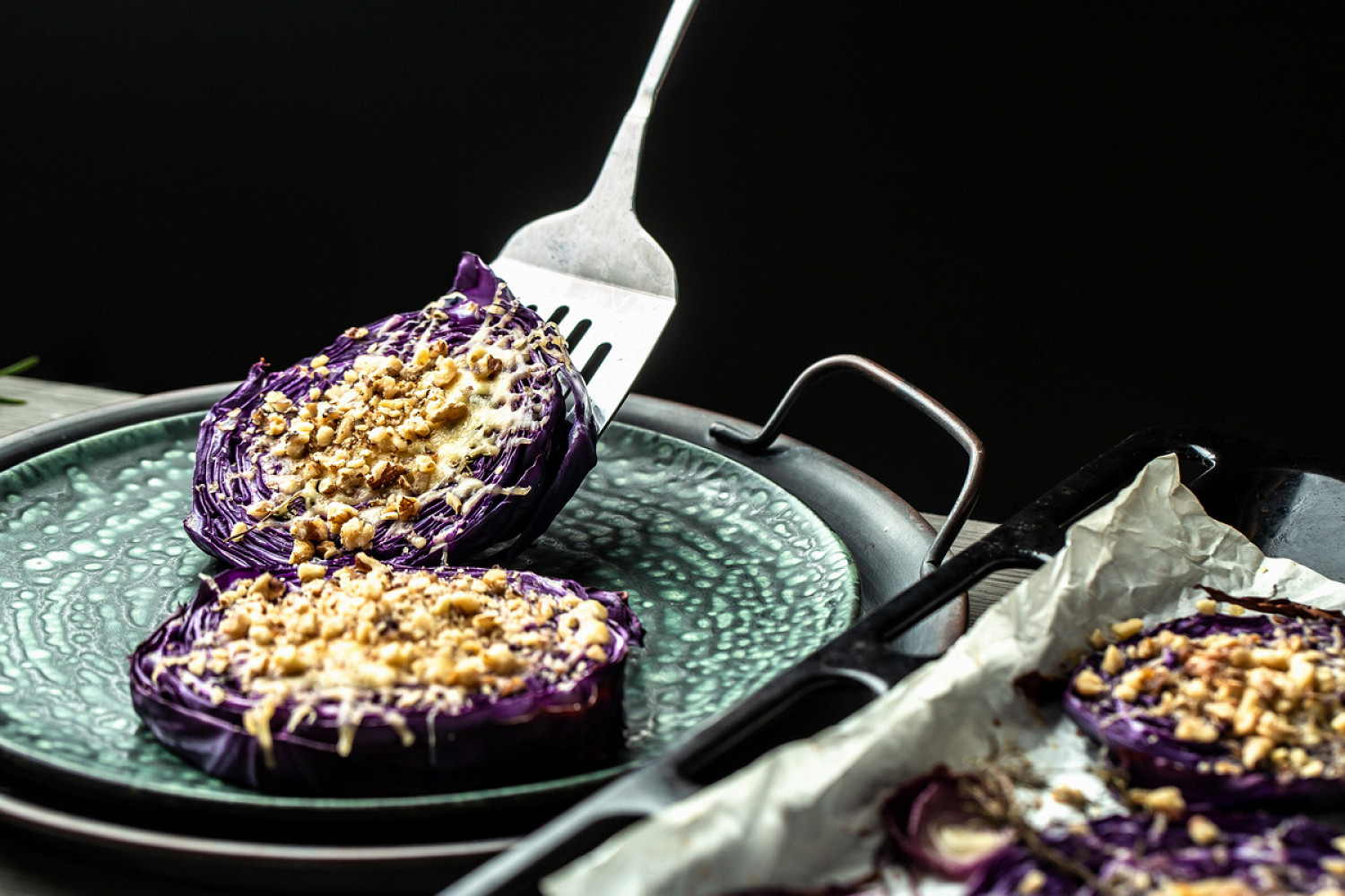 - Смазать капустные стейки этим маринадом, а поверх стейков выложить его остатки с нутом. Запекать при 220 градусах около 1 часа.