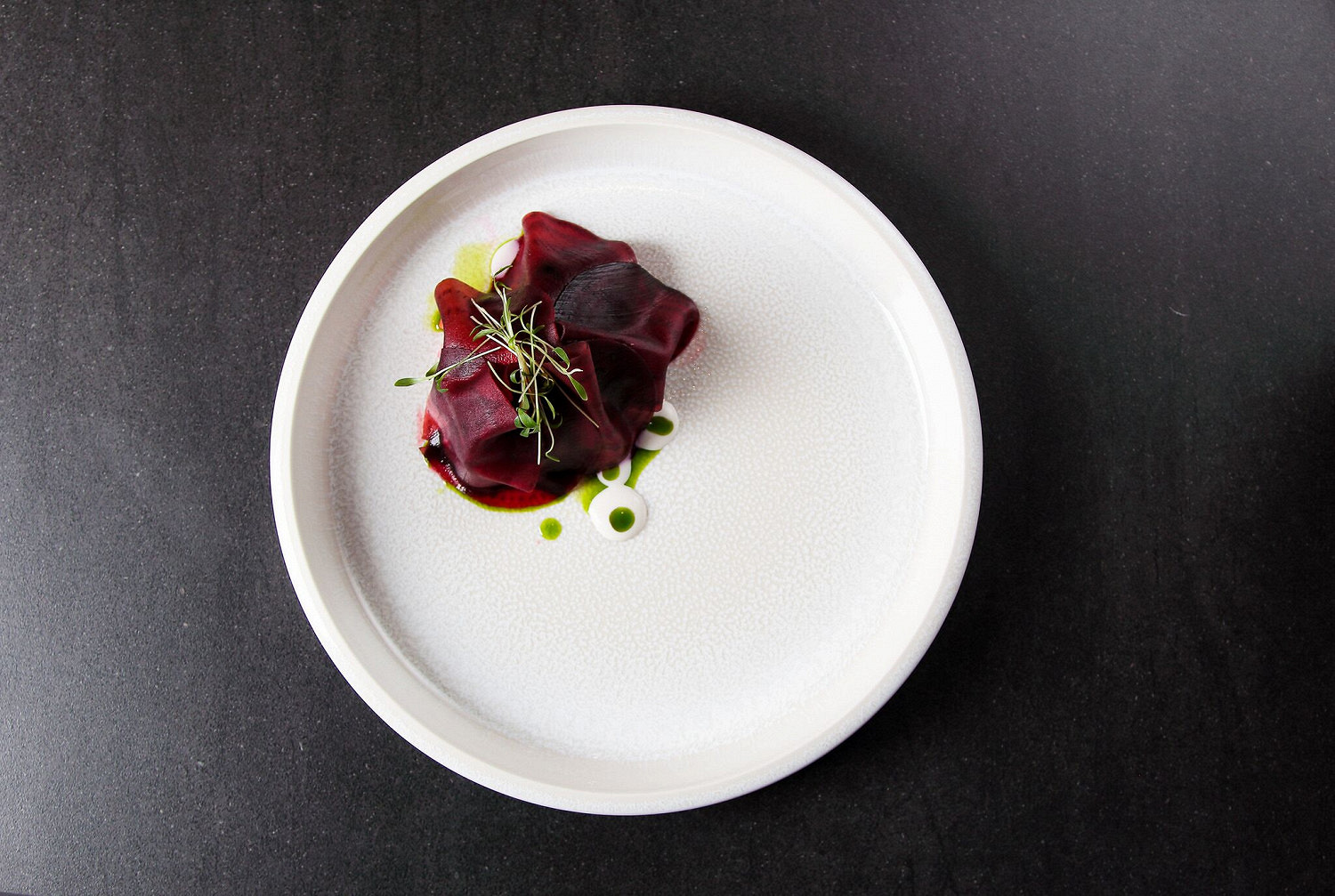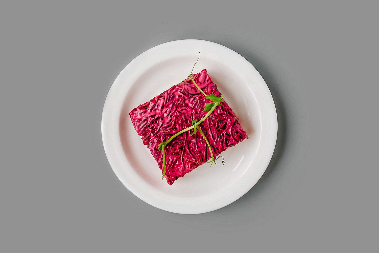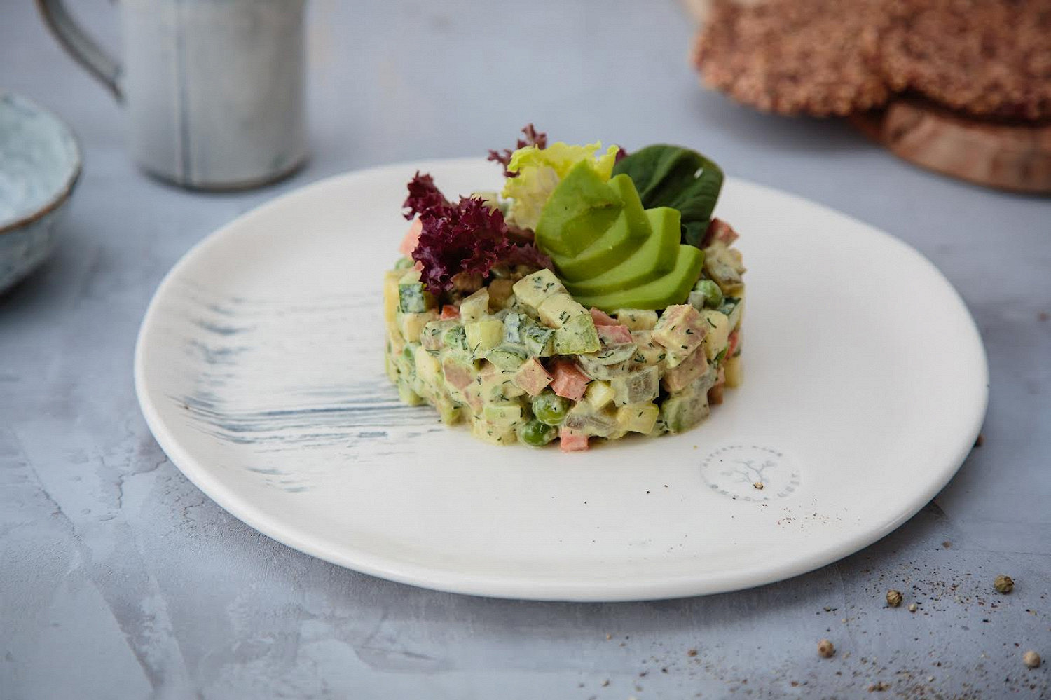 - Для сборки салата на дно тарелки выложить баклажан, добавить майонез, затем тартар из овощей и укрыть все это слайсами маринованной свеклы.